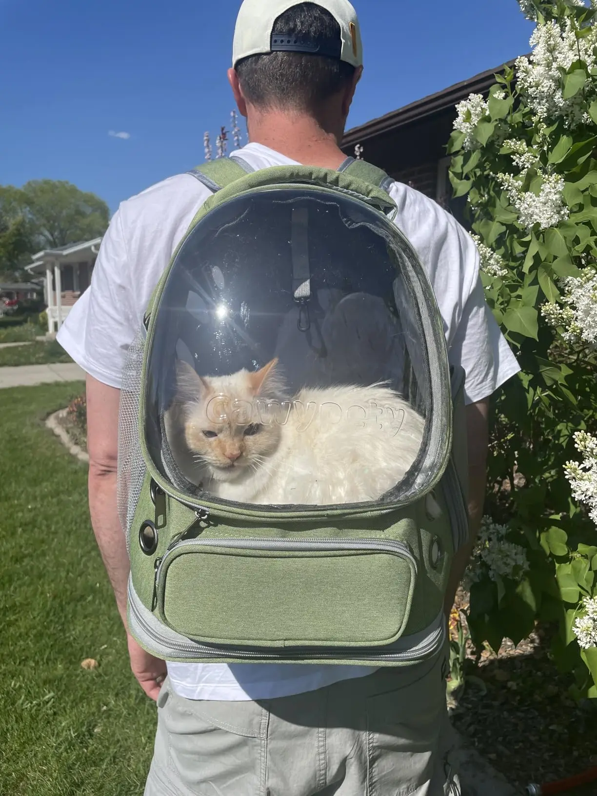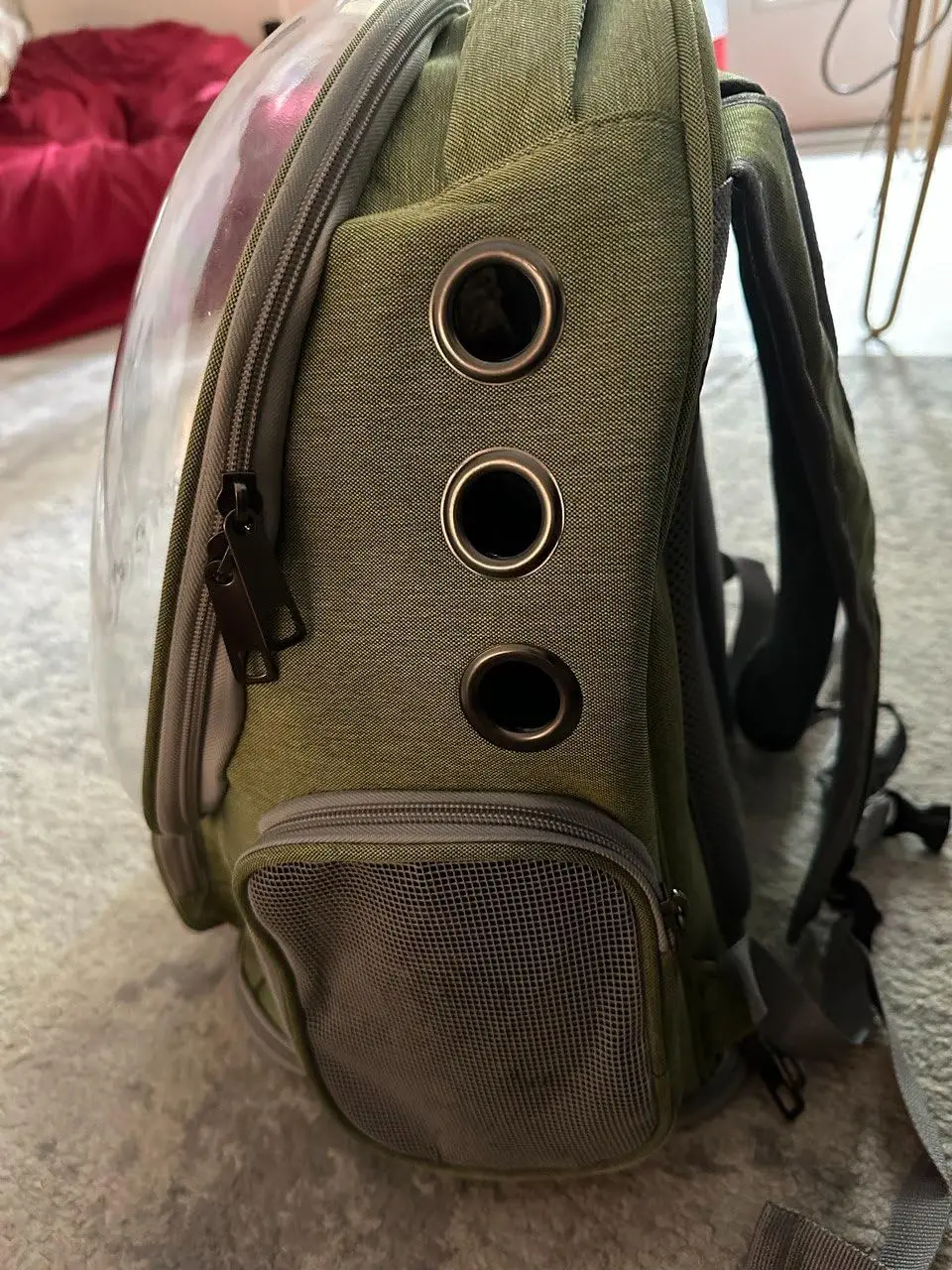 1. Diseño transparente, permite que su mascota vea la luz del sol y los paisajes del mundo exterior.Varios orificios de ventilación en el costado de la mochila brindan suficiente circulación de aire y hacen que su mascota respire cómodamente.