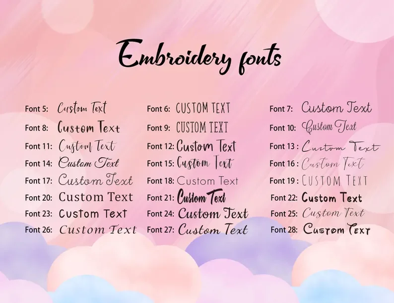 Debido a que cada pieza está bordada a medida, las devoluciones/cambios se limitan a problemas de mano de obra.Verifique dos veces la ortografía y las selecciones antes de realizar su pedido.