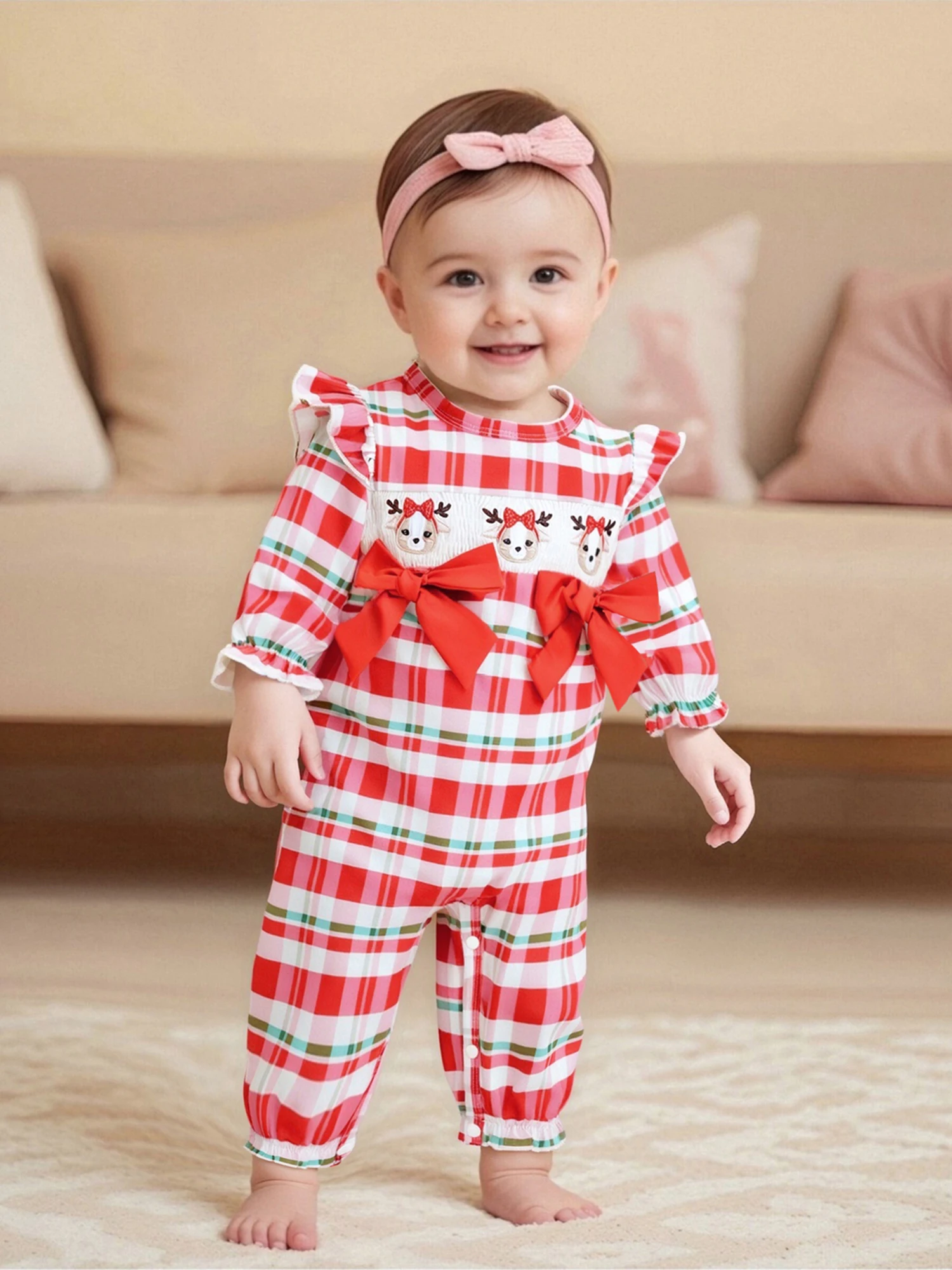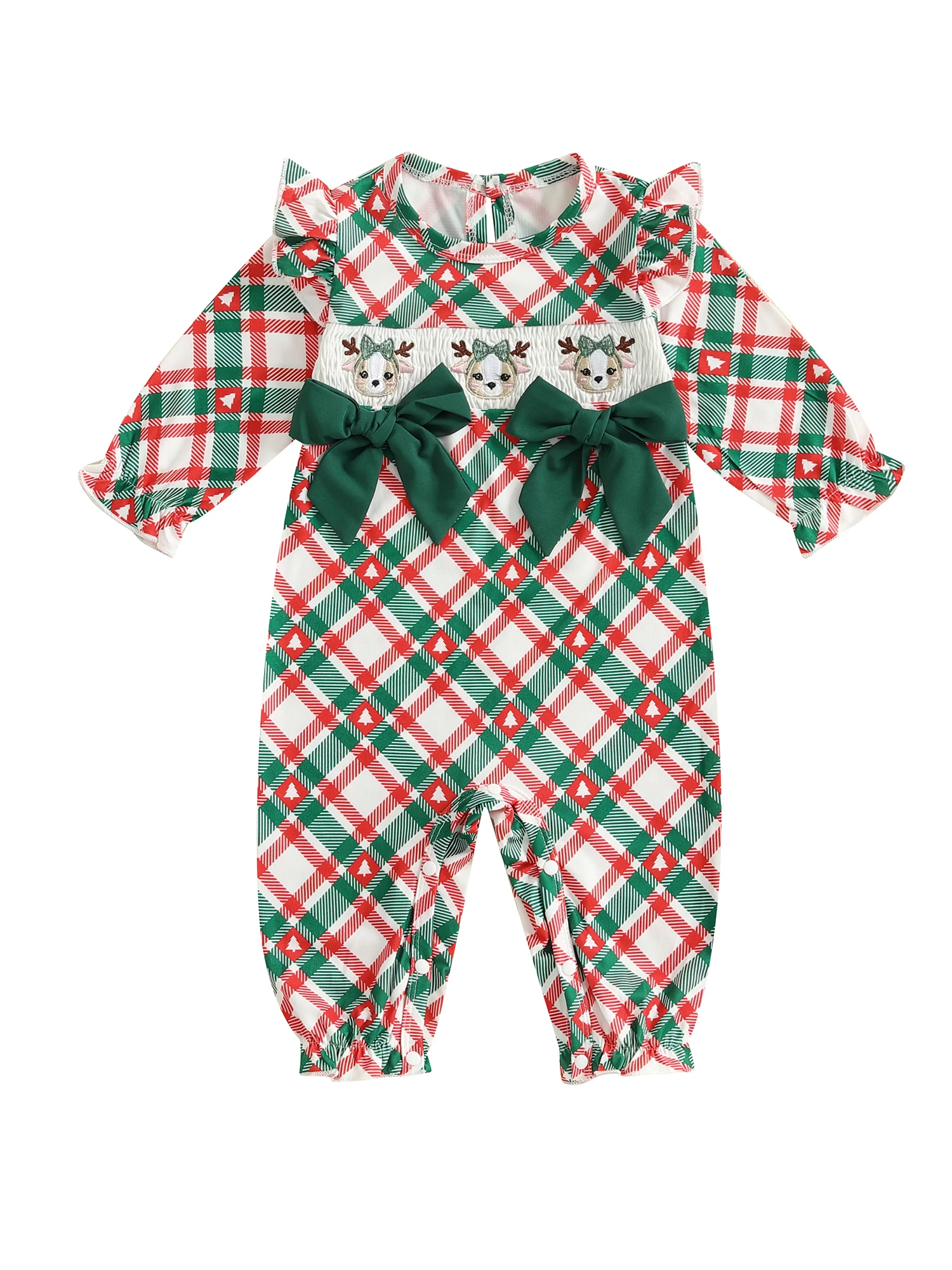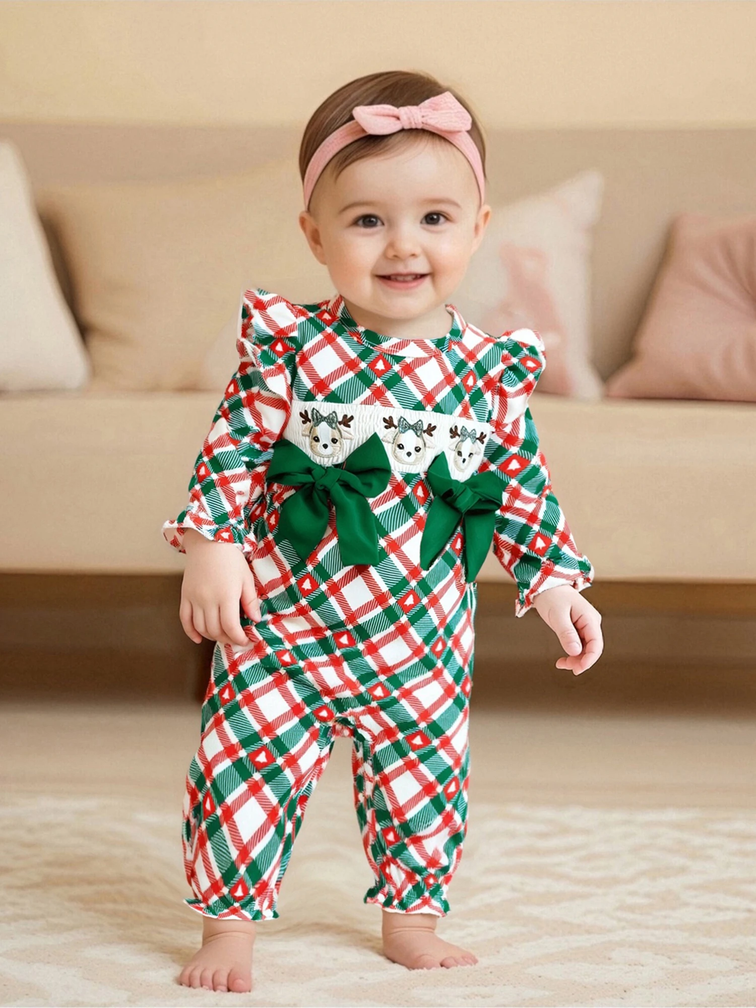 Baby Girls Jumpsuit, Long Sleeve Crew Neck Plaid Embroidery Elk Romper Christmas Clothes