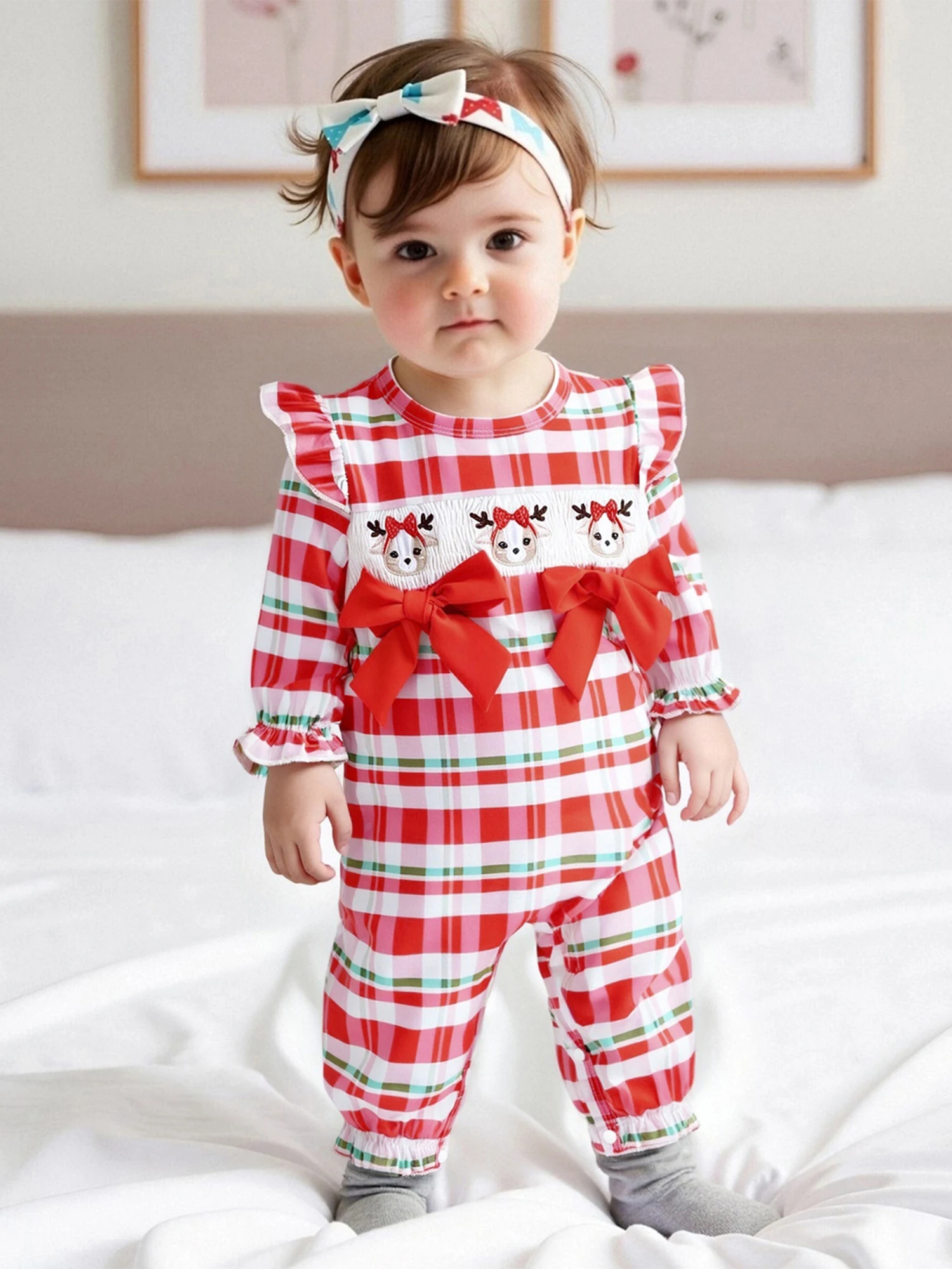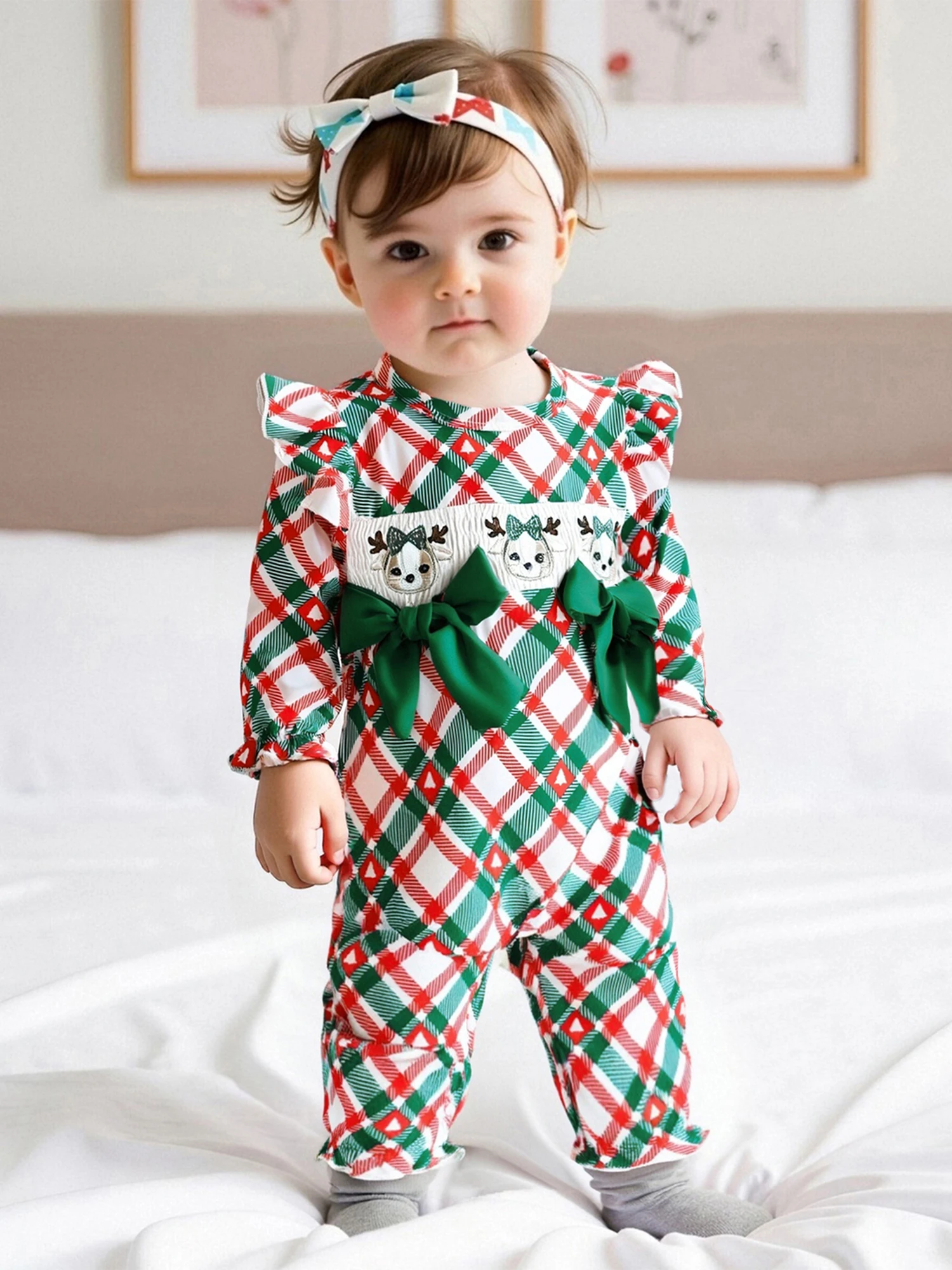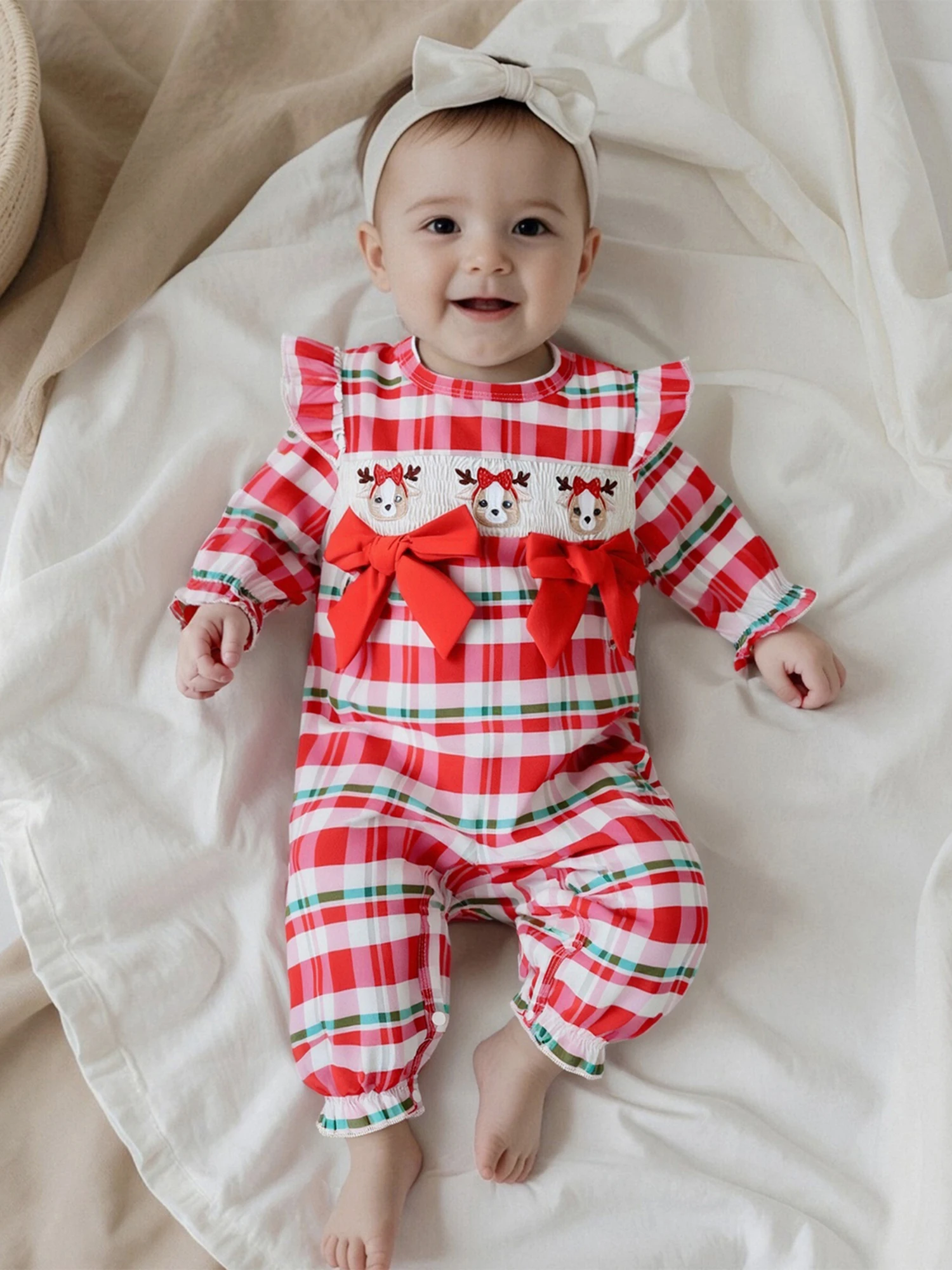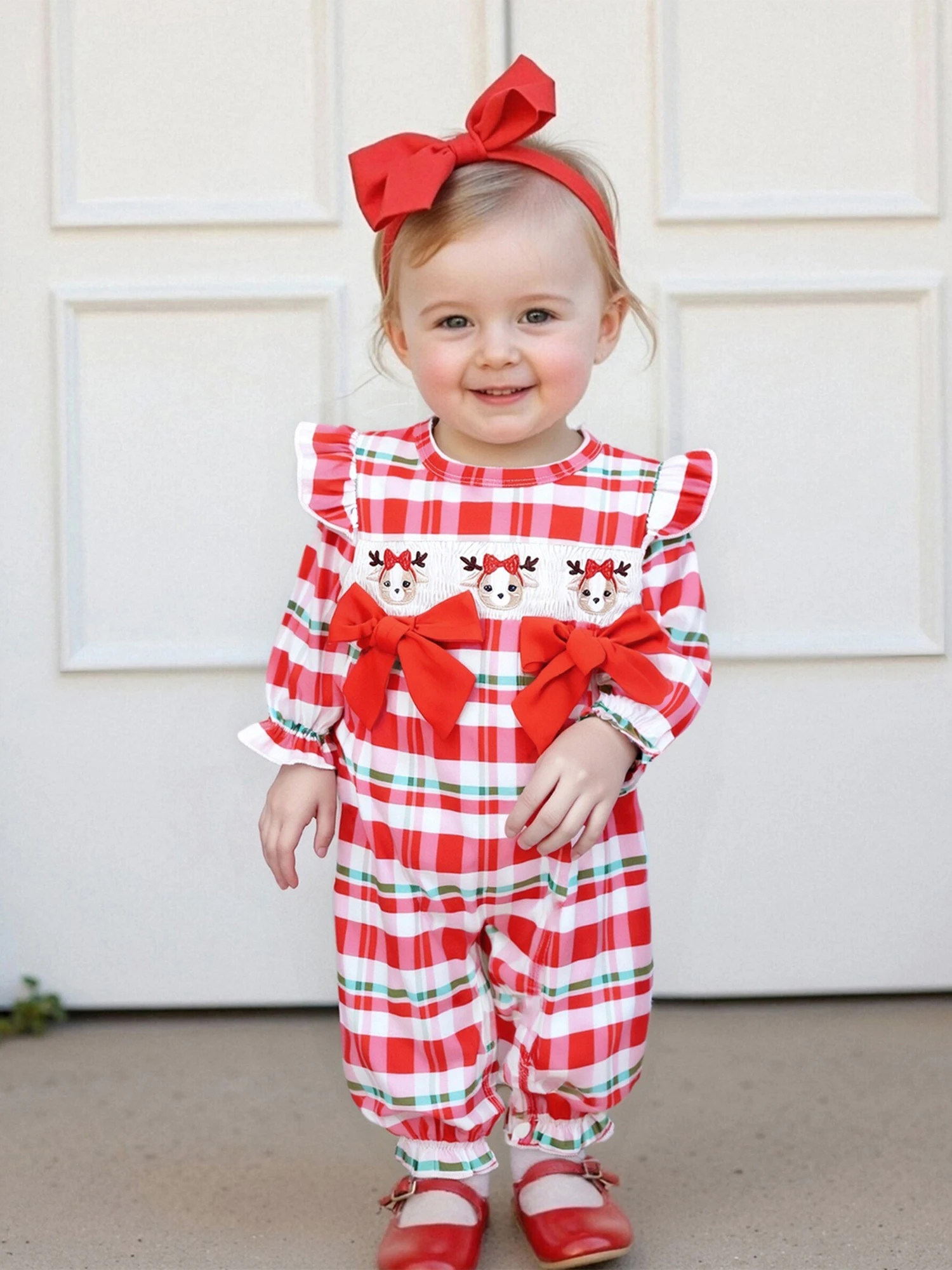 Baby Girls Jumpsuit, Long Sleeve Crew Neck Plaid Embroidery Elk Romper Christmas Clothes