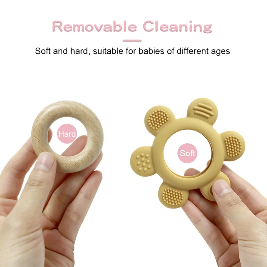 Comprar Mordedor de silicona para bebé, anillo de madera, juguetes de entrenamiento para masticar, artículos para bebé con forma de flor, accesorios de lactancia, 1 unidad