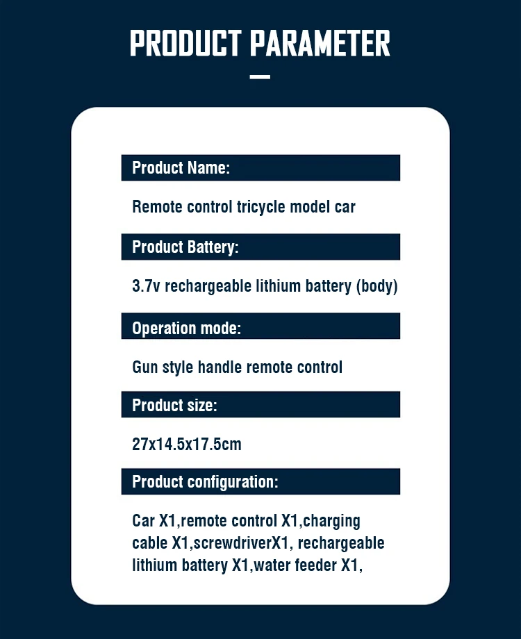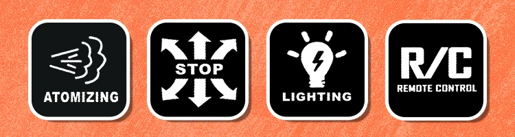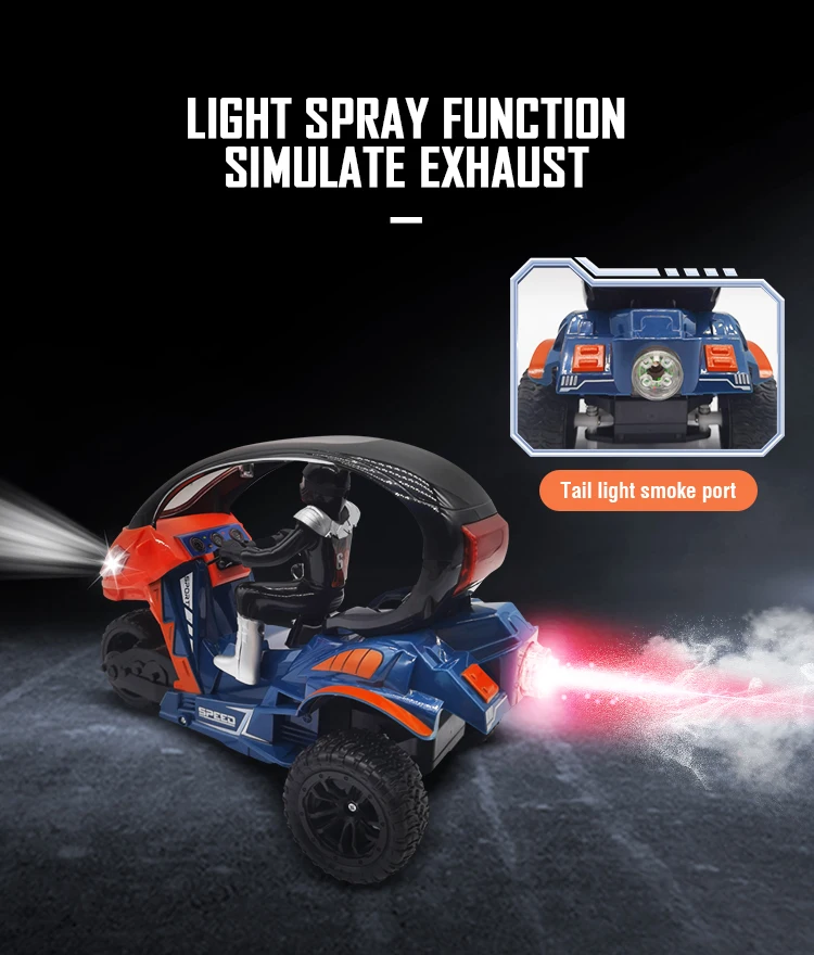 • Hacia adelante, hacia atrás, gire a la izquierda, gire a la derecha, presione hacia abajo y conduzca hacia adelante, dos opciones de luz, potencia fuerte, coche de acrobacias en aerosol