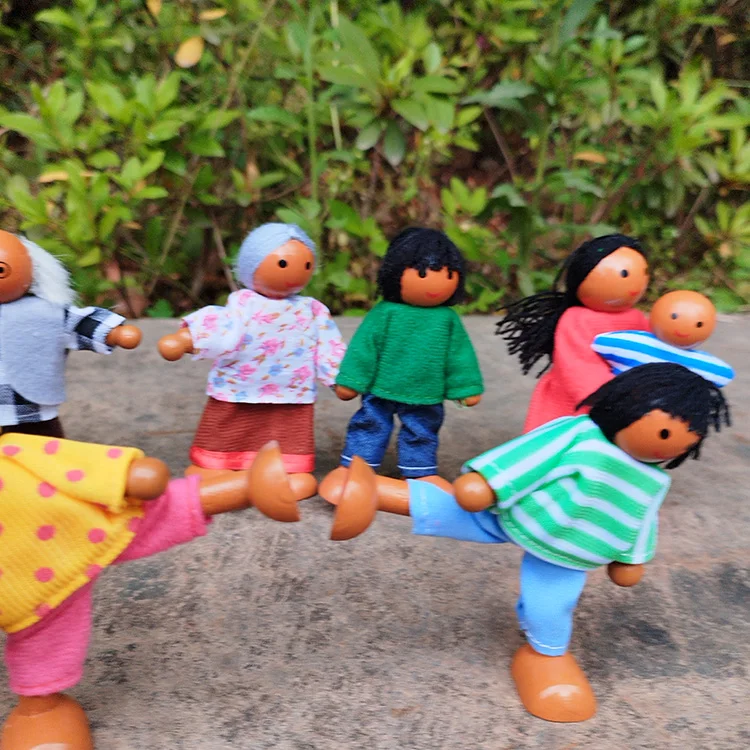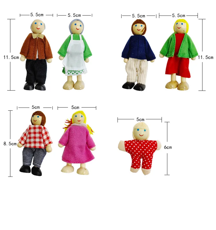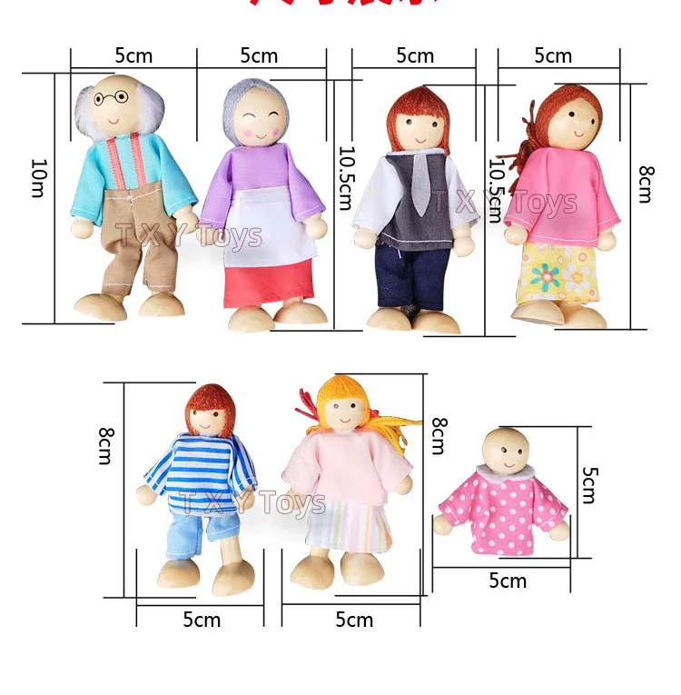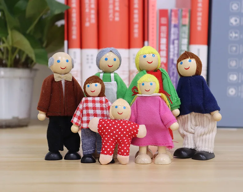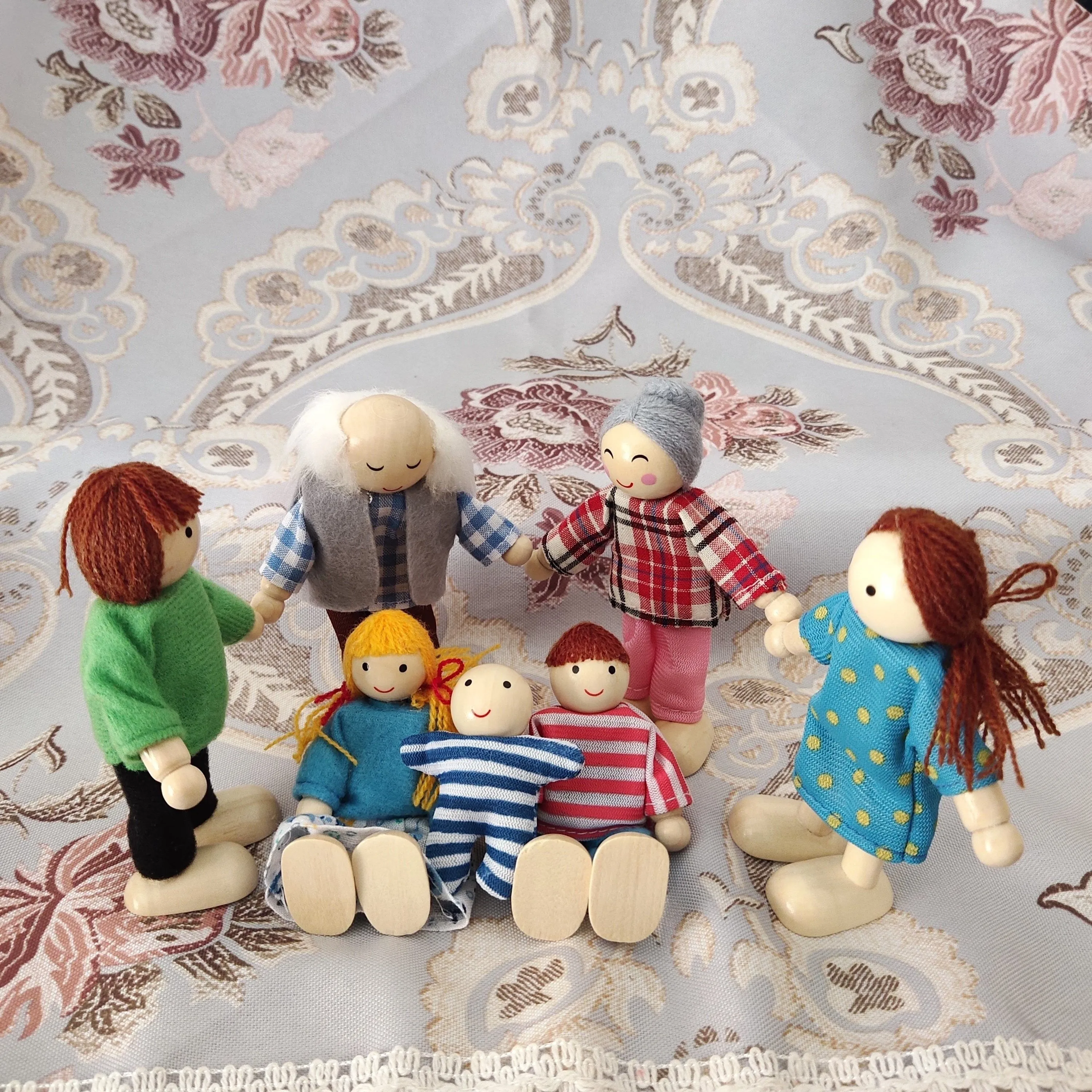 Happy Doll familia en miniatura 6 personas, juego de juguete, muñecas articuladas de madera, muppet para niños, juguetes de simulación, personajes llamados con la historia