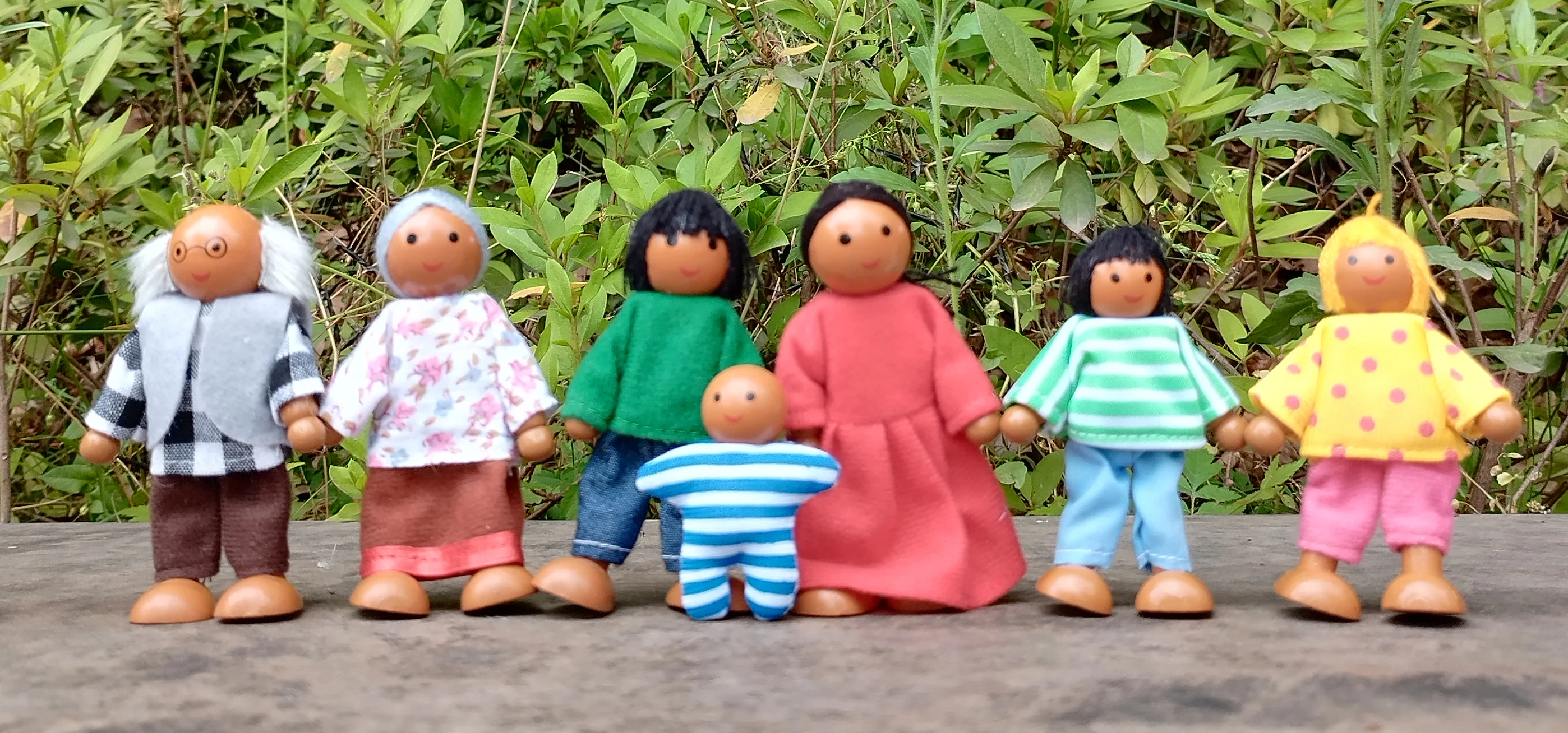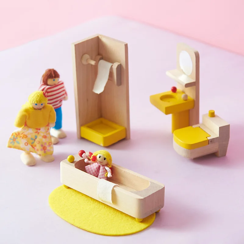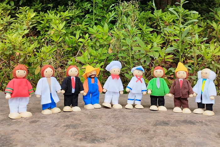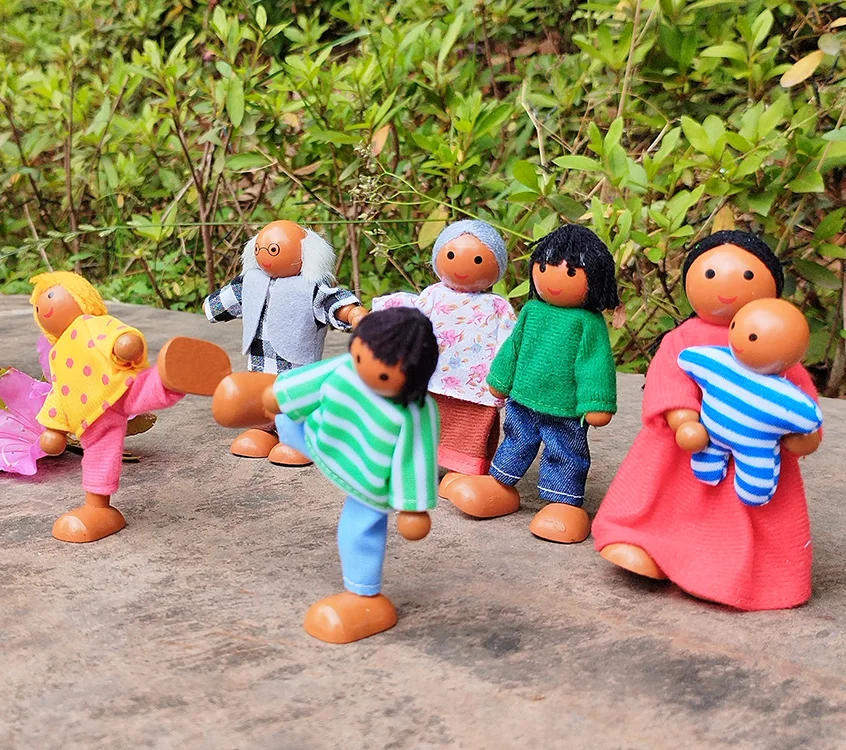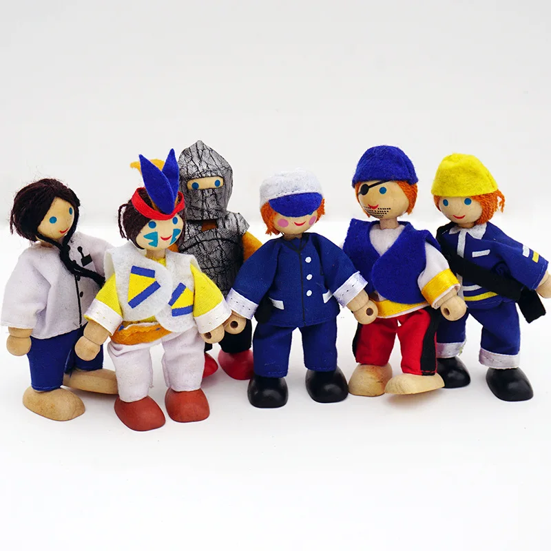 Happy Doll familia en miniatura 6 personas, juego de juguete, muñecas articuladas de madera, muppet para niños, juguetes de simulación, personajes llamados con la historia