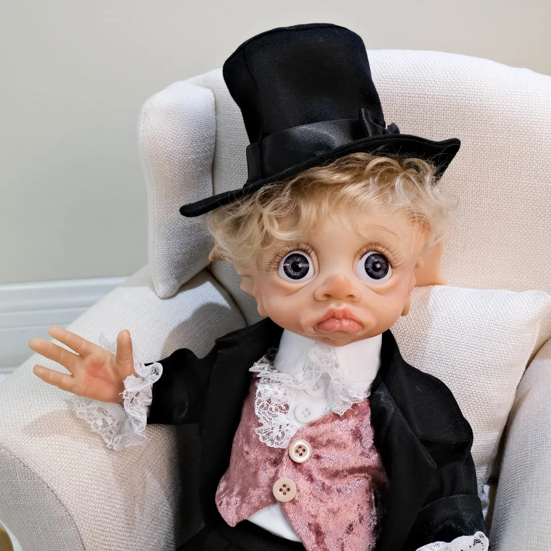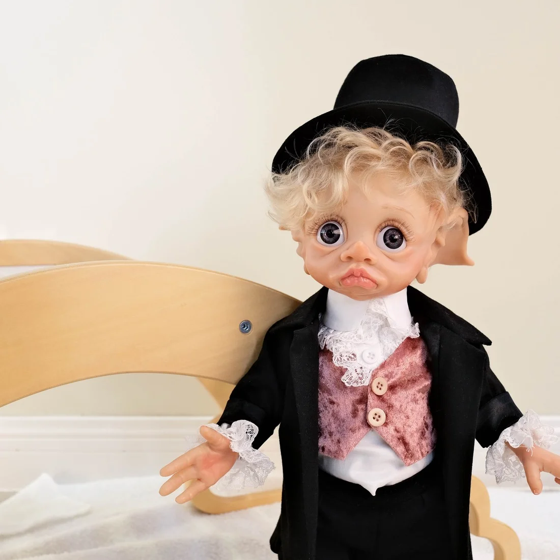 ¡Muy guapo y apuesto compañero de aspecto! Se parece a la foto y es más alto de lo que pensé que sería. Me encantan sus grandes orejas puntiagudos y su pelo rizado. La calidad y la sensación del material utilizado para Su ropa es muy agradable y La costurera hizo un gran trabajo en la costura de todo. También me encantan sus zapatos que tienen fondos duros. Sus zapatos se ajustan un poco apretados porque sus pies son un poco anchos, pero caben en los zapatos después de un poco de maniobra. Los zapatos se sienten como cuero con cordones de zapatos que necesitan ser atados, pero lo más probable es que sea un material de vinilo. De cualquier manera son adorables. Buen trabajo en esta creación. Estoy muy feliz de tenerlo.