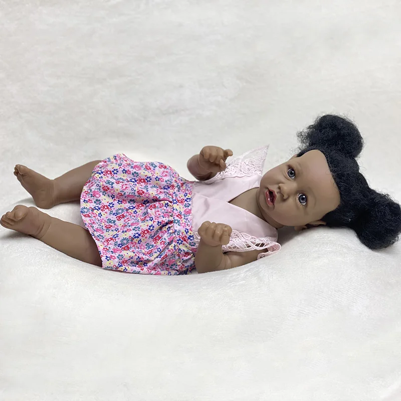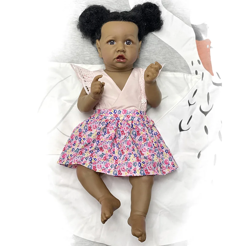 Comprar Muñeca Reborn de cuerpo completo de silicona para niños, juguete de muñeca de 55CM con cuerpo de silicona suave, tacto Real, africano, rizado negro con raíces y vestido