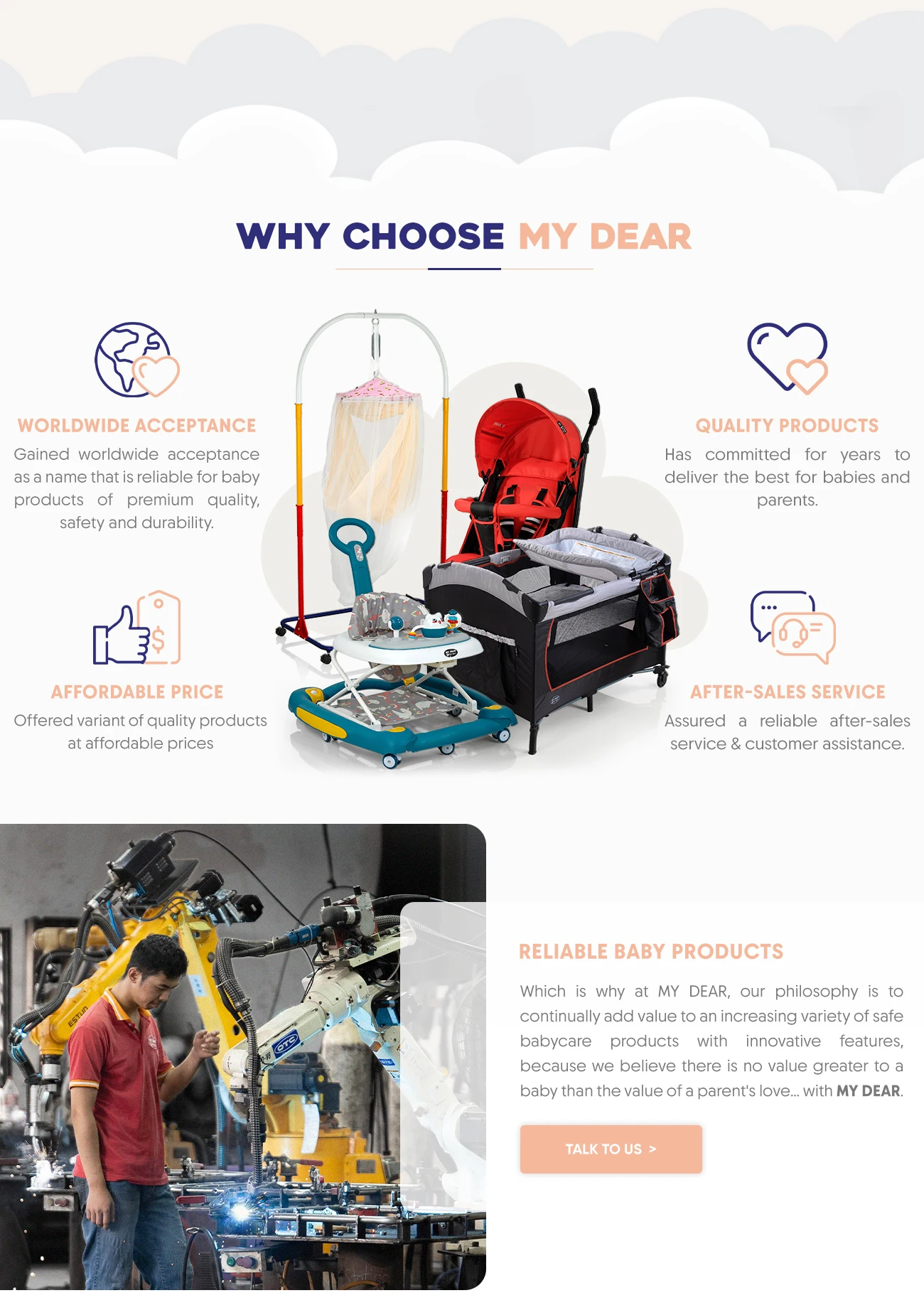MY DEAR ha ganado aceptación mundial como un nombre confiable para productos para bebés de primera calidad, seguridad y durabilidad.Nos hemos comprometido durante años a ofrecer lo mejor para bebés y padres en forma de producto asequible y excelente servicio.