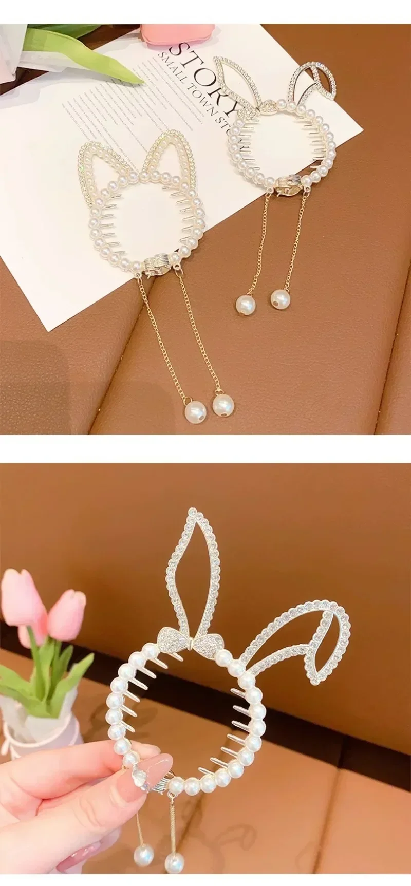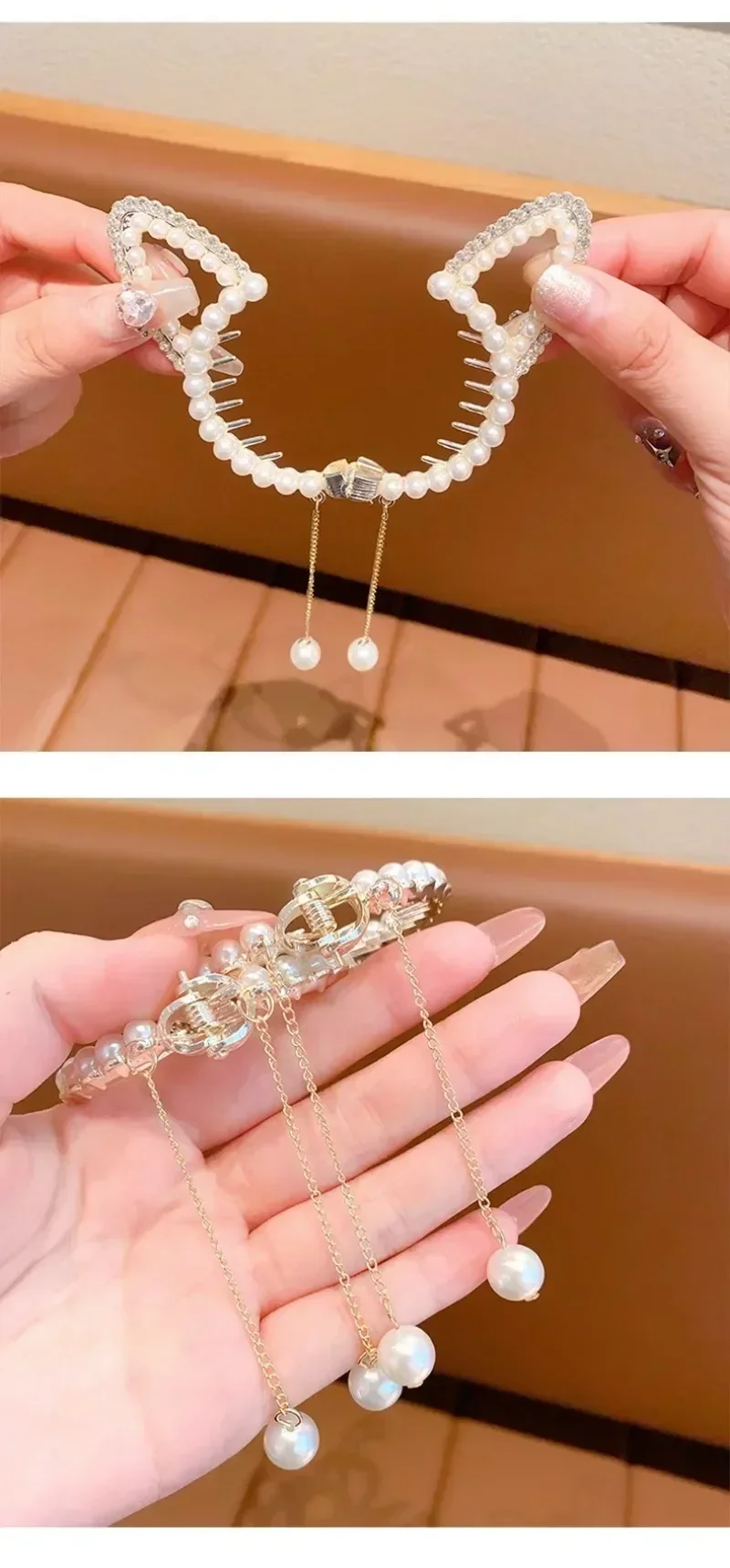 Se ve bonito cuando se lleva en la cabeza, pero al verlo de lado, la parte de aleación de la base es más visible que la parte de perla, por lo que no es la imagen que esperaba. Es un diseño de estilo primaveral, lo que lo hace tanto conveniente como inconveniente de usar.