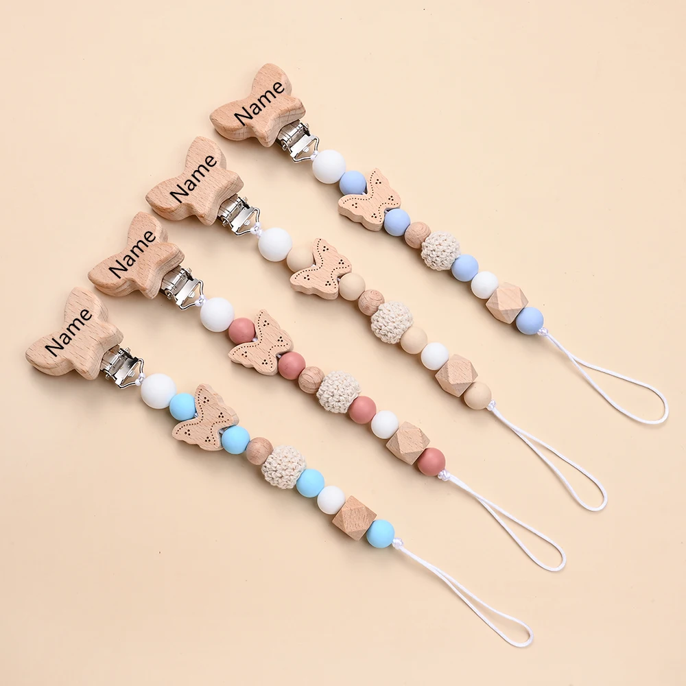 Comprar Nombre de personalización de haya, mariposa de madera, Clip de cadena para chupete de bebé, cuentas de mariposa, cuentas de silicona, soporte para pezones para regalo de recién nacido