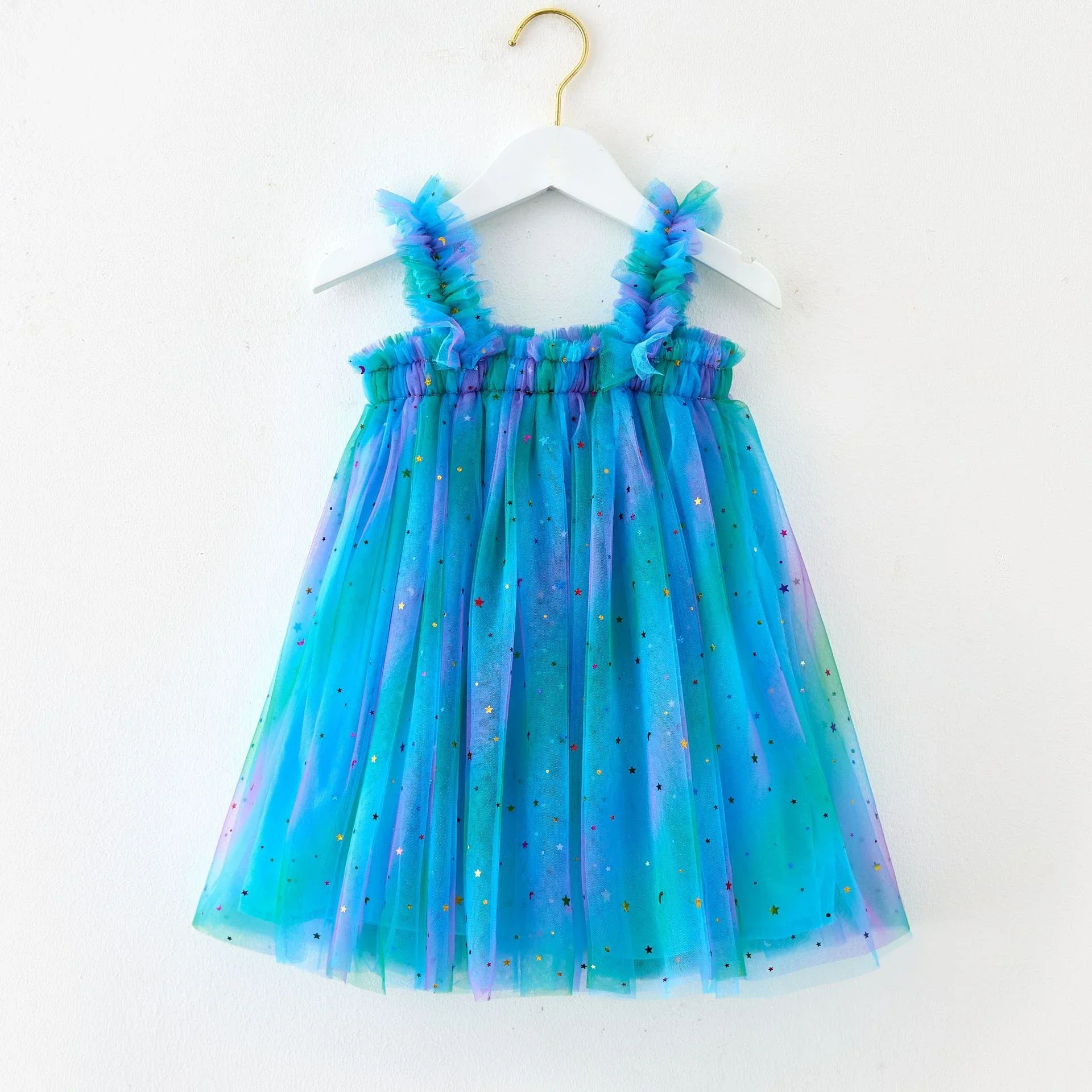 Novedad de verano de 1 a 5 años, ropa para niña, falda con tirantes de arcoíris, mangas, vestidos de malla para bebé, bonito vestido de baile de princesa