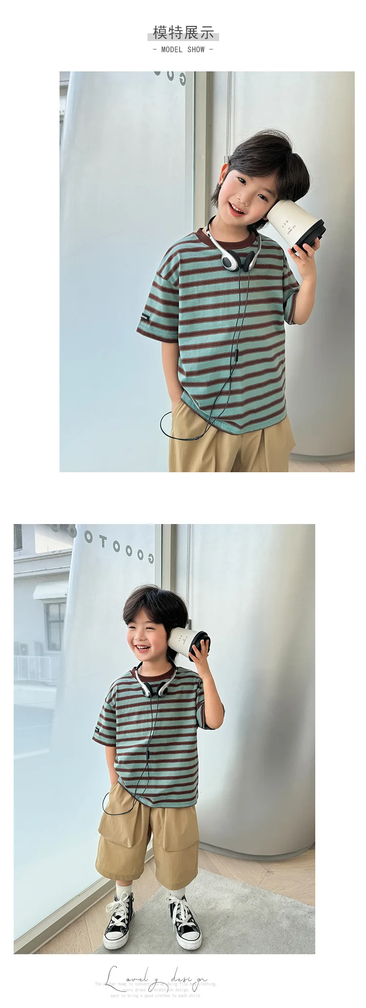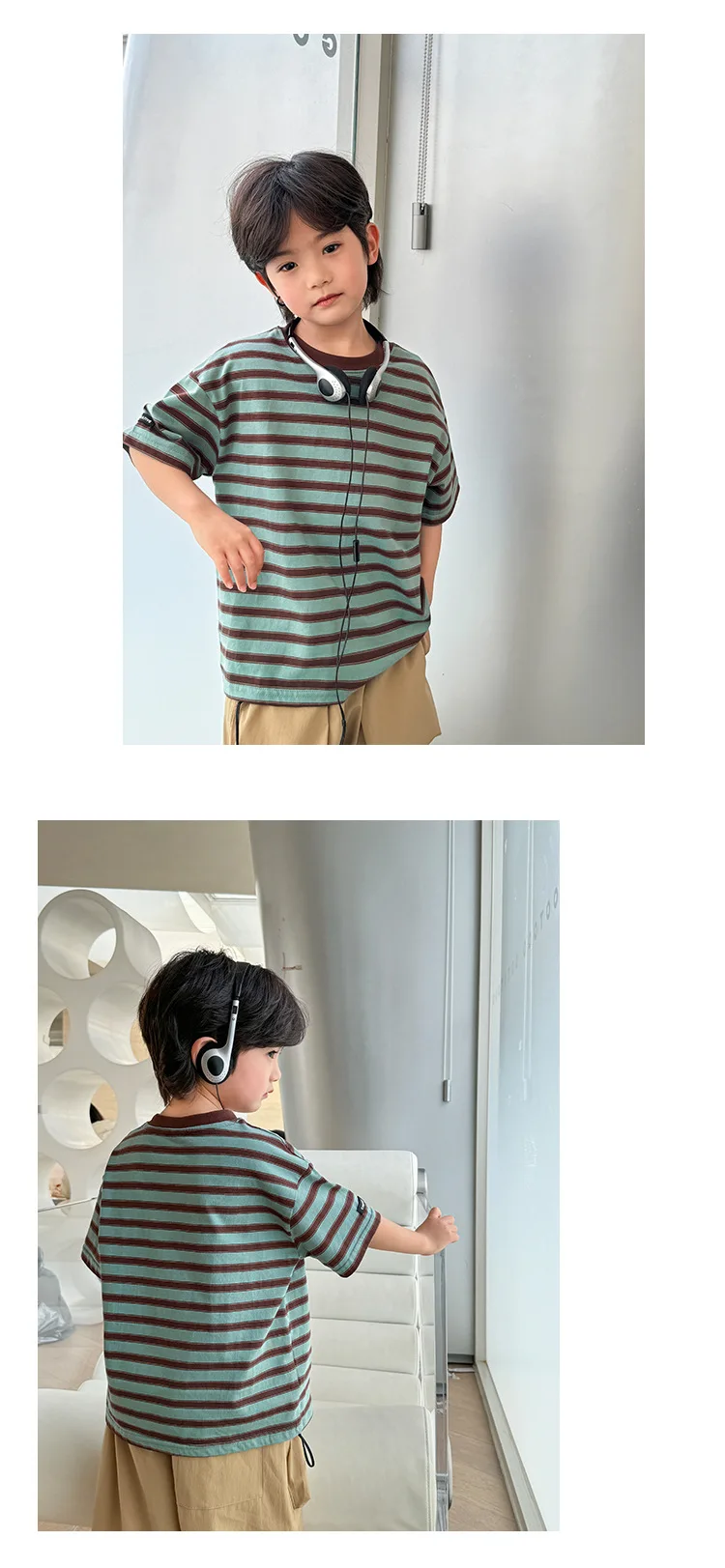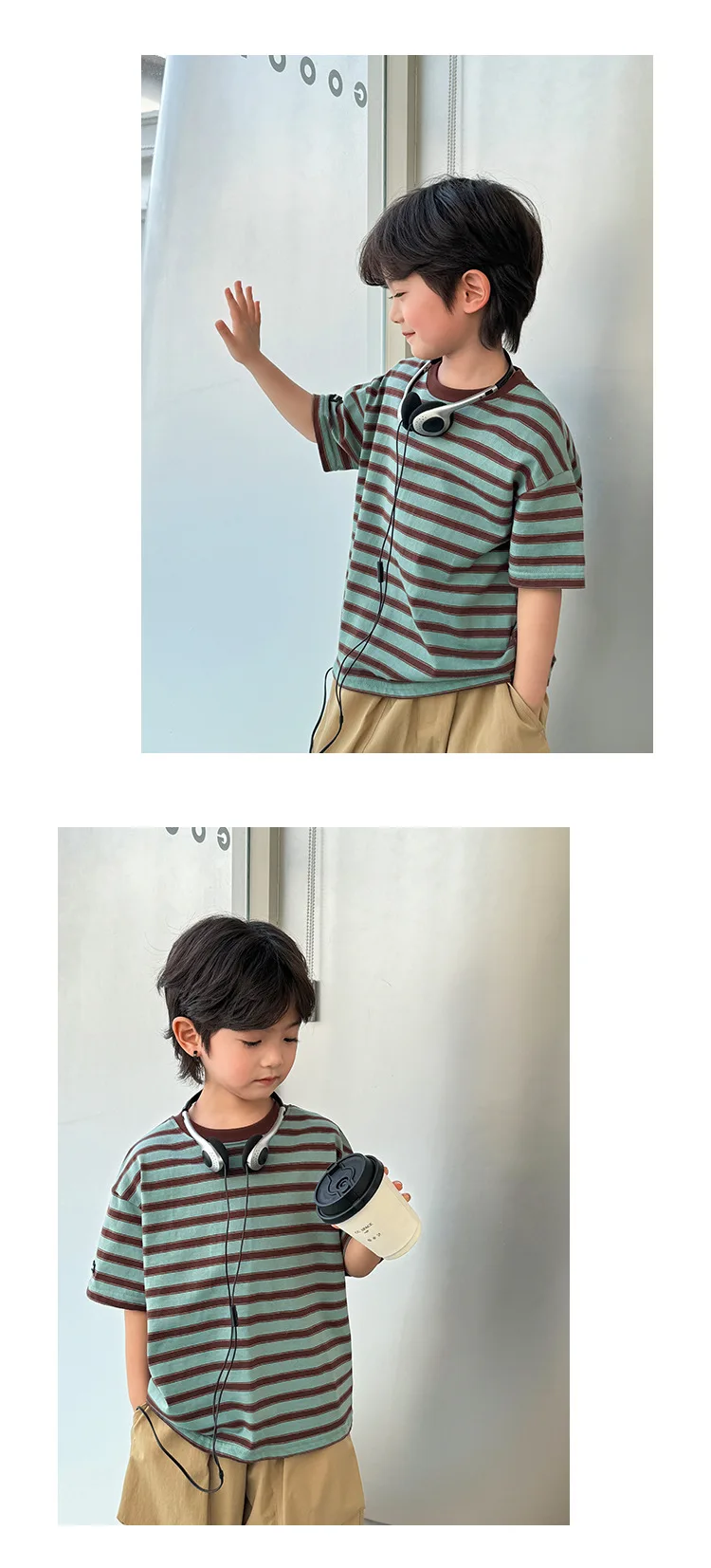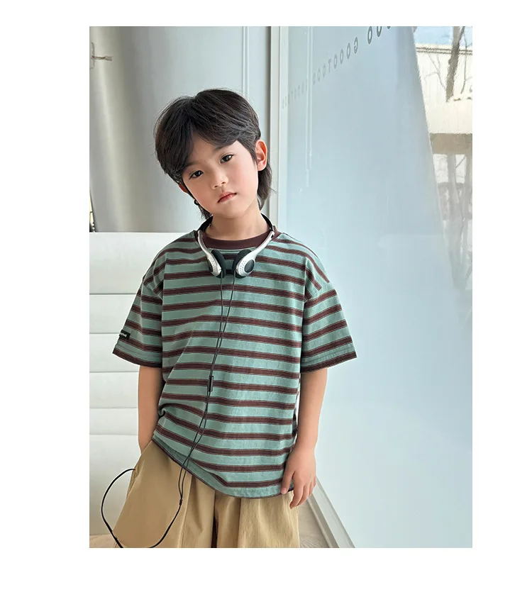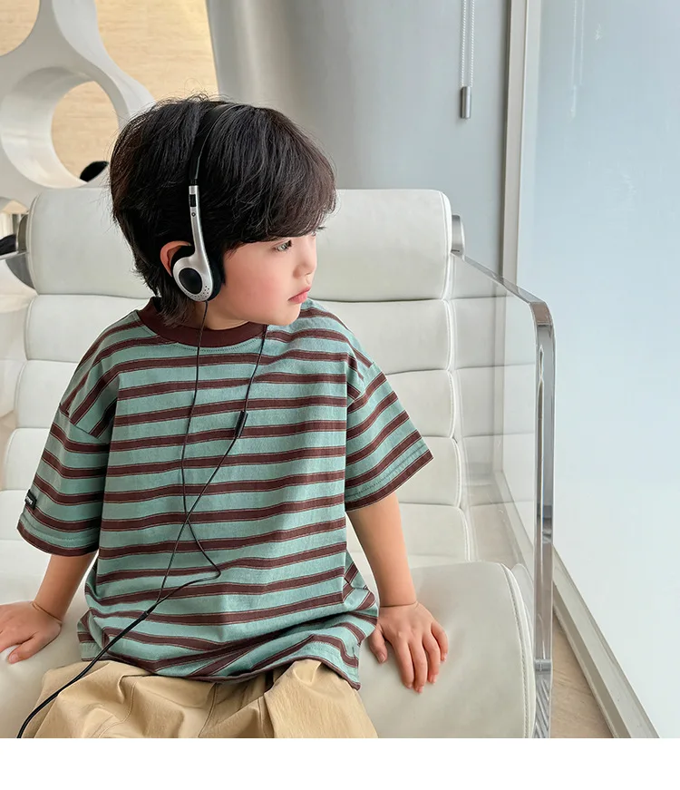 NOVEDAD DE VERANO 20225, camiseta de manga corta a rayas versión coreana para niños, ropa de media manga de algodón puro para niños Chi
