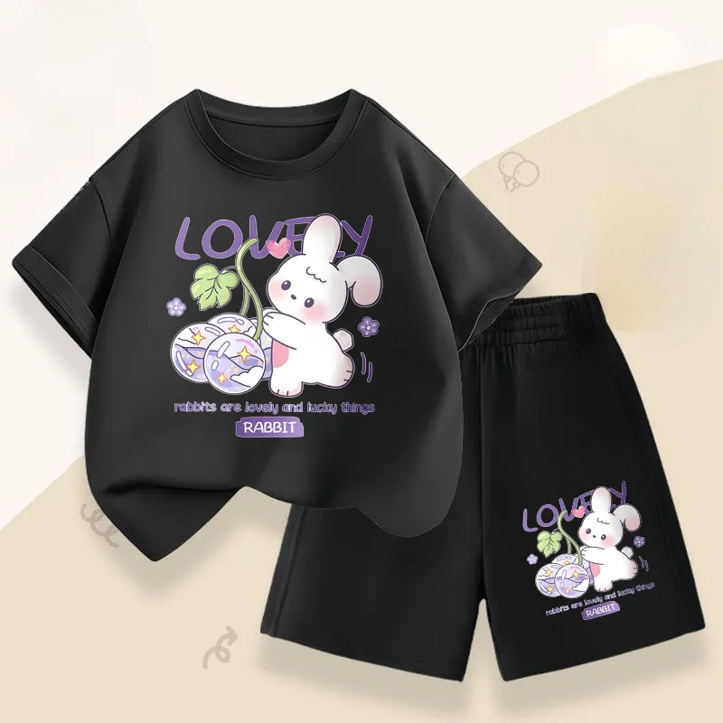 Novedad de verano, trajes informales para niñas, conjuntos de Top de manga corta para niños, camiseta con estampado de conejo bonito, pantalones cortos, traje de dos piezas