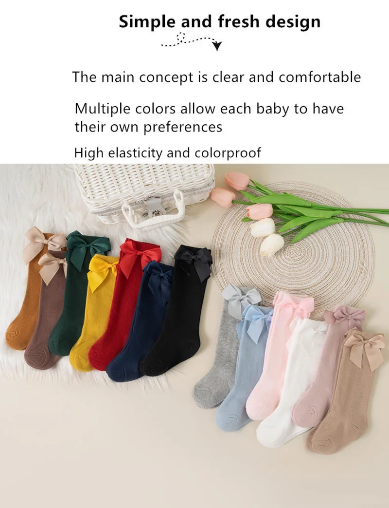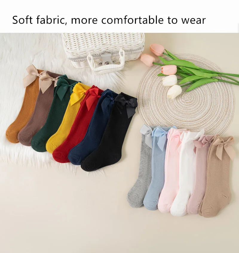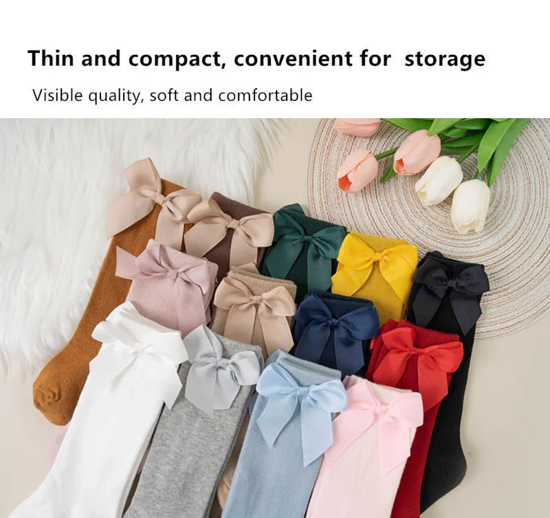 Comprar Nueva marca de calcetines para bebés pequeños, Otoño Invierno, calcetines largos hasta la rodilla para niñas, calcetines de algodón con lazo grande, calcetines de suelo de estilo español para niños