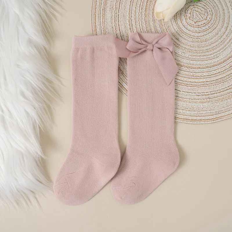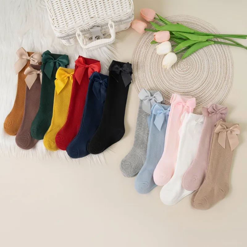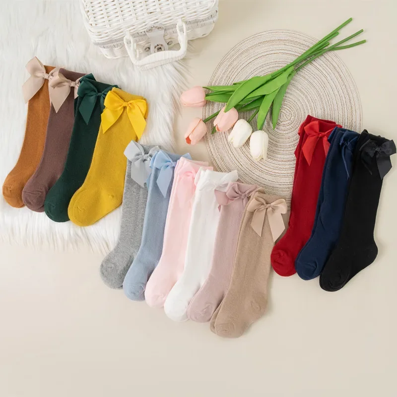 Comprar Nueva marca de calcetines para bebés pequeños, Otoño Invierno, calcetines largos hasta la rodilla para niñas, calcetines de algodón con lazo grande, calcetines de suelo de estilo español para niños