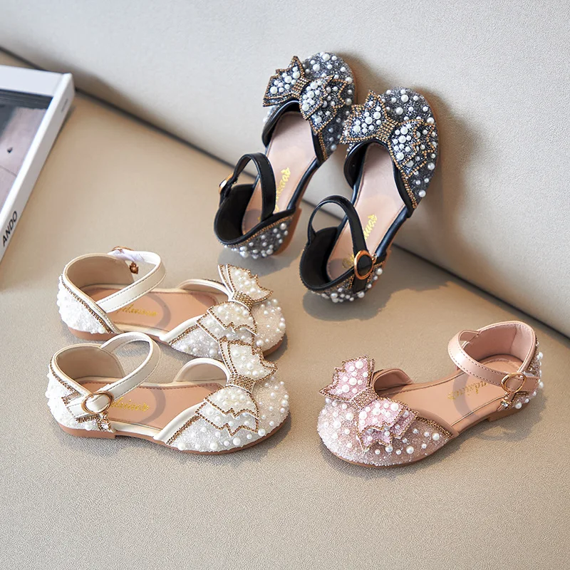 Comprar Nuevas sandalias para niña, bonito lazo, lentejuelas y perlas, zapatos de princesa para chico, tacones planos, talla 21-36 para bailar