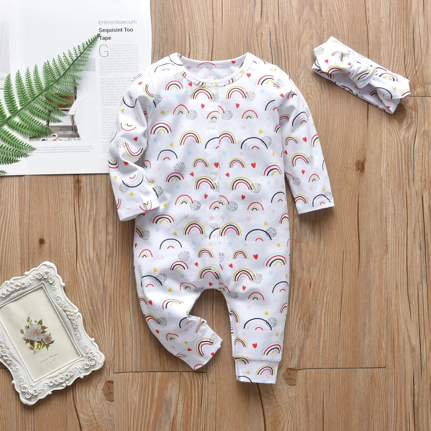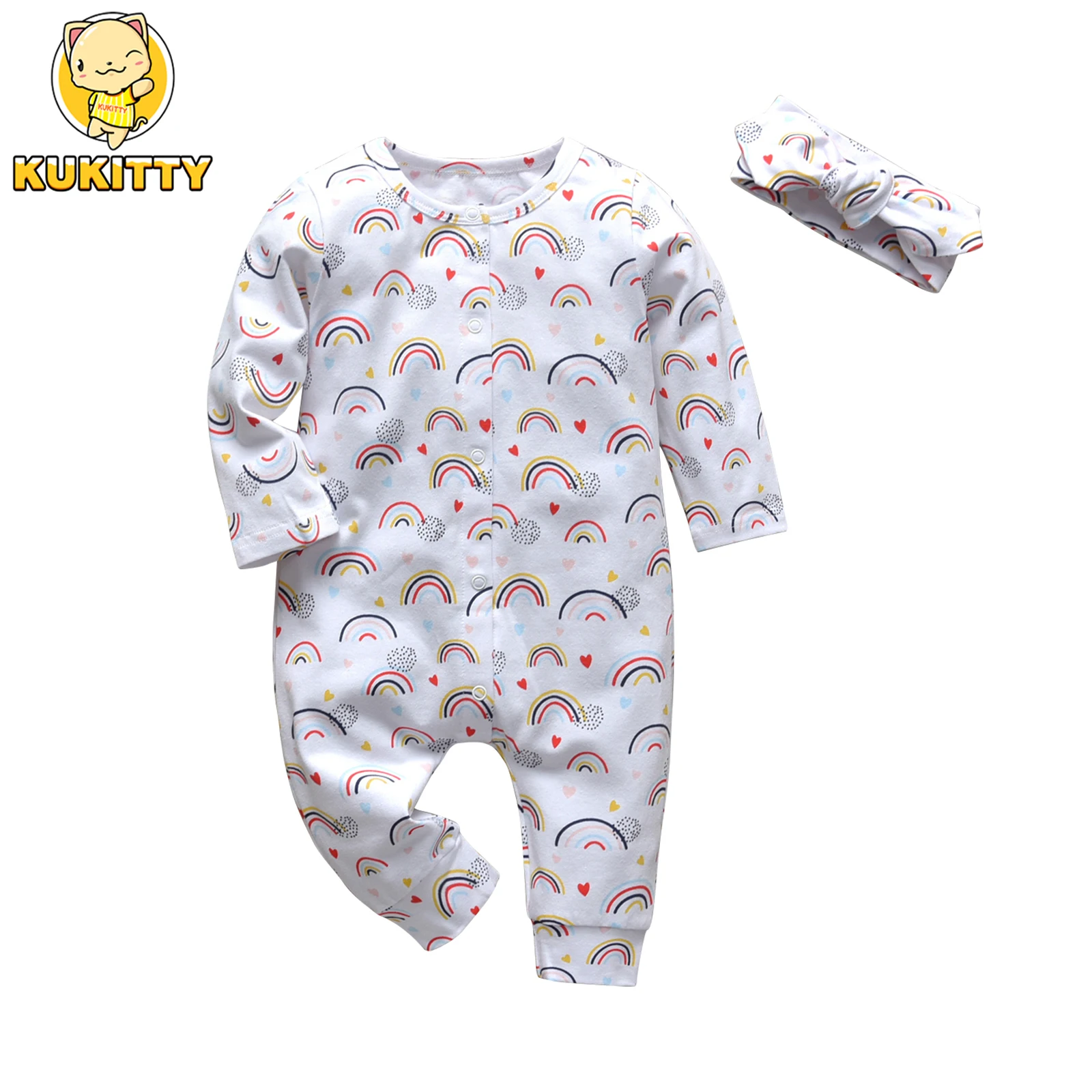 Comprar Nuevo Arco Iris bebé niña manga larga Snap mameluco ropa para 0-18 meses mono de algodón traje de dormir diadema ropa para recién nacido