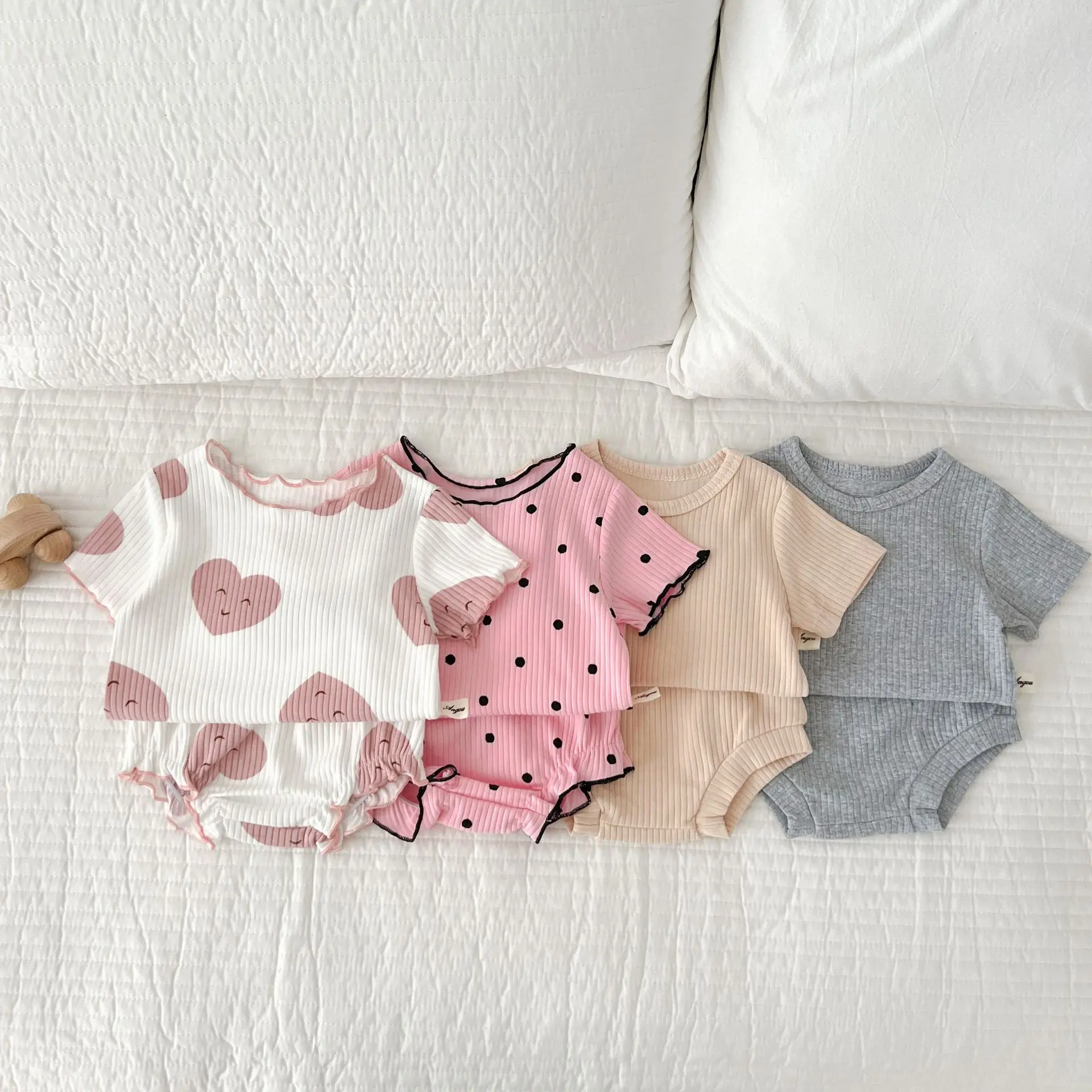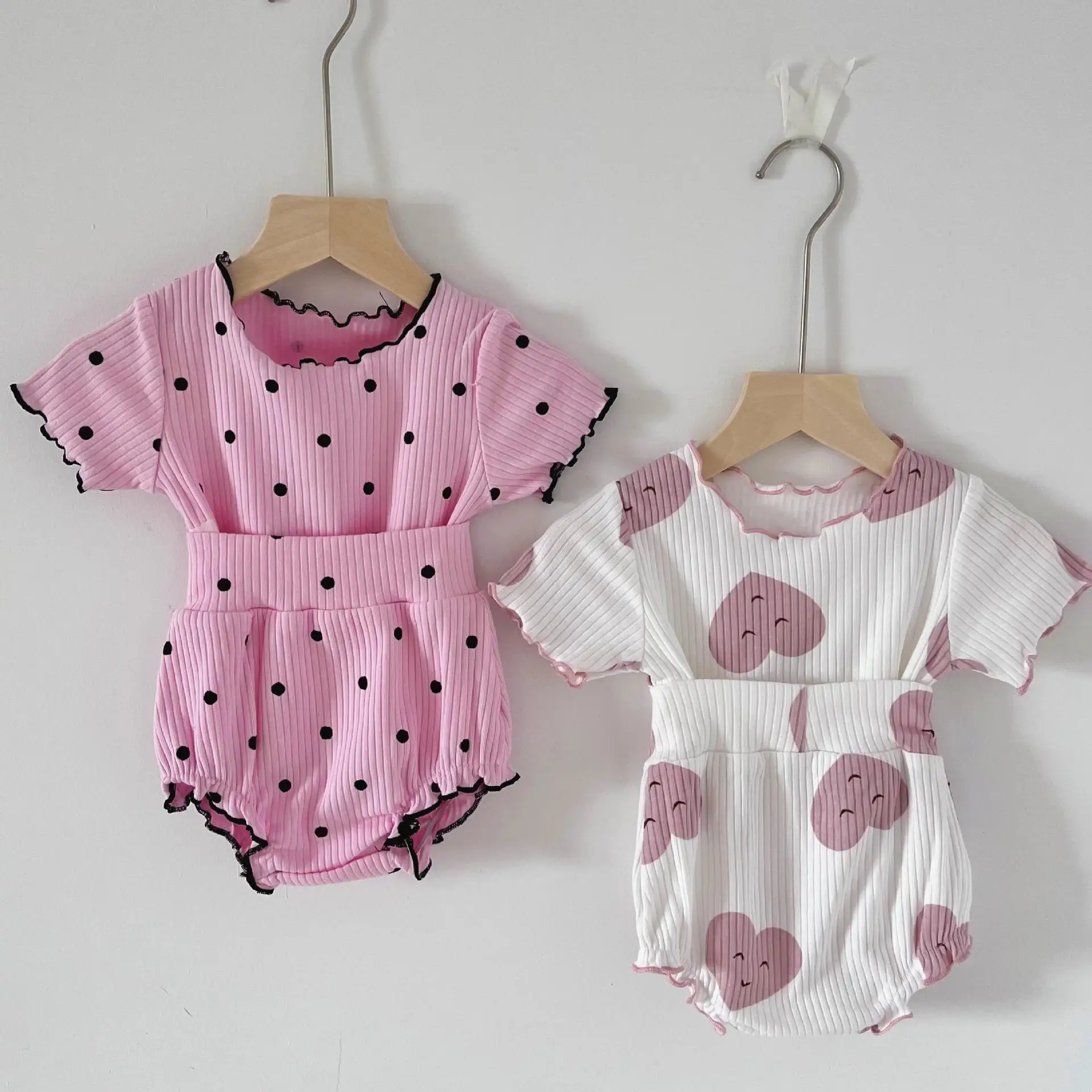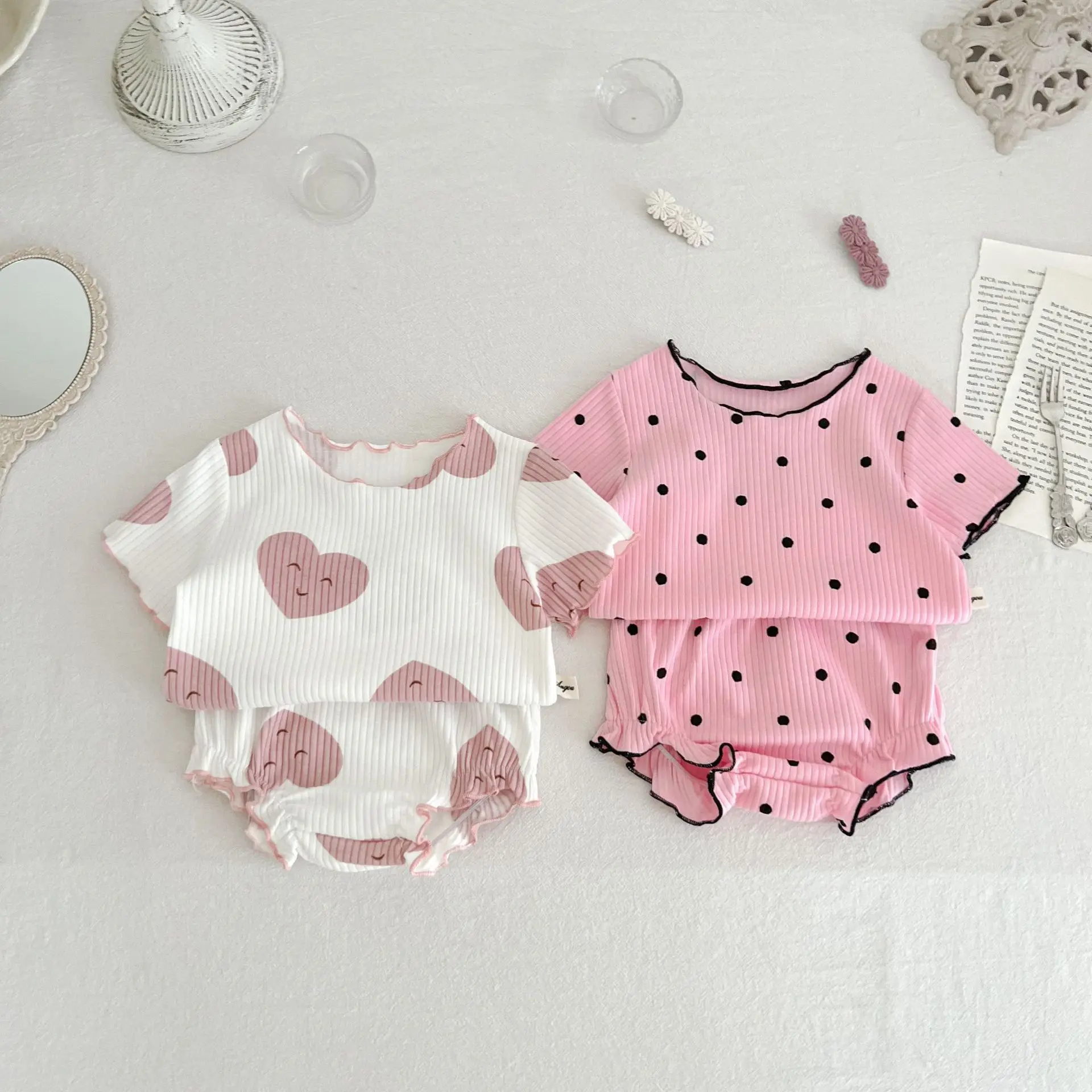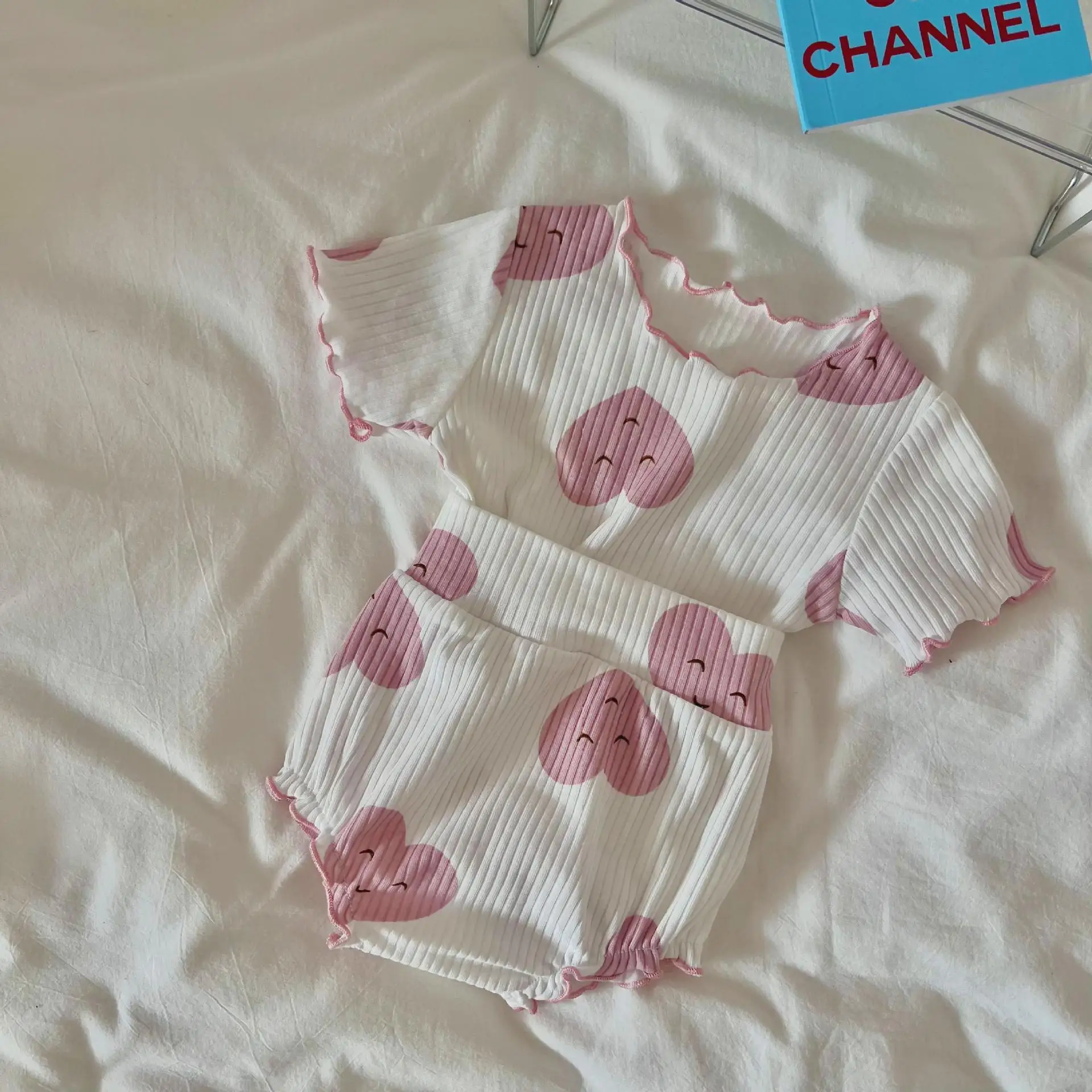Comprar Nuevo conjunto de ropa de manga corta para niña, bonito estampado de corazón, trajes para niña pequeña, camiseta de verano para bebé + Pantalones cortos, traje de 2 uds.