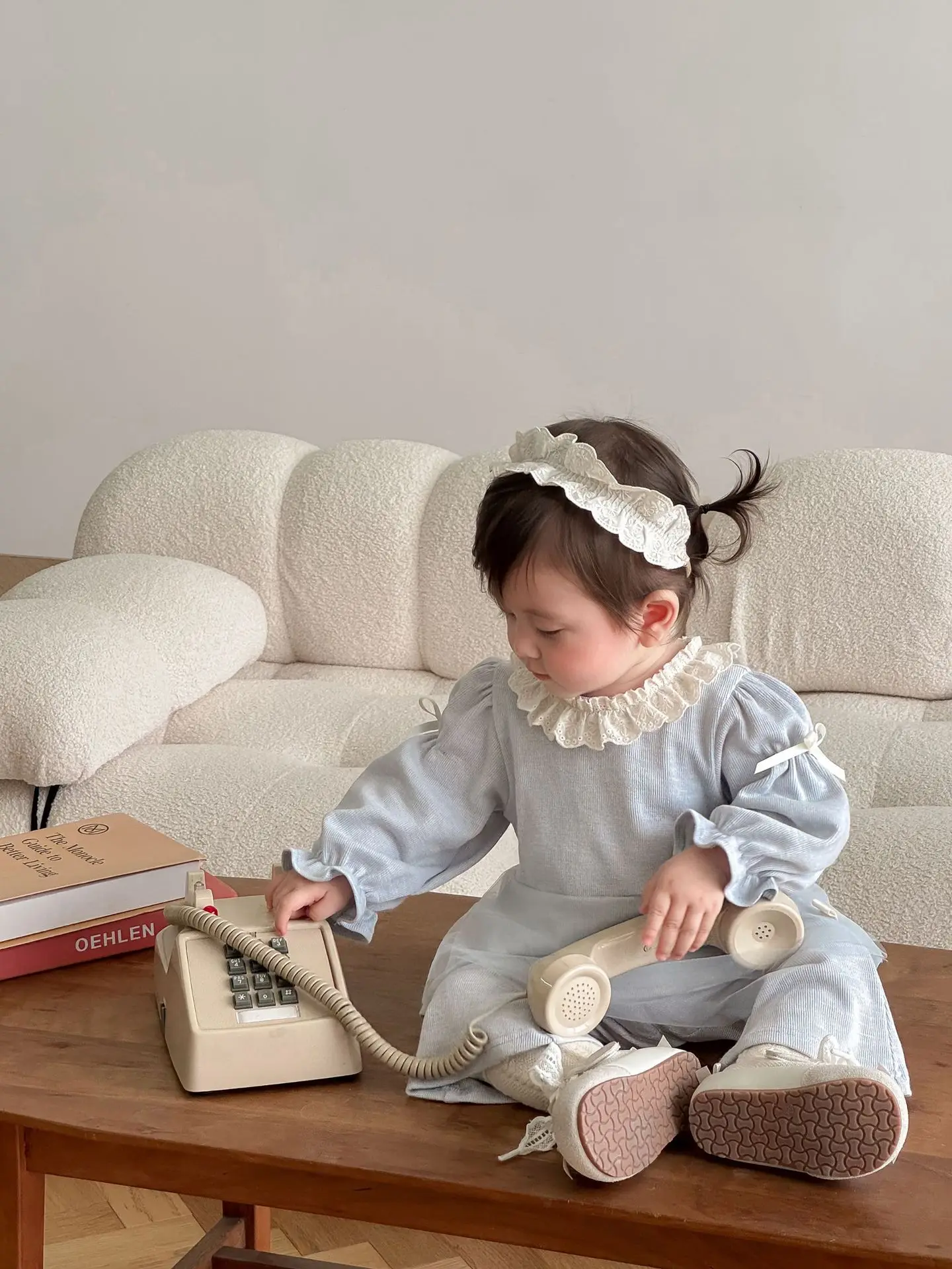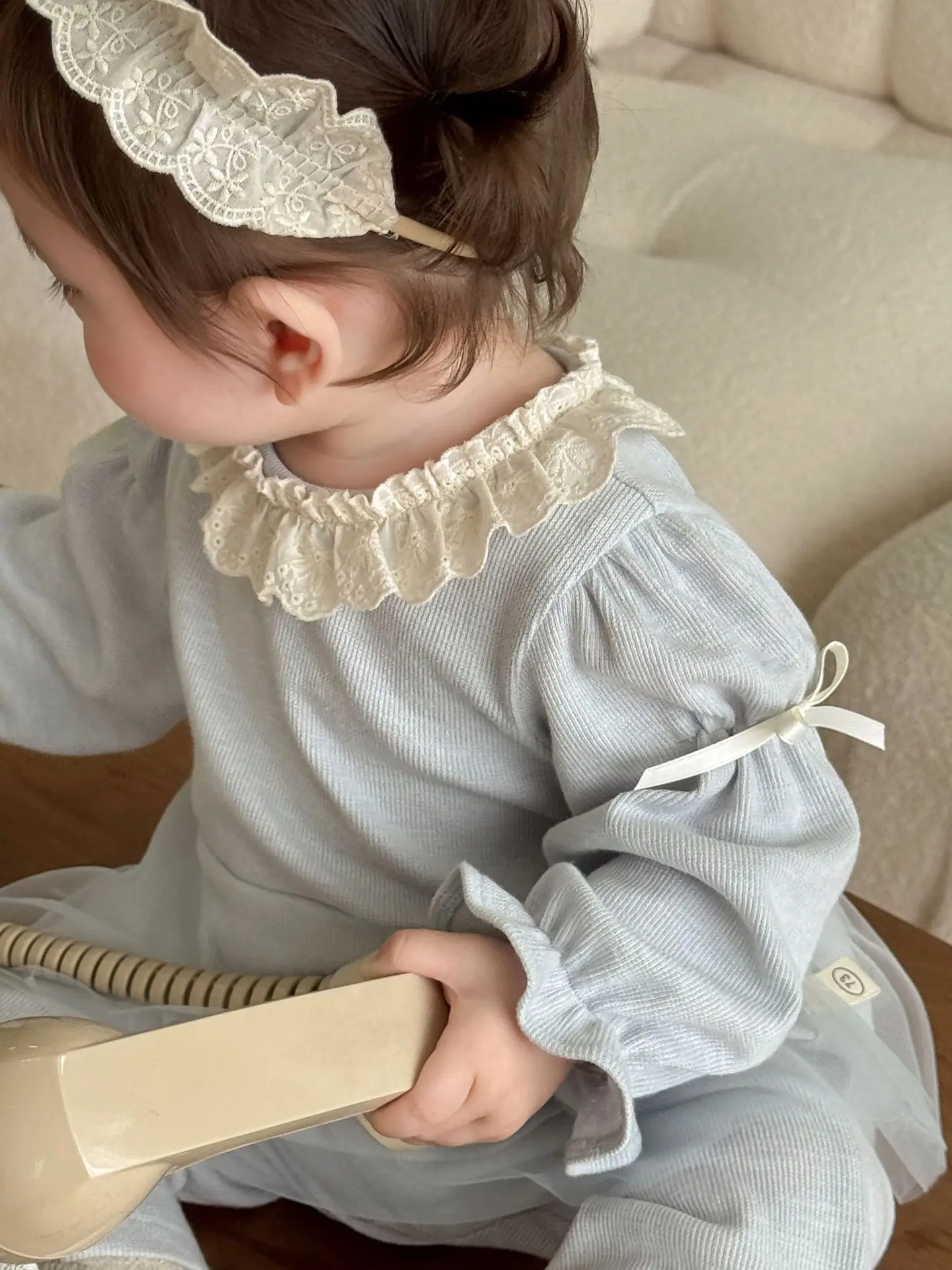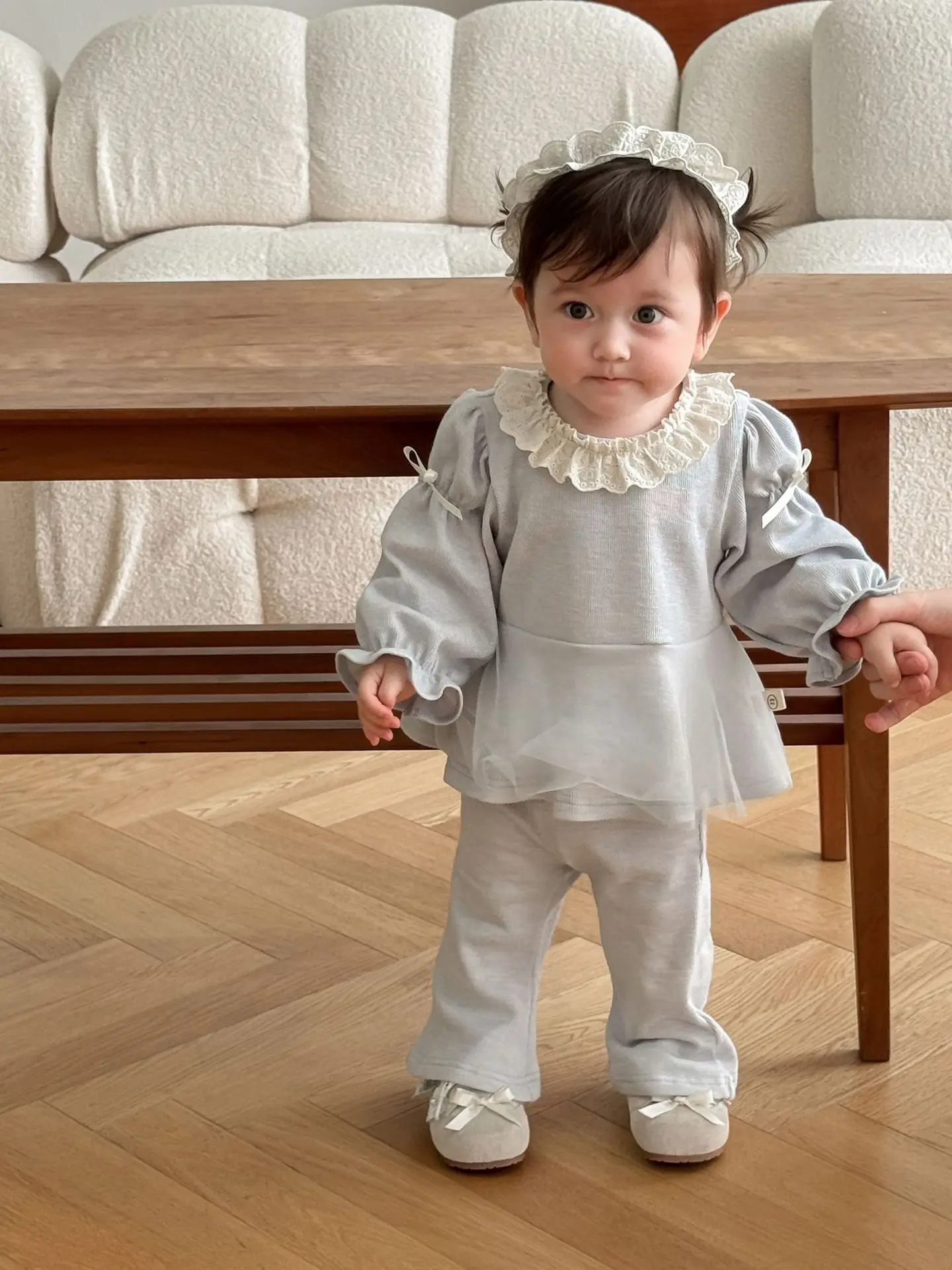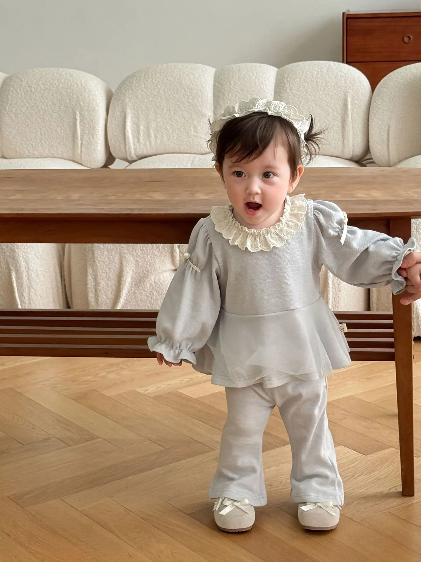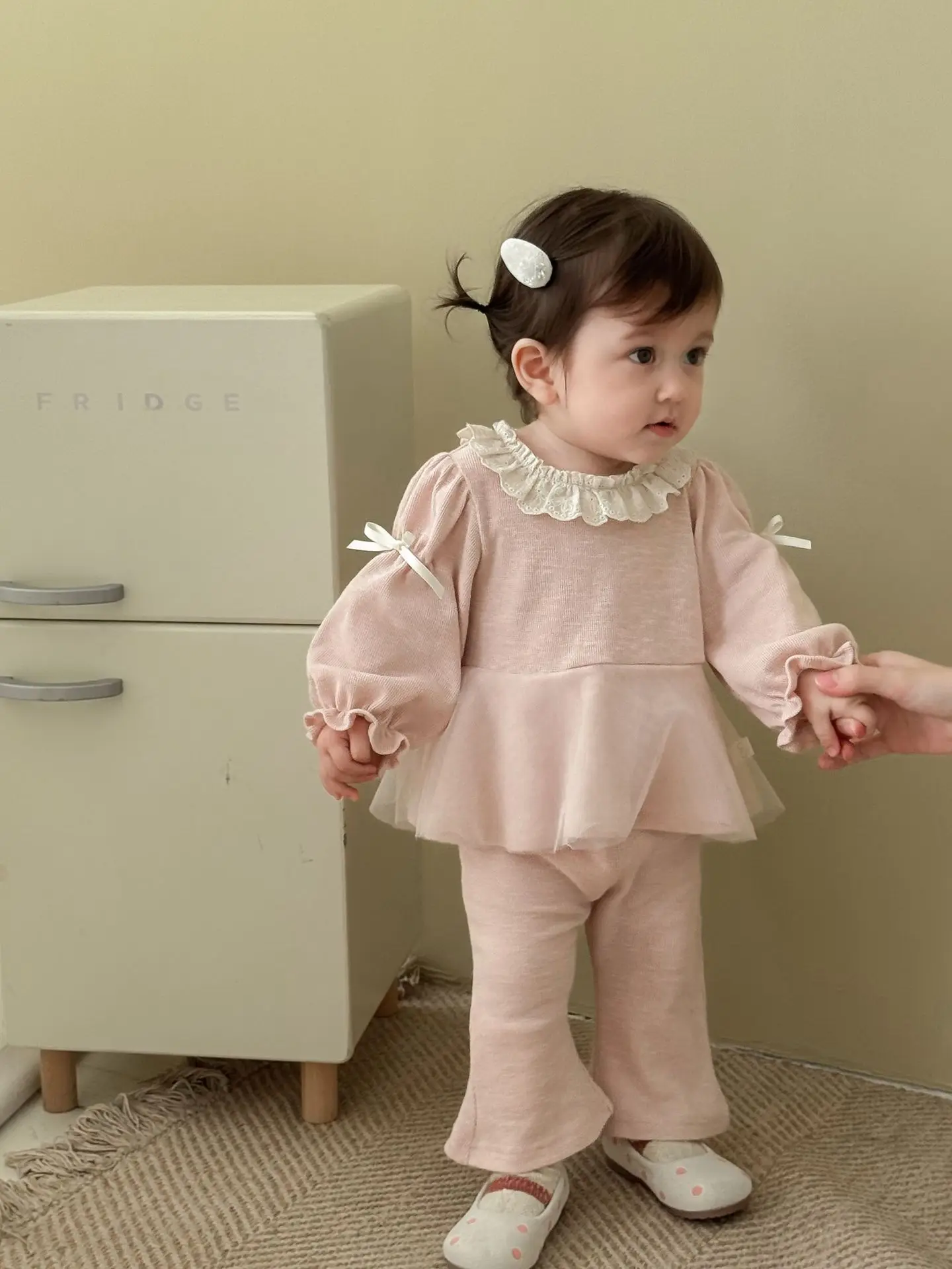 Nuevo conjunto de ropa de otoño para niños, blusa con volantes y lazo de malla y pantalones acampanados, conjunto de ropa para niñas de 2 uds, conjunto para niñas