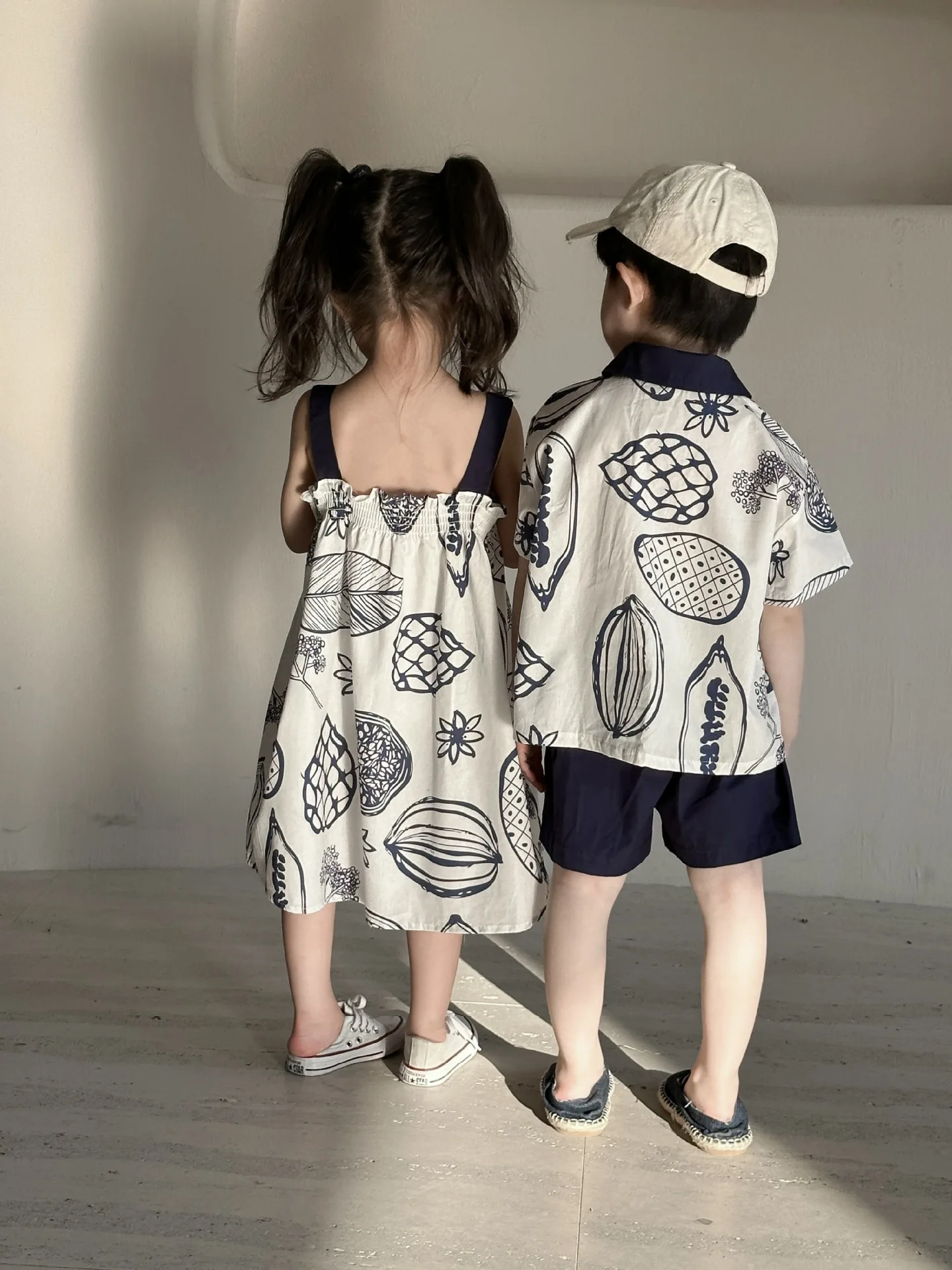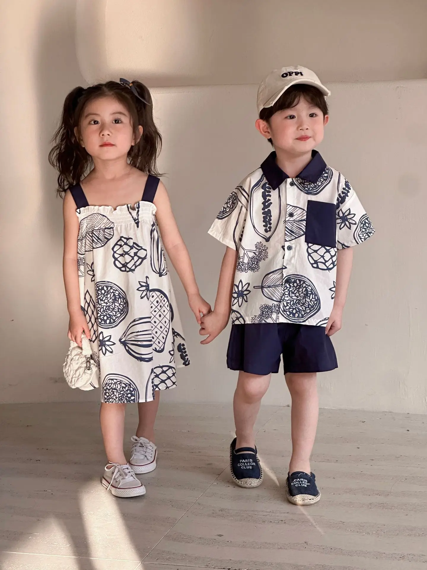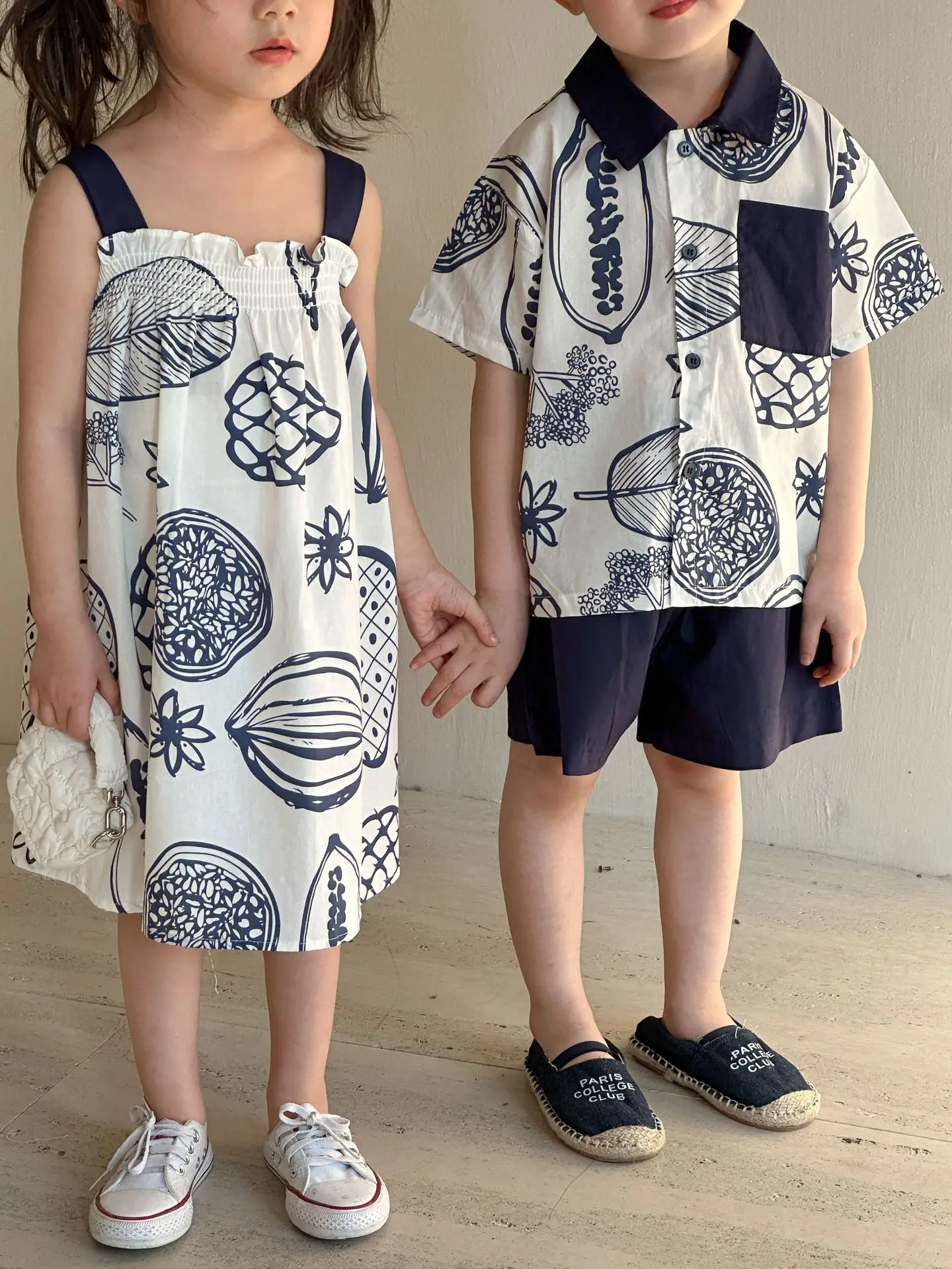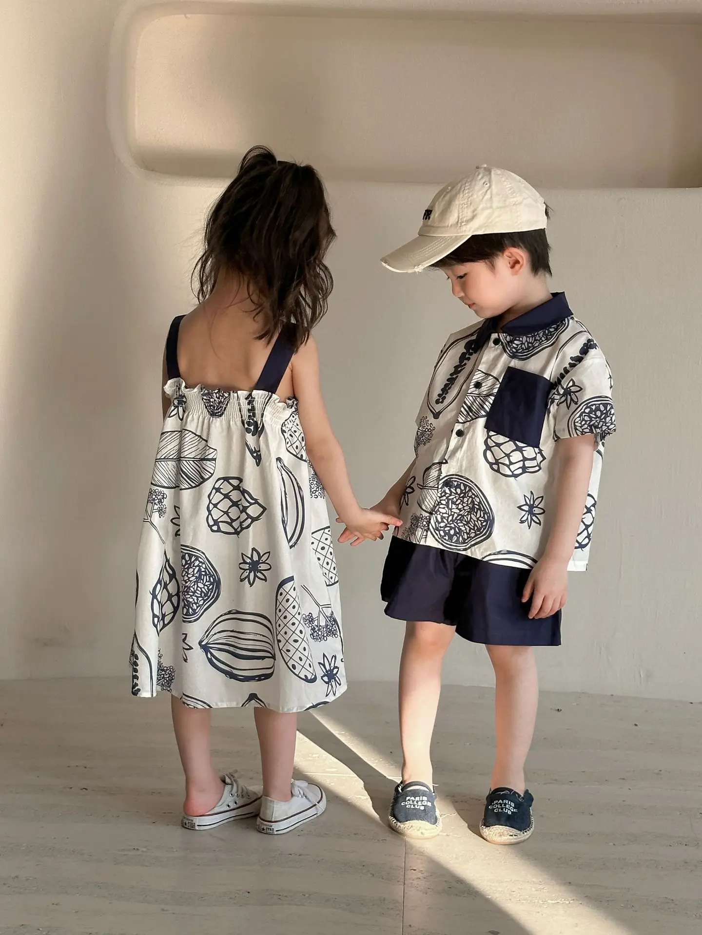 Comprar Nuevo conjunto de ropa de verano para niños, camisa de fruta de dibujos animados + pantalones cortos de Color sólido, vestido de tirantes para niñas