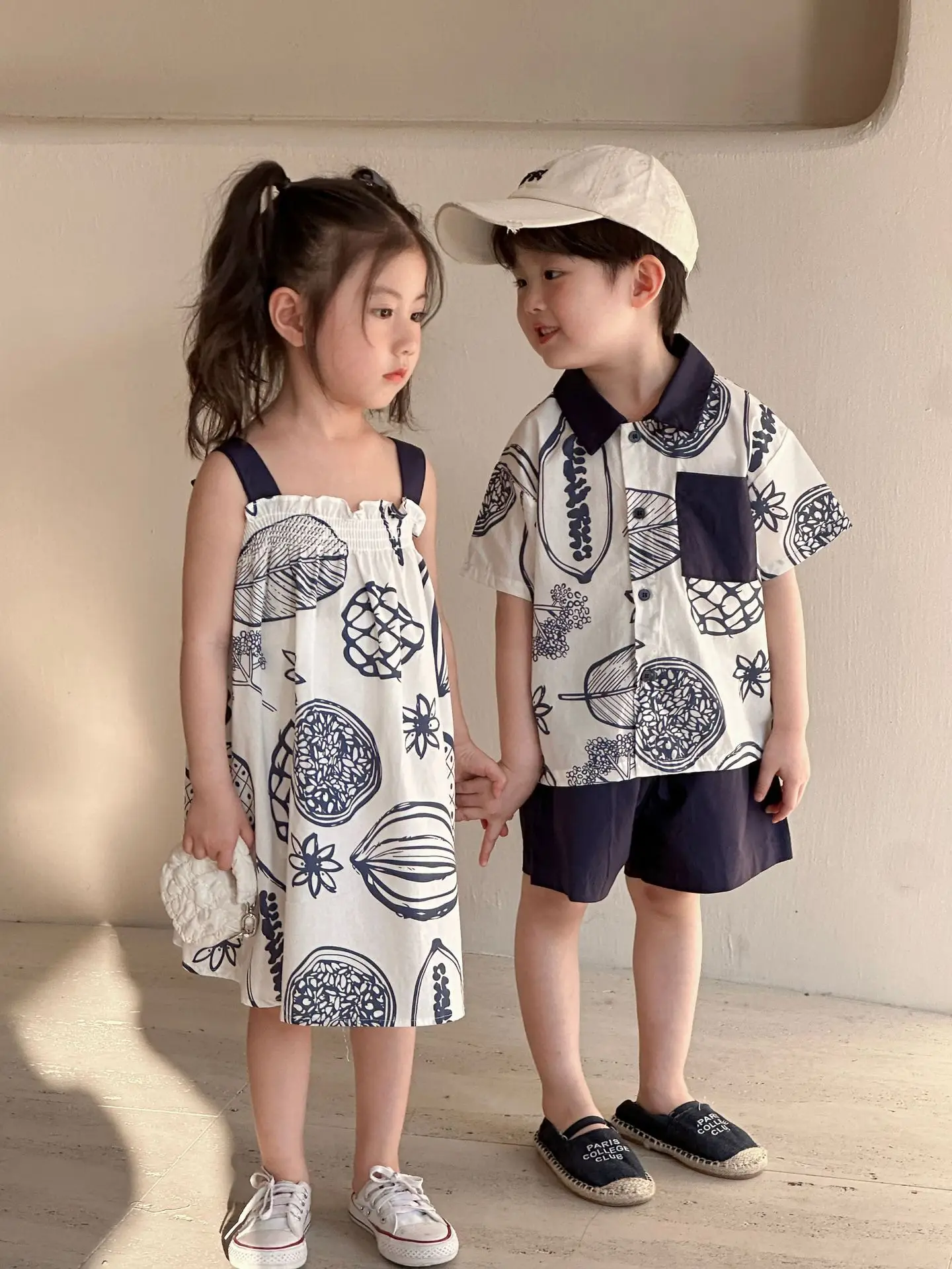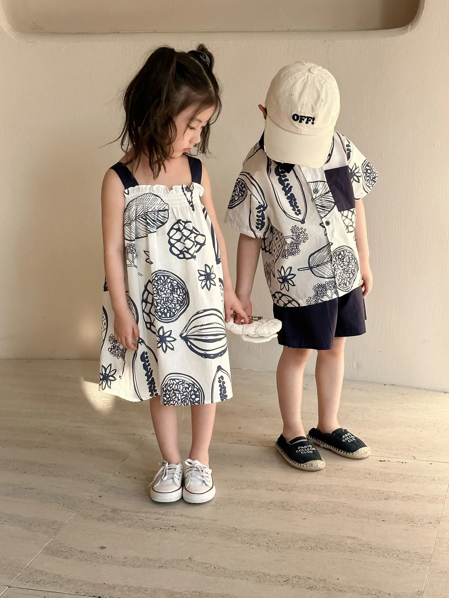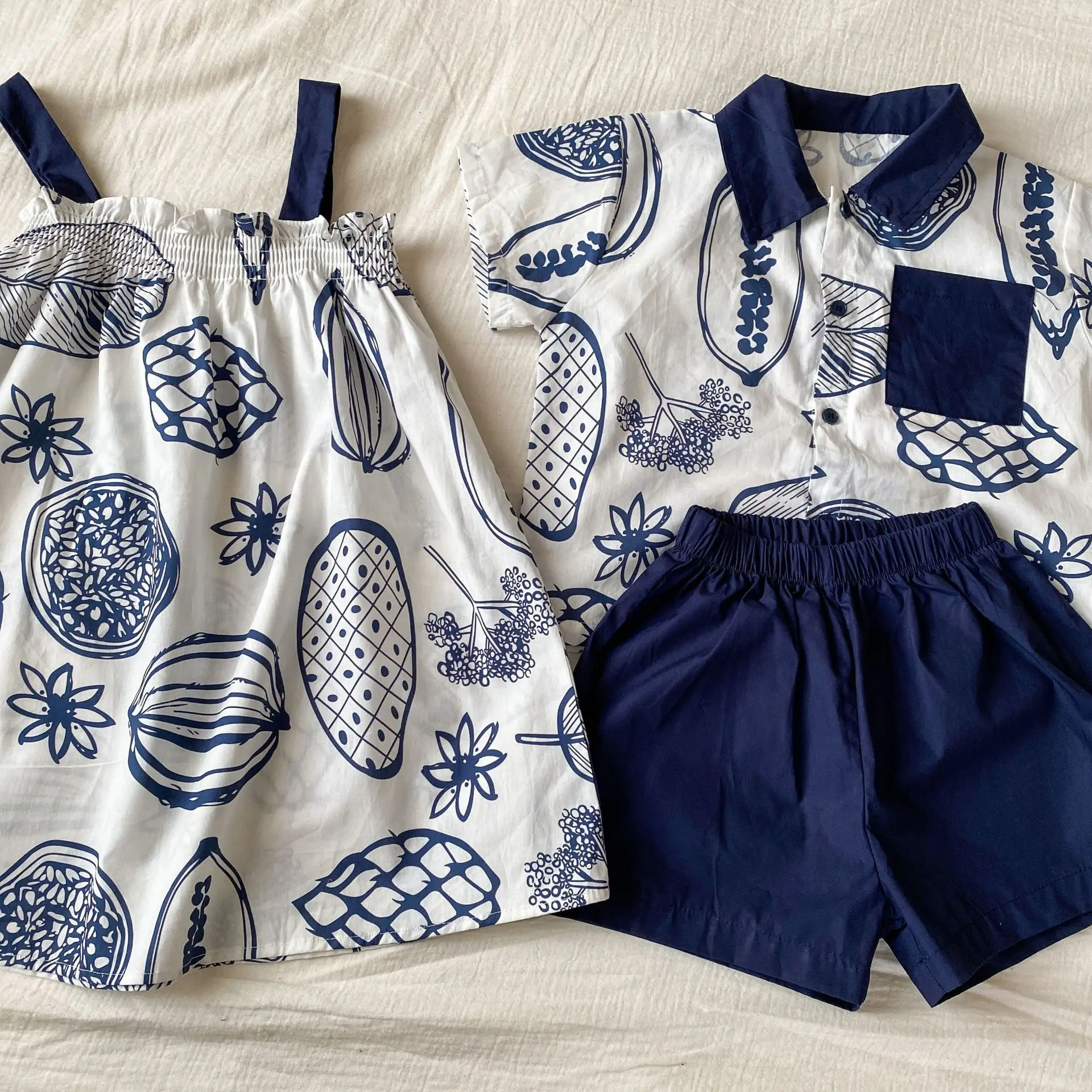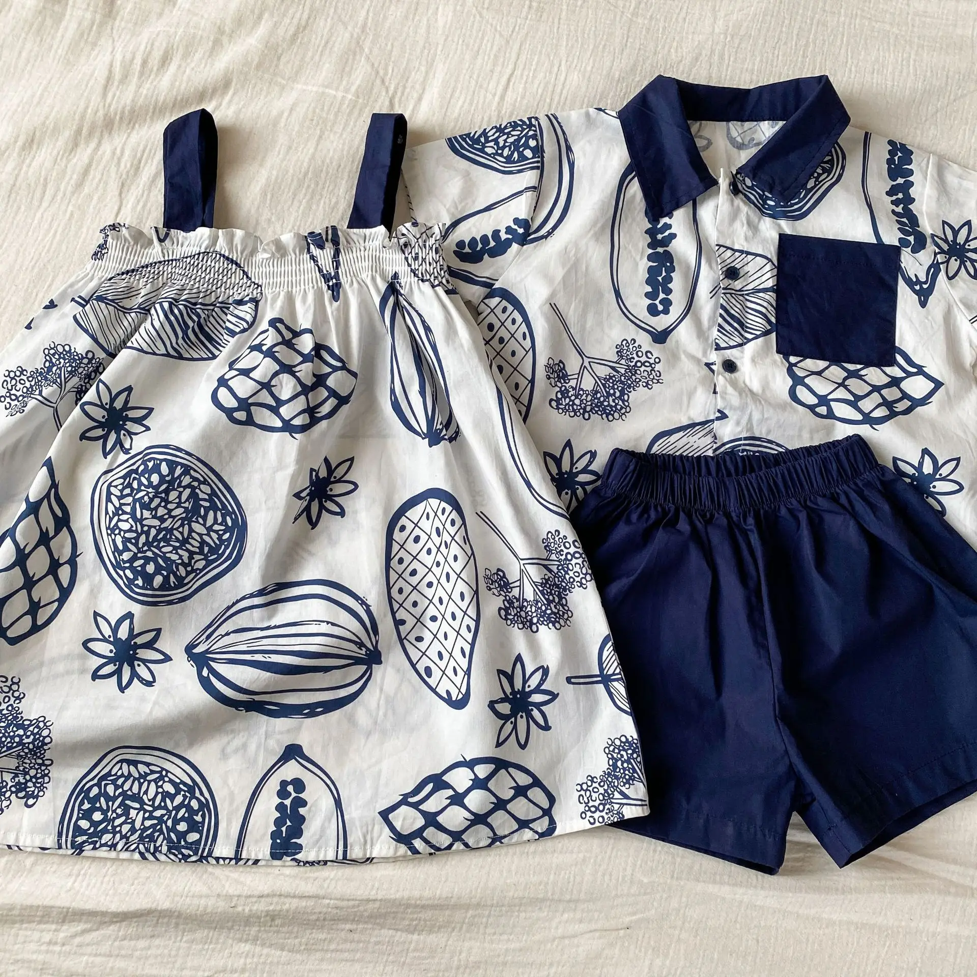 Comprar Nuevo conjunto de ropa de verano para niños, camisa de fruta de dibujos animados + pantalones cortos de Color sólido, vestido de tirantes para niñas