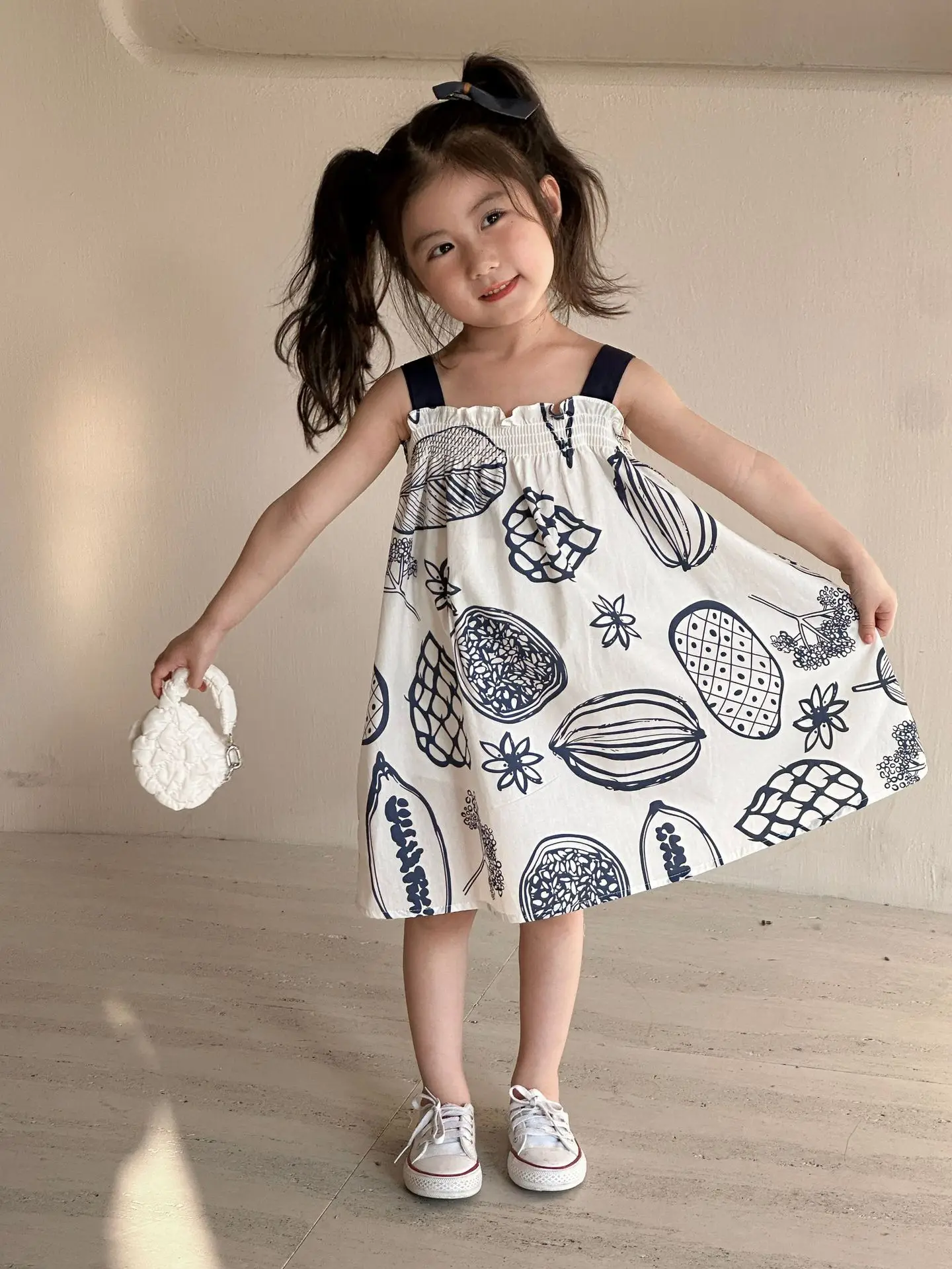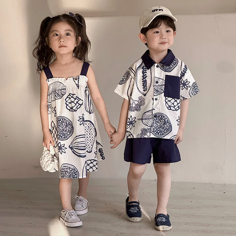 Comprar Nuevo conjunto de ropa de verano para niños, camisa de fruta de dibujos animados + pantalones cortos de Color sólido, vestido de tirantes para niñas