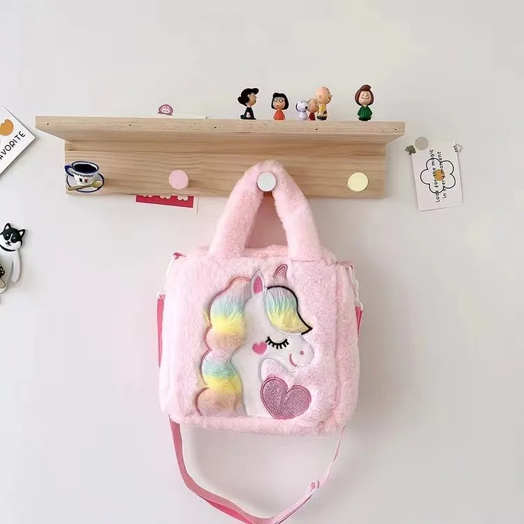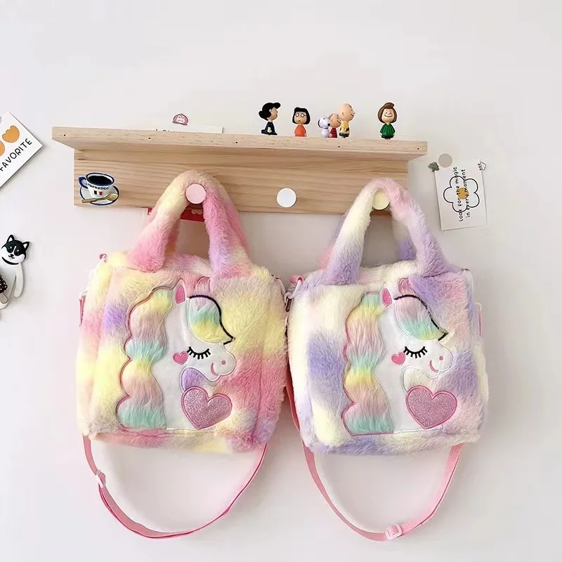 Nuevo diseño de dibujos animados colorido unicornio de peluche niños pequeños bolso lindo Animal relleno bolso de hombro para niño pequeño bolso suave y esponjoso