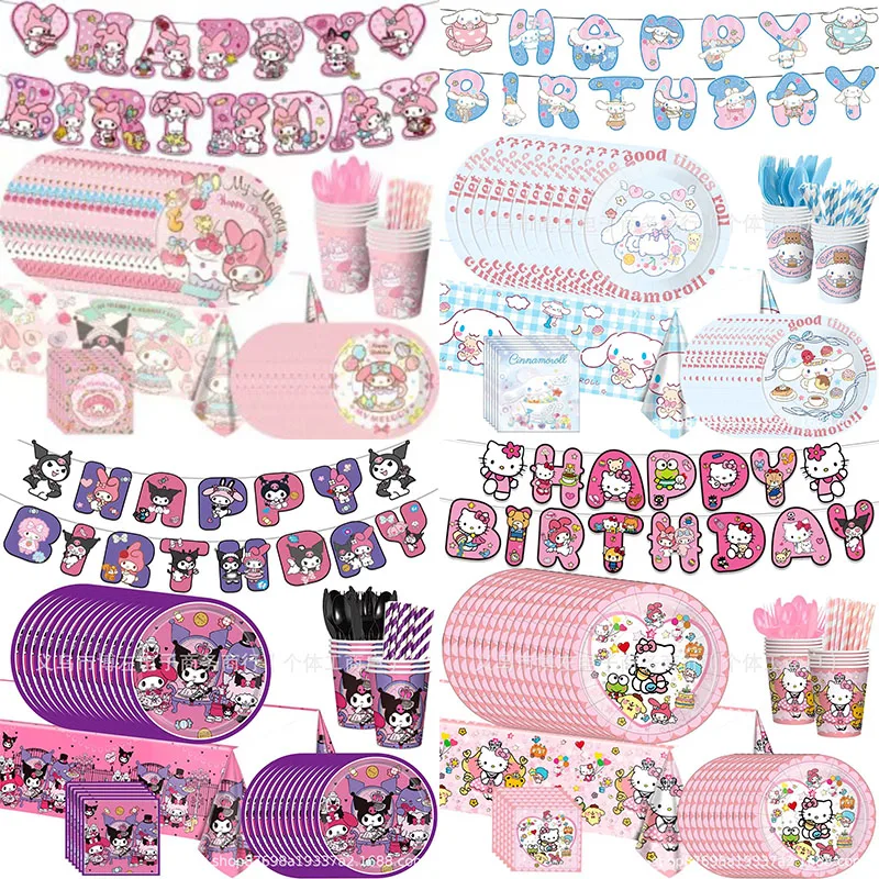 Comprar Nuevo Sanrio-Juego desechable con tema Melody Kuromi, decoración para fiesta de cumpleaños para niños, plato de papel de dibujos animados, servilleta, mantel, regalos