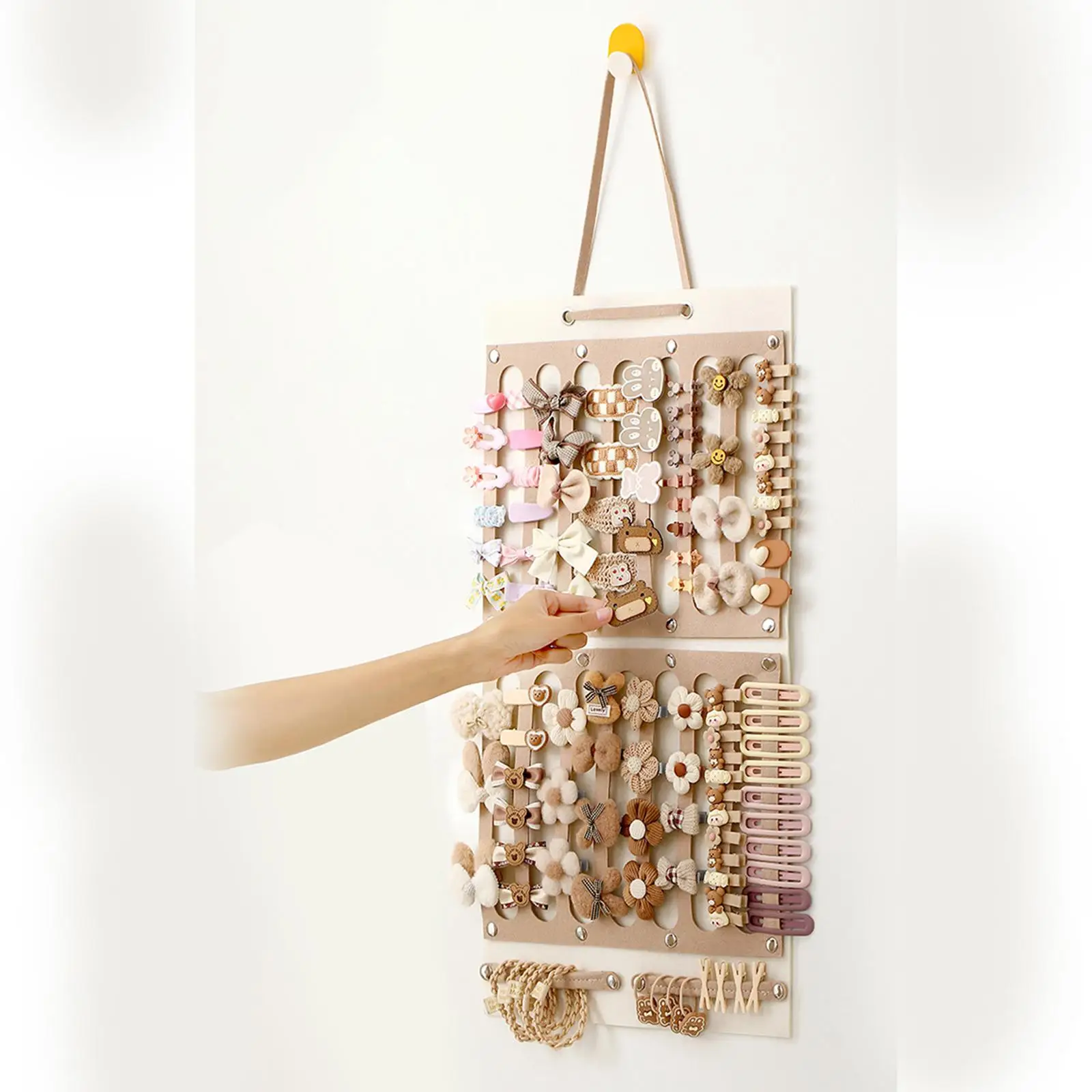 【Material Premium】: El organizador de lazos para el cabello con clip para colgar en la pared está hecho de material de poliéster, no es fácil de romper y deformar durante mucho tiempo.