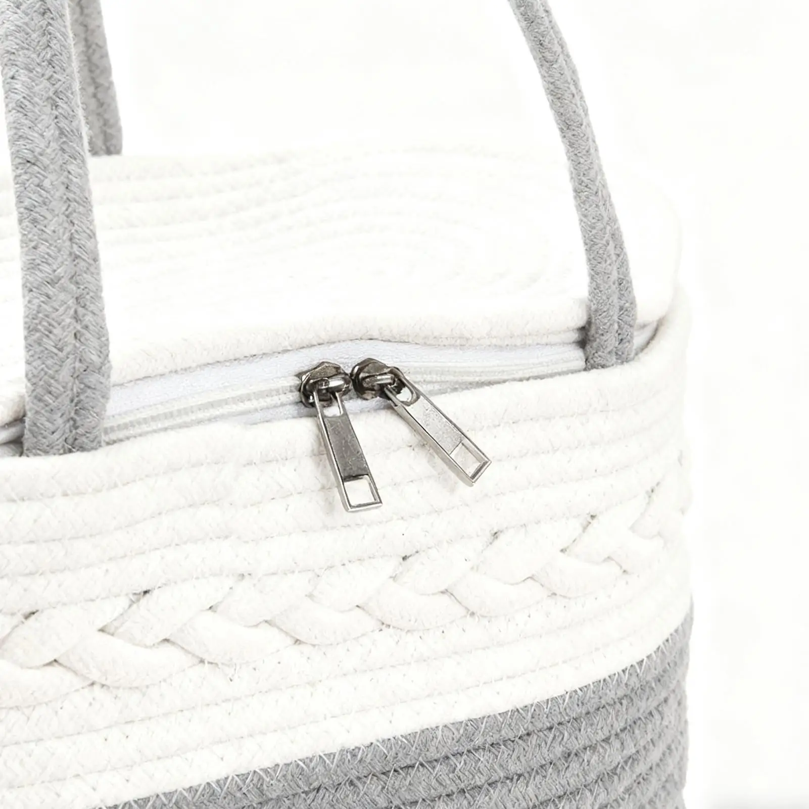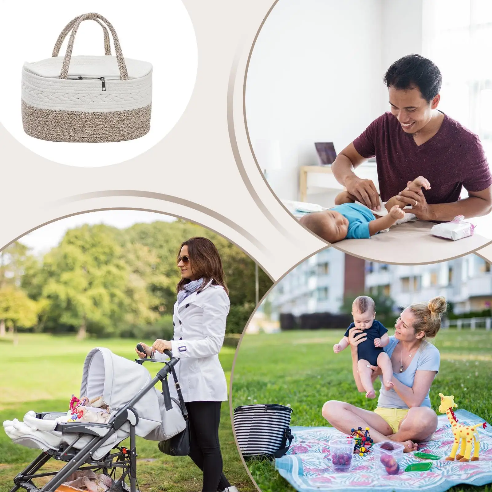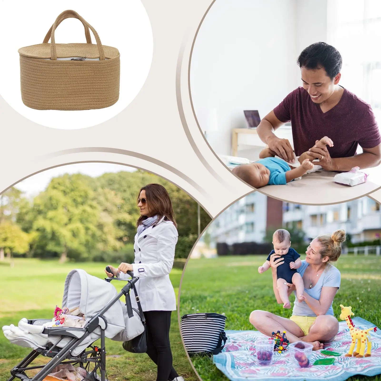3.Ampliamente aplicable: con un diseño de doble propósito, el organizador de pañales para bebés se transforma en un elegante bolso de mano para juguetes o artículos de viaje, ofreciendo a los padres una versatilidad confiable gracias a su resistente construcción de cuerda de algodón que respalda el uso diario y los requisitos de evolución.
