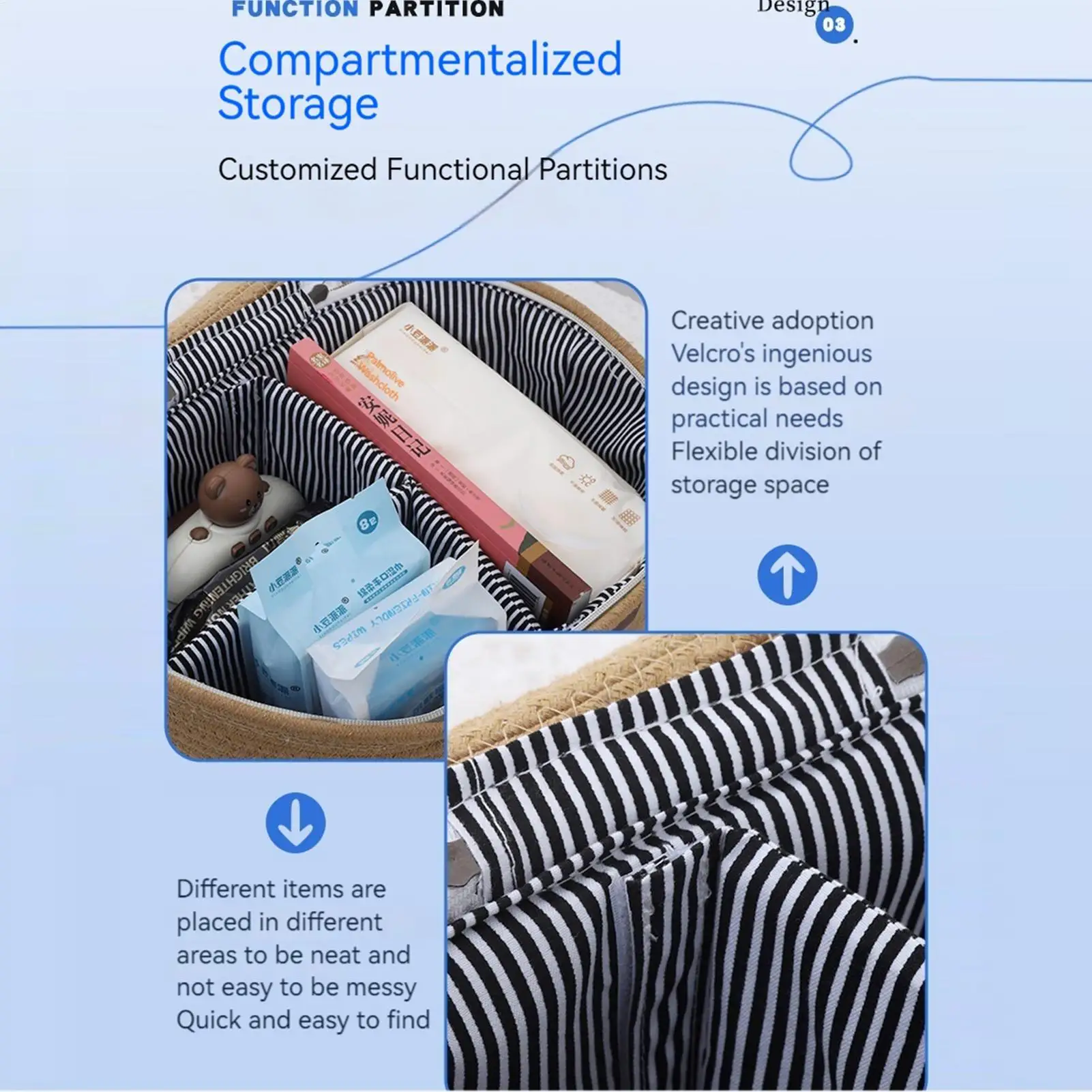 2.Compartimentos ajustables: el organizador de la cesta de pañales cuenta con divisores interiores extraíbles que permiten compartimentos ajustables para diferentes tamaños de pañales y artículos de primera necesidad del bebé, evitando el desorden y al mismo tiempo proporciona una organización de acceso rápido durante los cambios nocturnos o escenarios de viaje.