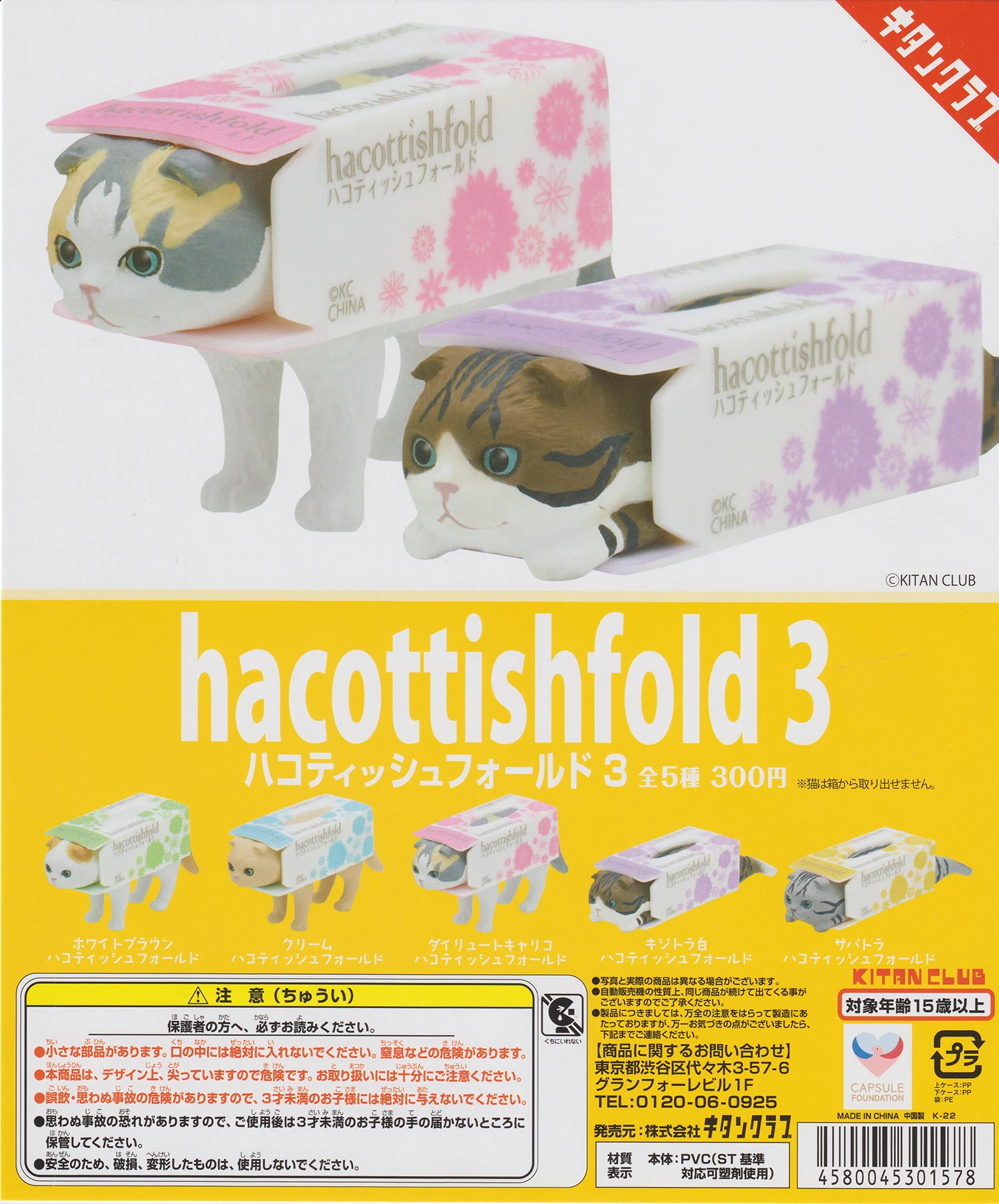 Nota: Pida 5 piezas al azar, le enviaremos al comprador un juego completo¡Vierta de pie ahora!"Plegado vikingo 3"¡El tan esperado tercer lanzamiento de la popular "Hakotish Fold Series"!¡El surrealista y adorable "Hako Tissue Fold", familiar para los amantes de los gatos, ha regresado con una nueva pose!Hay 5 tipos en la gama.El impacto de "Dilute Calico", "White Brown" y "Crema", cuyos pies perforan la caja de pañuelos después de jugar demasiado, ¡es enorme...!El diseño de la caja de pañuelos también se ha renovado y querrás recoger los cinco colores pastel.¡Mira la parte posterior de la caja de pañuelos de nuevo diseño!DATOScaja de pañuelo pliegue 3Producto en cápsulas5 tiposPlegado de tejido en caja blanco-marrónDoble de tejido de la caja Calico diluidapliegue de tejido de caja de cremaPliegue de tejido en caja blanca de faisãoSabatra Hakotish FoldTamaño: alrededor de 57 mmEditorial: Kitan ClubLanzamiento programado en diciembre de 2022. (reventa)