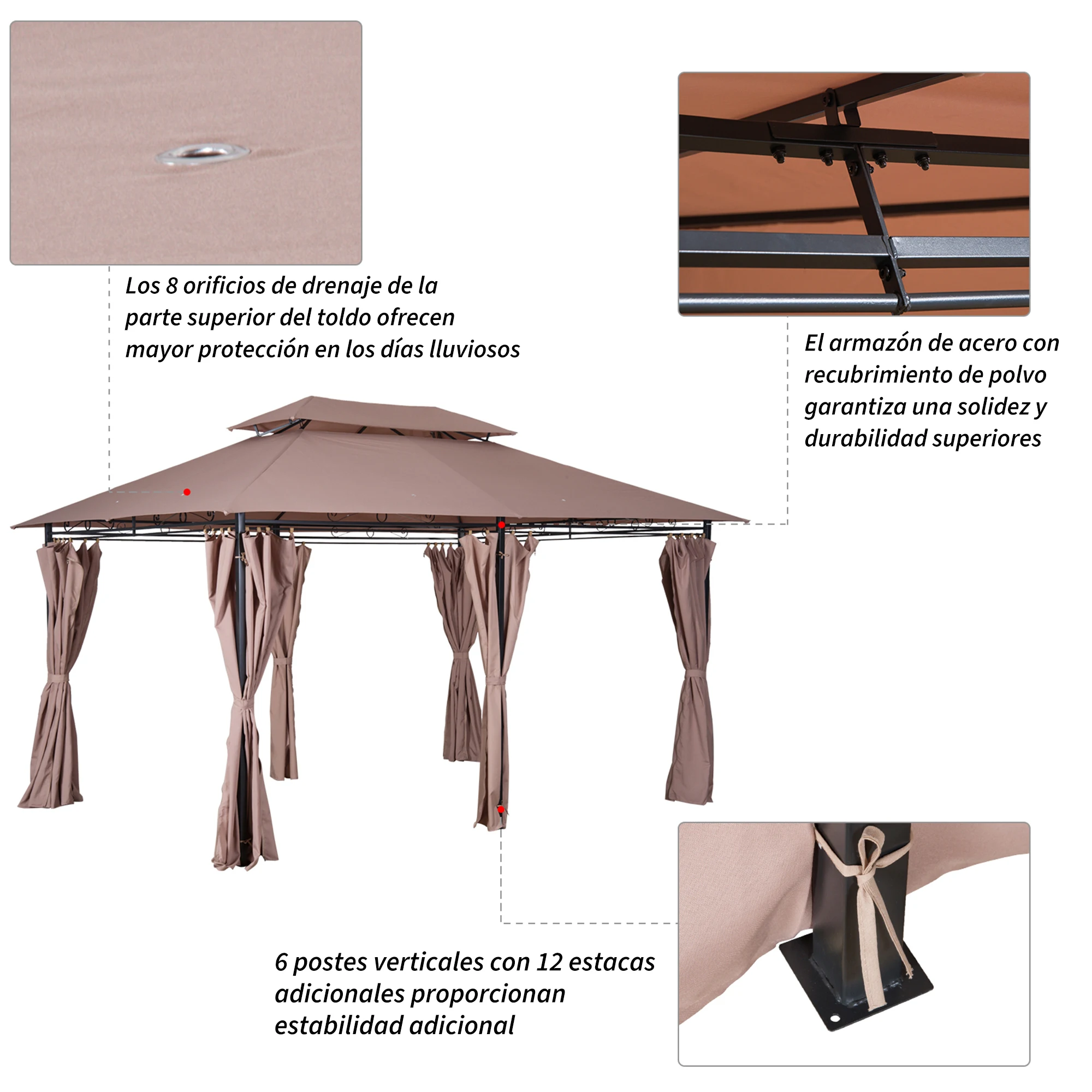 Renueva la apariencia de tu espacio exterior con esta elegante pérgola de Outsunny. Fabricada con estructura de acero con revestimiento en polvo y tejido de poliéster, este pabellón de jardín es resistente e ideal para un uso prolongado. Cuenta con un amplio espacio interior, ideal para recibir a amigos y familiares con la máxima comodidad. Además, tiene cortinas laterales que puedes usar si quieres más privacidad, o dejarlas atadas para una mayor ventilación.
