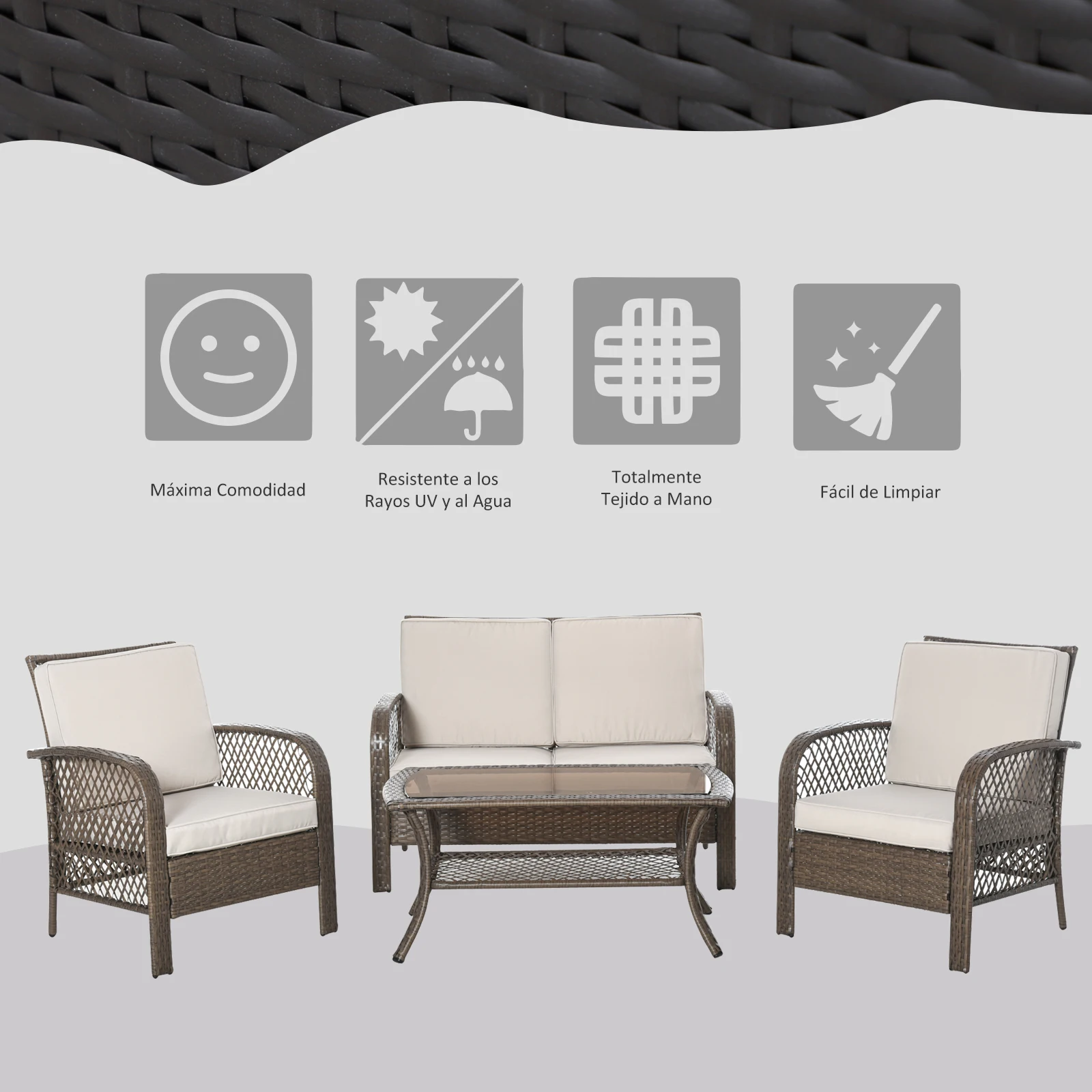 ¿Has visto este conjunto de ratán PE para jardín? Outsunny te ofrece este conjunto de 4 piezas compuesto por 2 sillones, un sofá doble y una mesa de centro para que puedas disfrutar de tu jardín, terraza, patio o cualquier otro espacio al aire libre mientras descansas, te relajas, o tomas un aperitivo en familia o con amigos alrededor de la fantástica mesa. Los asientos tienen cojines desenfundables y la encimera de la mesa es de cristal templado.
