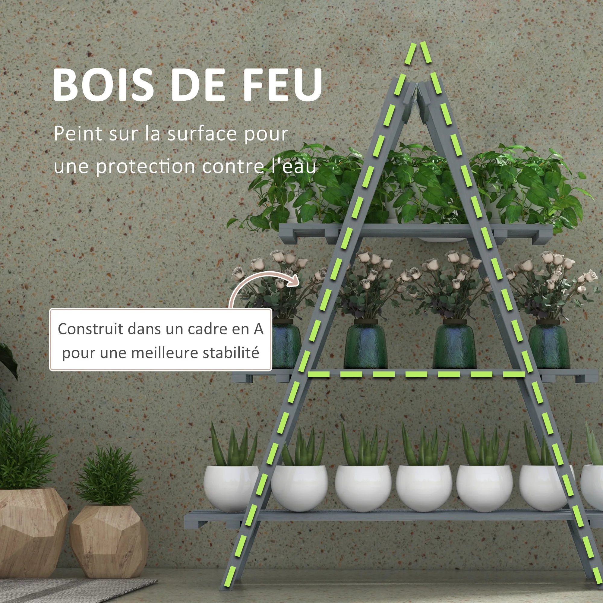 Exhibe tus plantas favoritas con este elegante soporte para macetas de Outsunny. Gracias a su diseño vertical de 3 niveles podrás asegurarte de que las plantas tienen mucho espacio para crecer, siendo ideal para aquellos espacios limitados. Fabricado en madera maciza de abeto con un marco en forma de A, este soporte para plantas ofrece resistencia y estabilidad. Añade un toque de elegancia y practicidad a la decoración de tu jardín, patio o balcón.