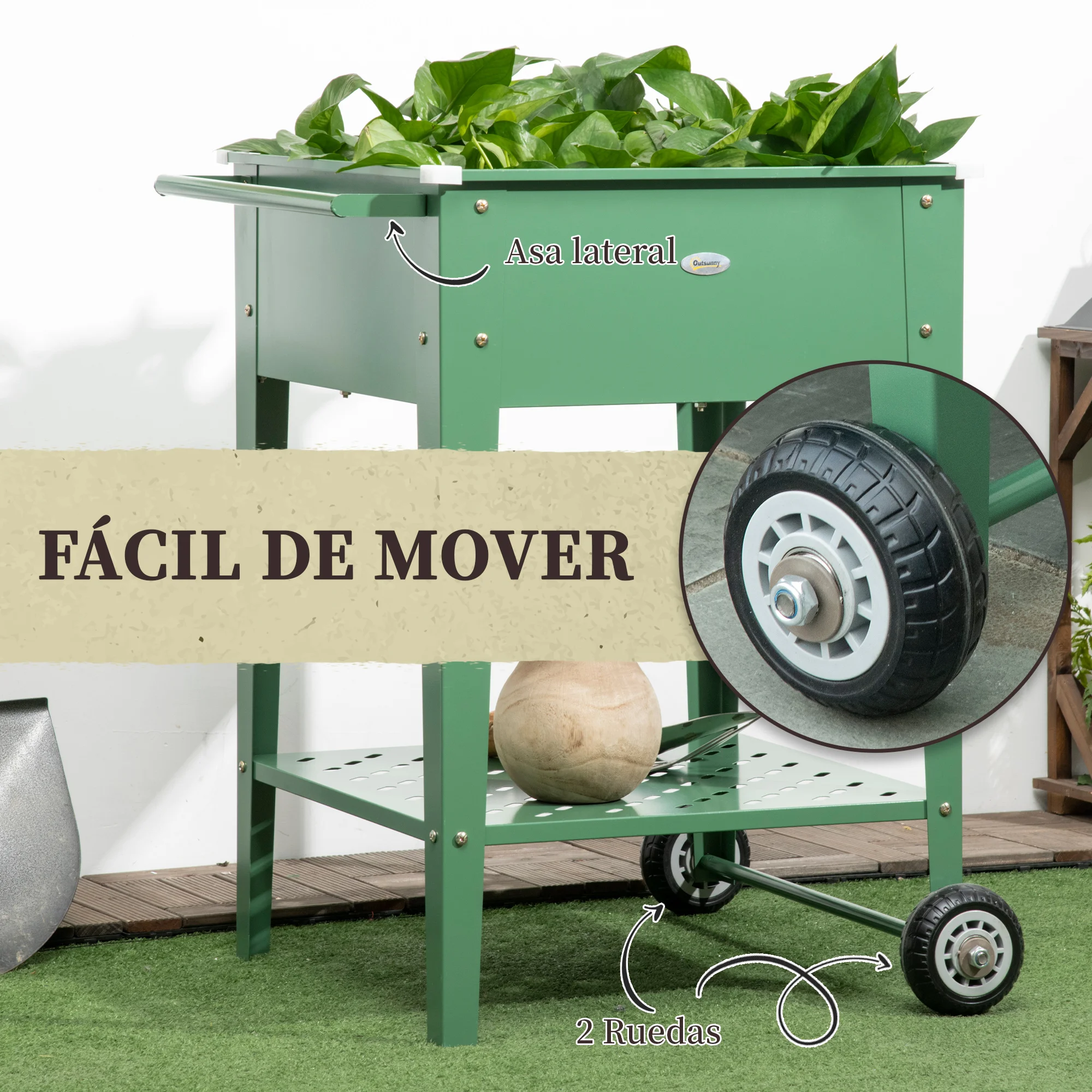 Outsunny Huerto Urbano Elevado con Ruedas Jardinera Exterior de Acero Galvanizado 64x55x79 cm con Estante y Asa Lateral para Cultivo Plantas Flores Verduras Verde
