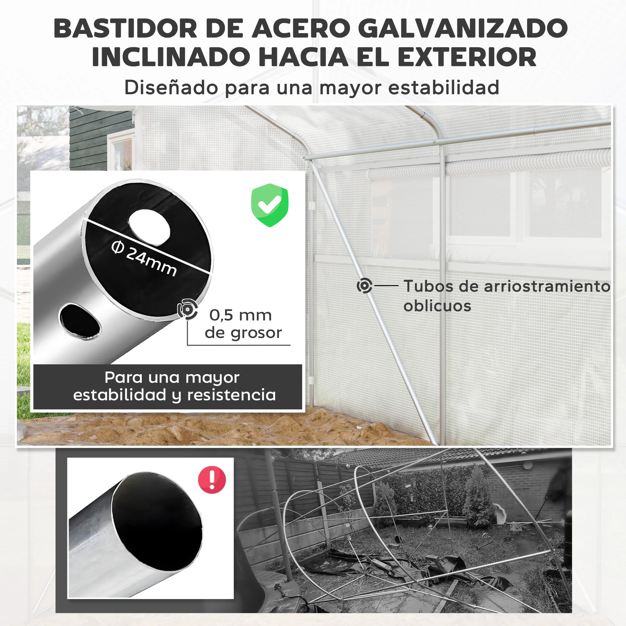 Características:● El invernadero de terraza tiene una estructura de acero galvanizado inclinada hacia afuera con refuerzos para mayor estabilidad
