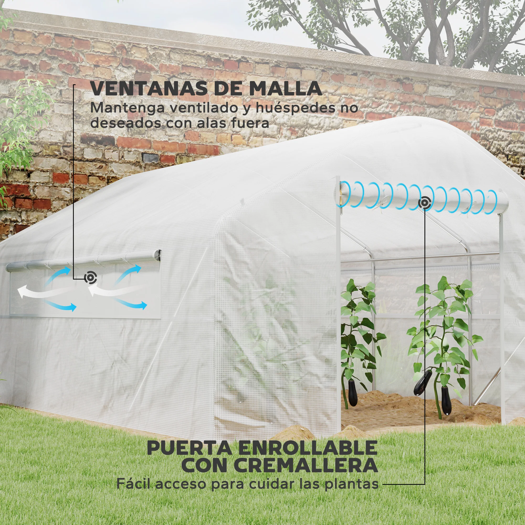 ● Este invernadero de jardín cuenta con una puerta enrollable y grandes ventanas para un fácil acceso y mejor ventilación