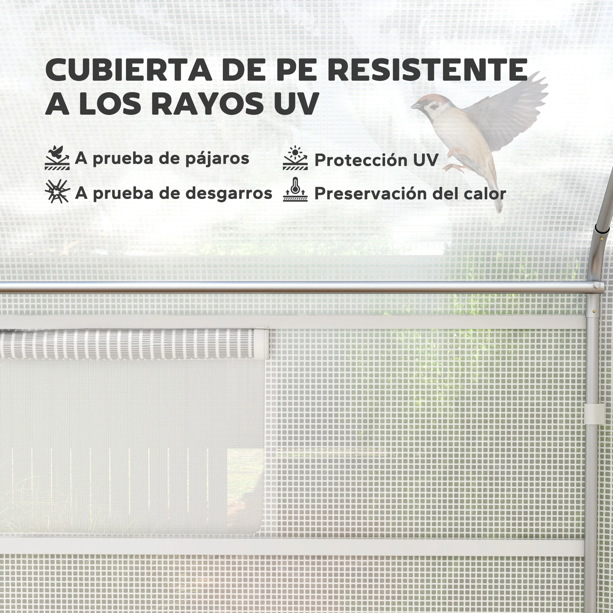 ● La cubierta de PE de 140 g/m² permite el paso de un 85% de la luz solar y es resistente a los rayos UV