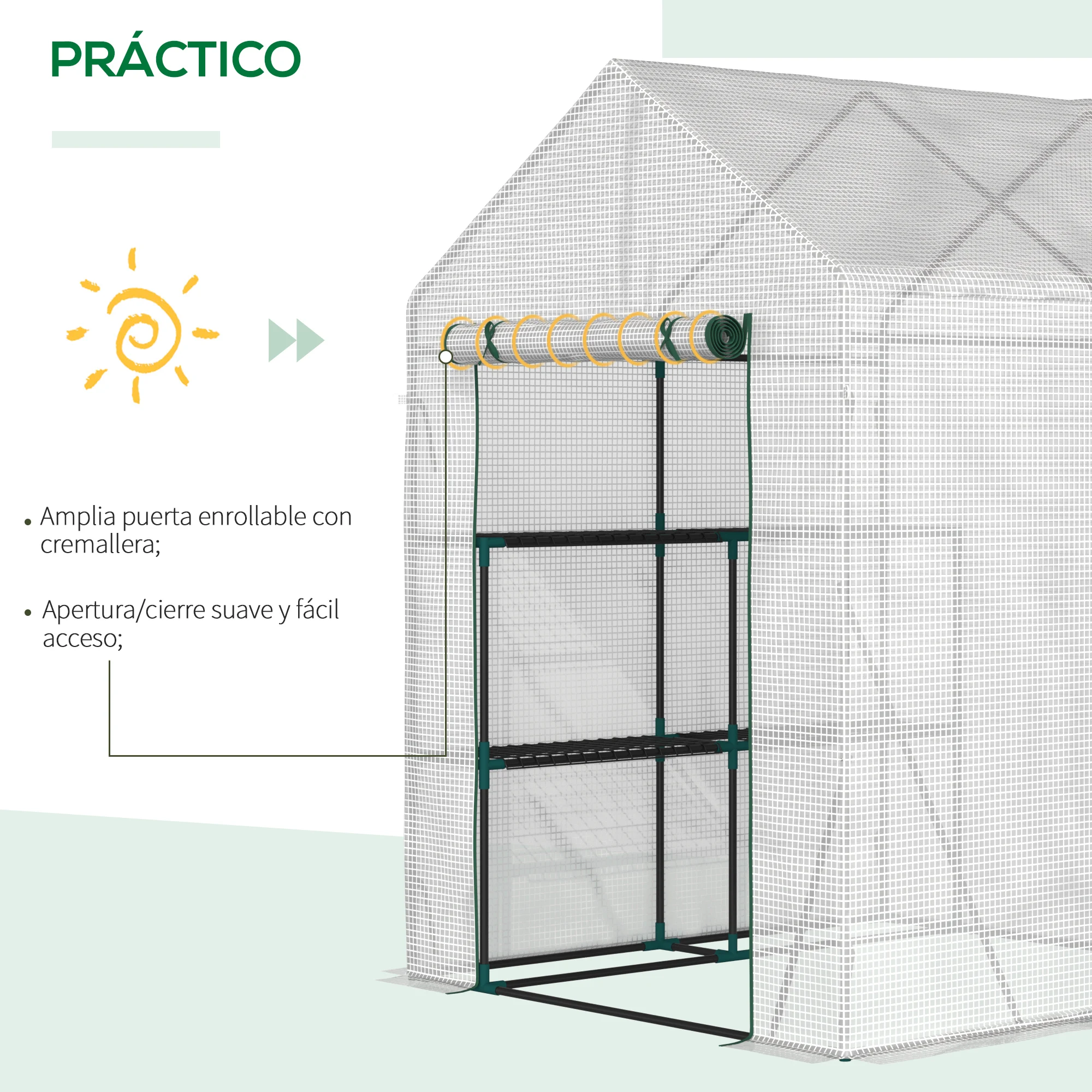 ● Amplia puerta enrollable con cremallera para facilitar el acceso al interior