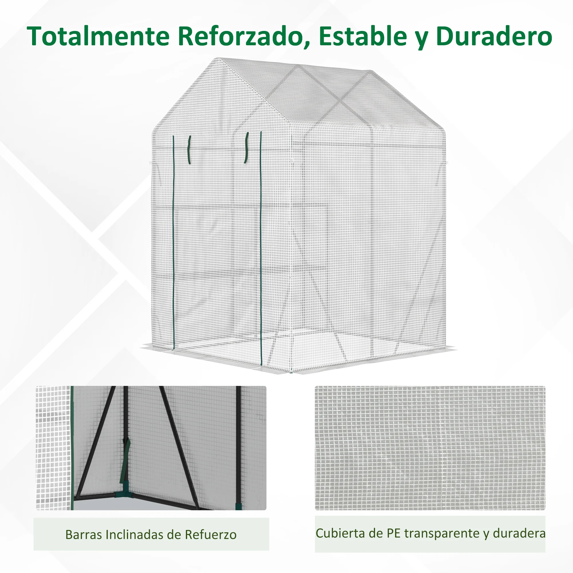 ¿Quieres cultivar plantas o verduras en tu jardín o terraza? ¿Te preocupa que el mal tiempo dañe tus cultivos? La solución está a tu alcance con este invernadero de Outsunny. El marco de acero hace que la estructura sea estable y la cubierta de PE retiene el calor y protege contra el viento y la lluvia, entre otros. Este invernadero de exterior está equipado con una puerta enrollable para facilitar la entrada y salida y cuenta con estantes interiores para aprovechar al máximo el espacio.