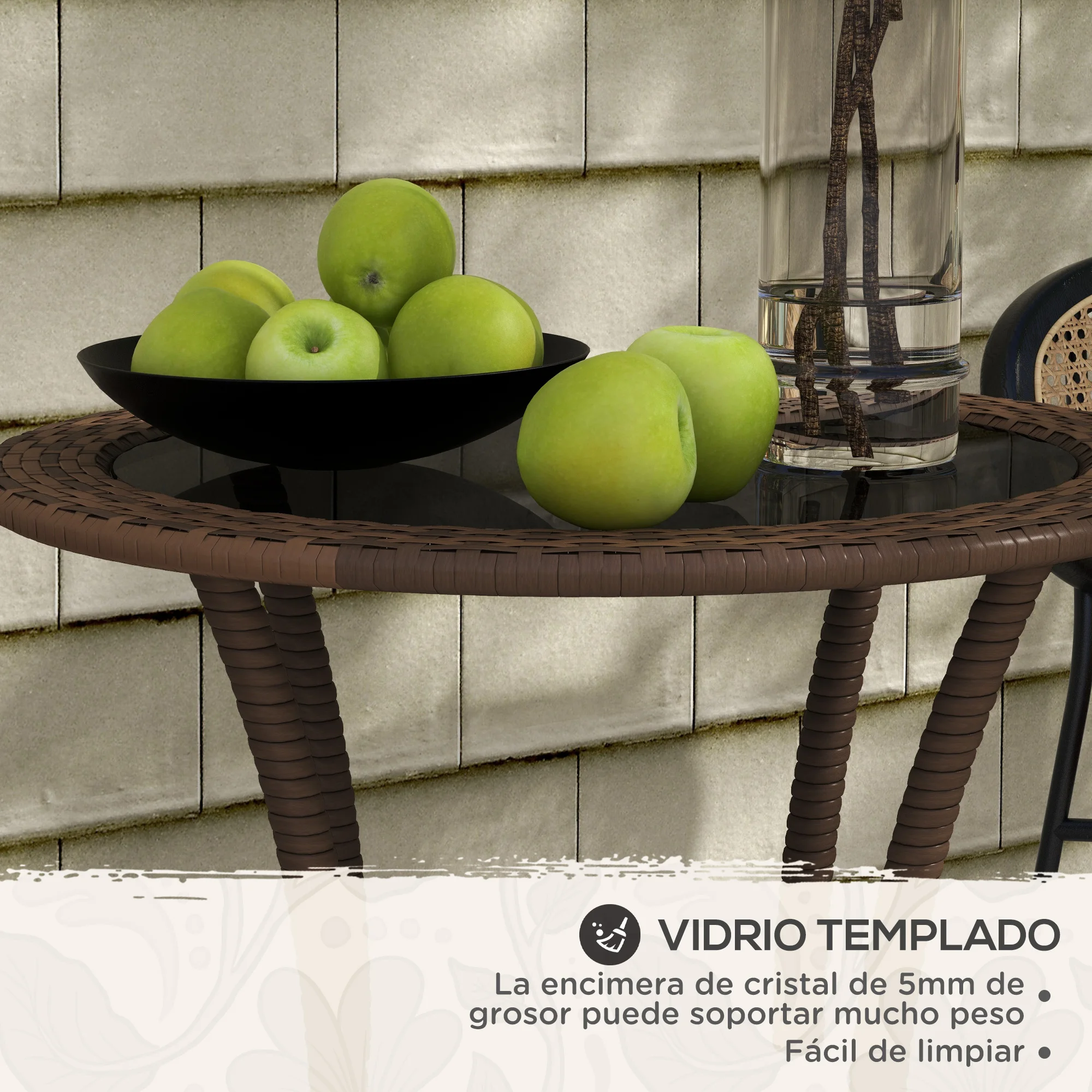 Especificaciones: ● Color: marrón, negro ● Material: acero galvanizado, ratán PE, vidrio templado ● Medidas totales: Ø64x71 cm (DxAL) ● Medidas del estante: Ø33 cm ● Altura del estante: 40 cm ● Carga máxima: 50 kg ● Referencia: 867-162V00BN