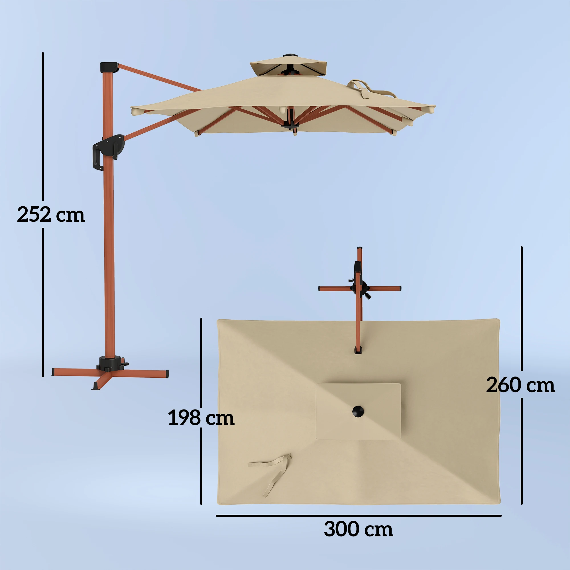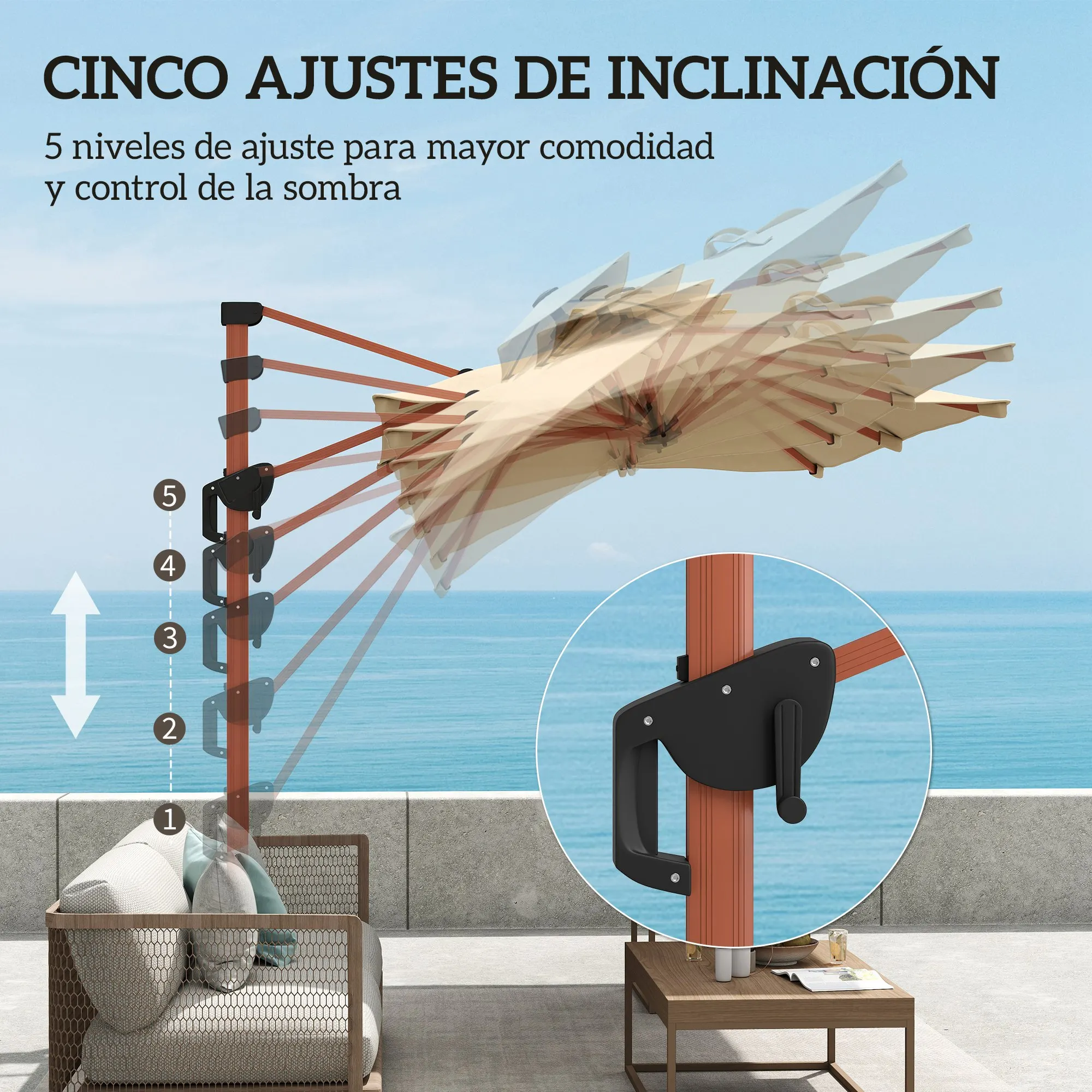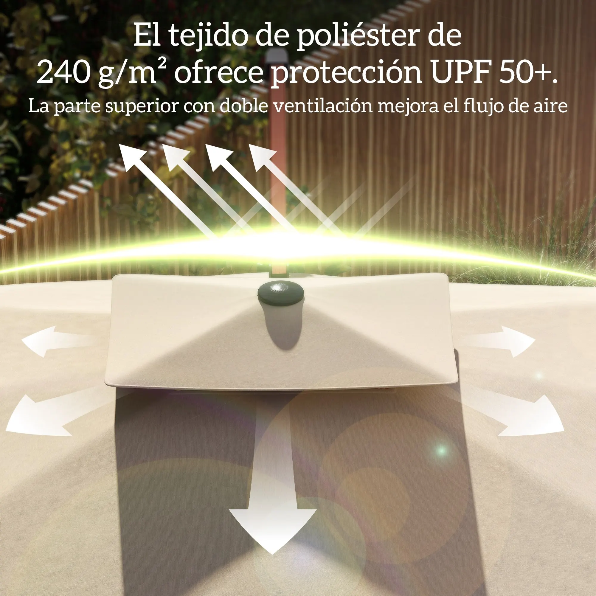 Disfruta de tu jardín con este parasol excéntrico giratorio de Outsunny, fabricado en poliéster de 240 g/m² con cobertura PA, que garantiza protección solar UPF50+ y resistencia al agua. El diseño con techo doble favorece una mejor ventilación, manteniendo el ambiente fresco. La manivela permite ajustar fácilmente la inclinación en cinco posiciones diferentes. Además, la base incluida de esta sombrilla de jardín gira 360°, permitiéndote ajustar la sombra según la posición del sol durante el día.