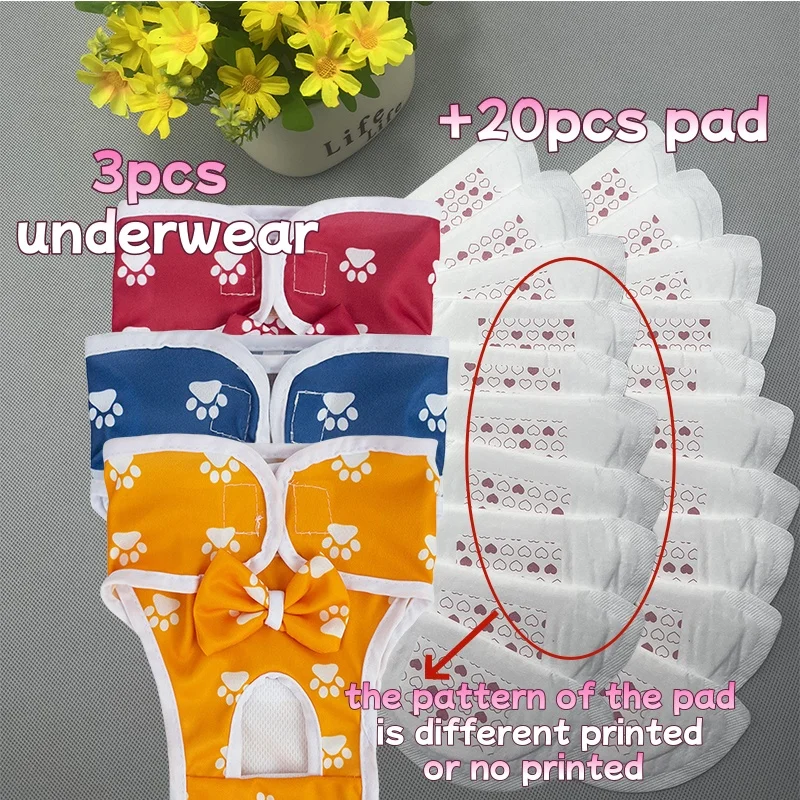Pañales para perros, pantalones + 20 piezas almohadilla fisiológica con estampado de huellas, pantalones cortos para cachorros, ropa interior lavable, S-XL para mujer, 3 uds.