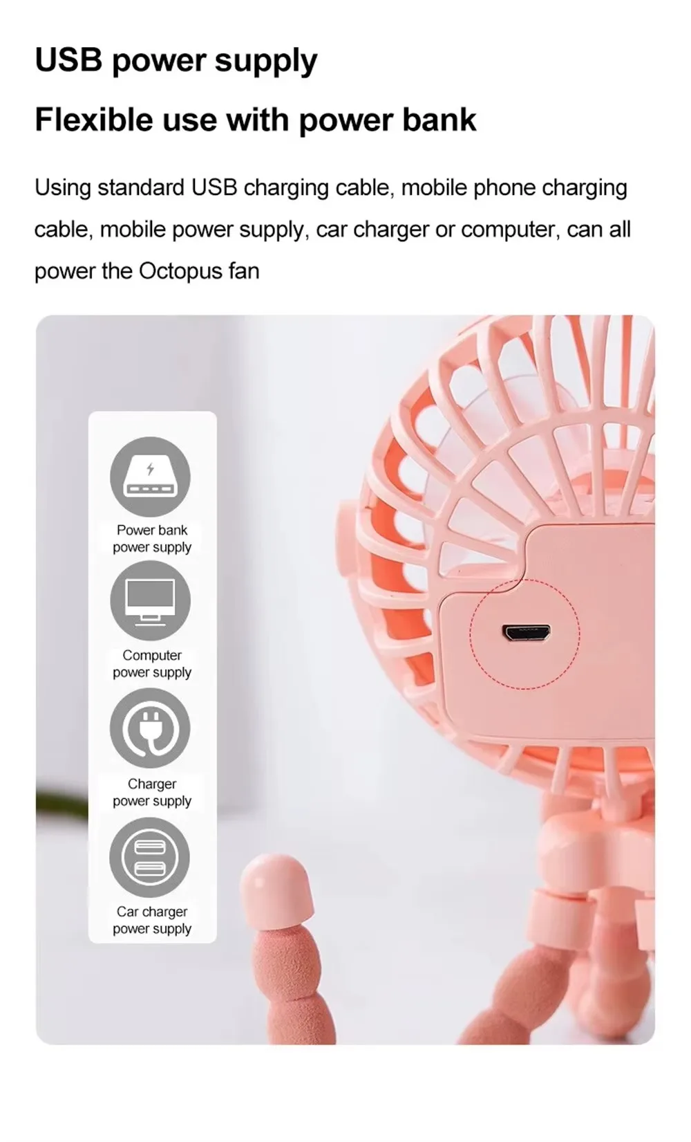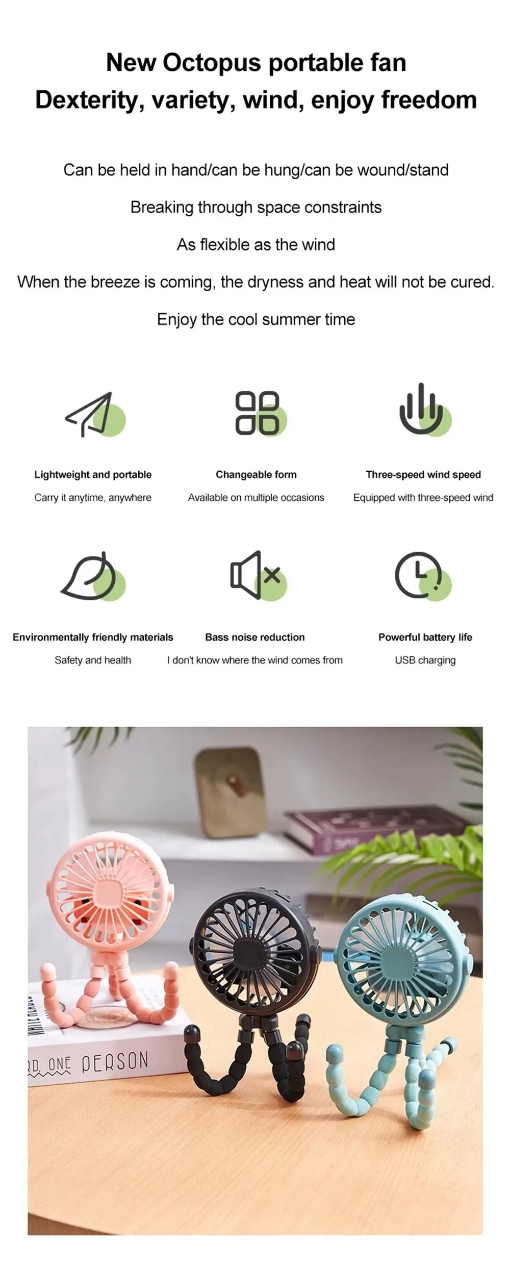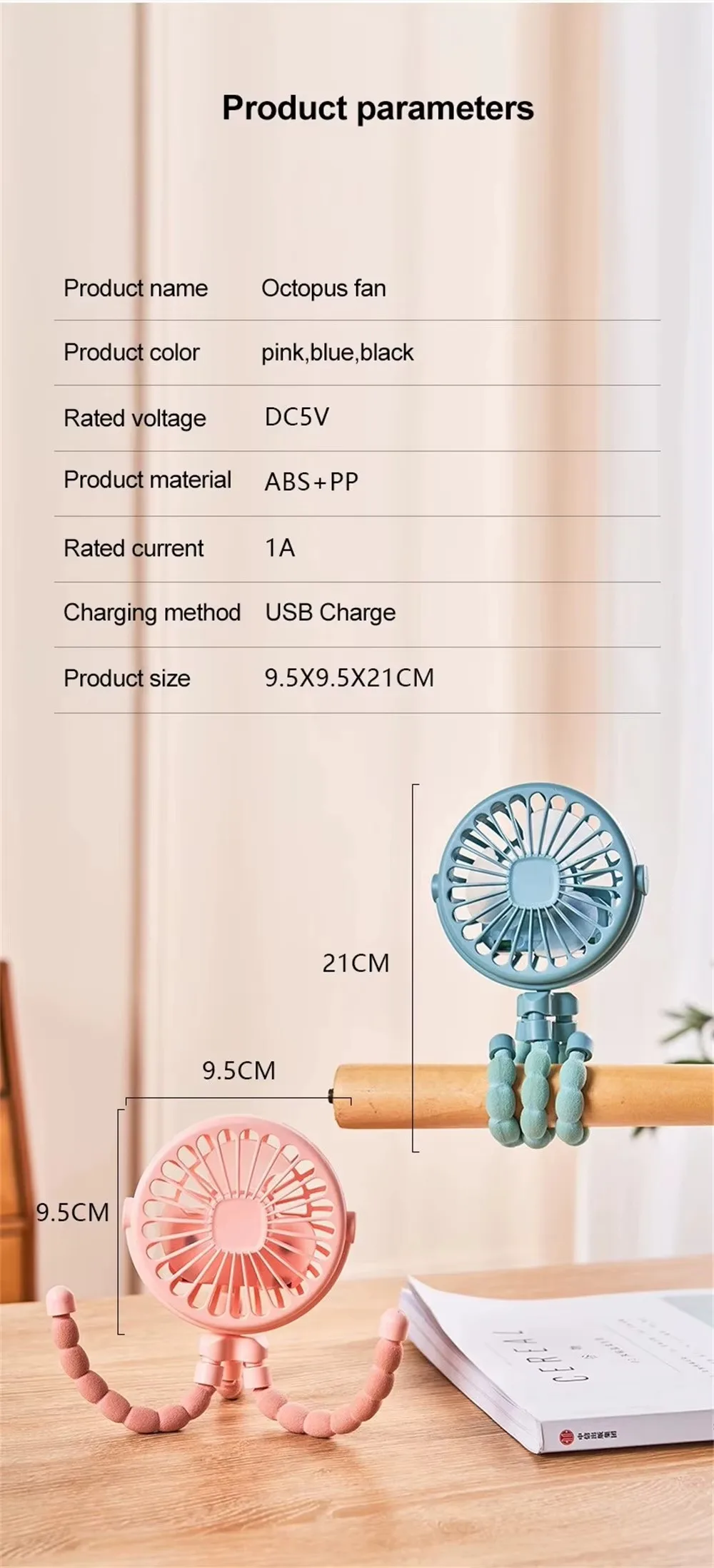 PANGDUBE-ventilador de pulpo recargable por USB, Mini ventilador de mano para cochecito de bebé, cuna, escritorio, Camping, viaje, ventilador portátil, soporte para teléfono