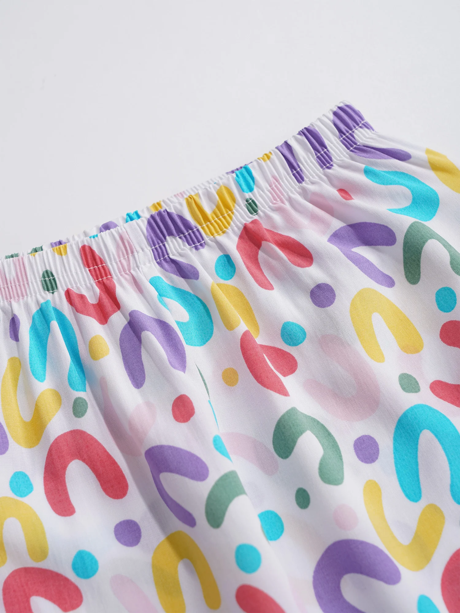 Los bombachos coloridos con estampado bohemio hacen que las niñas se vean activas y animadas.