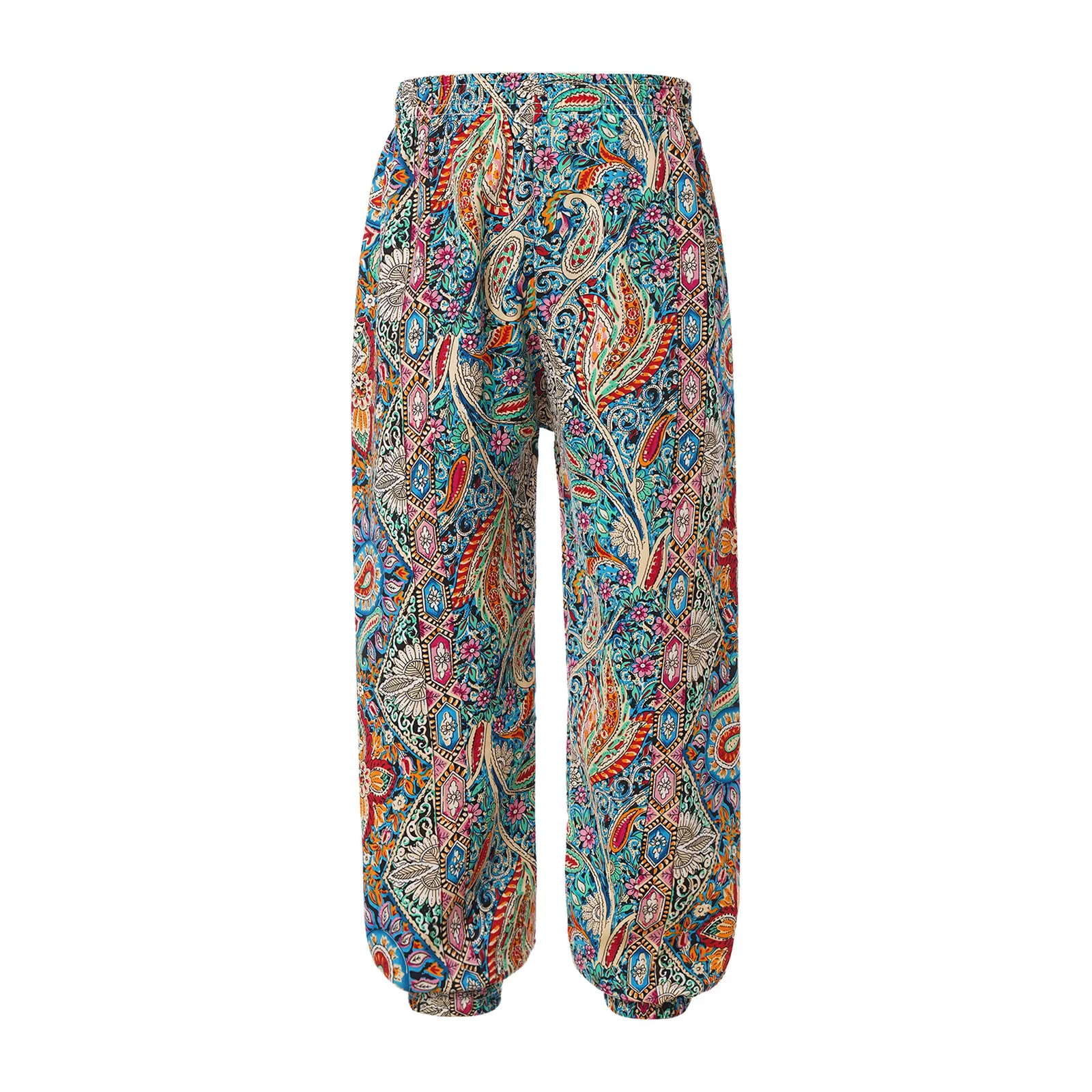 Comprar Pantalones casuales con cintura elástica para niñas, bombachos coloridos con estampado bohemio para baile, trotar, ropa de playa, ropa de casa, vacaciones y viaje