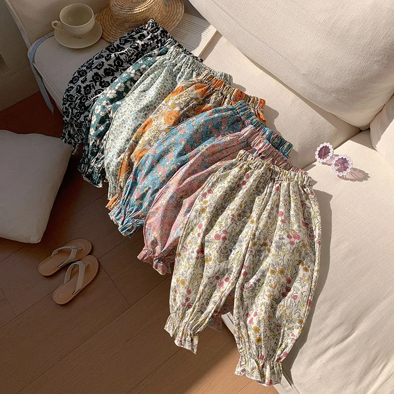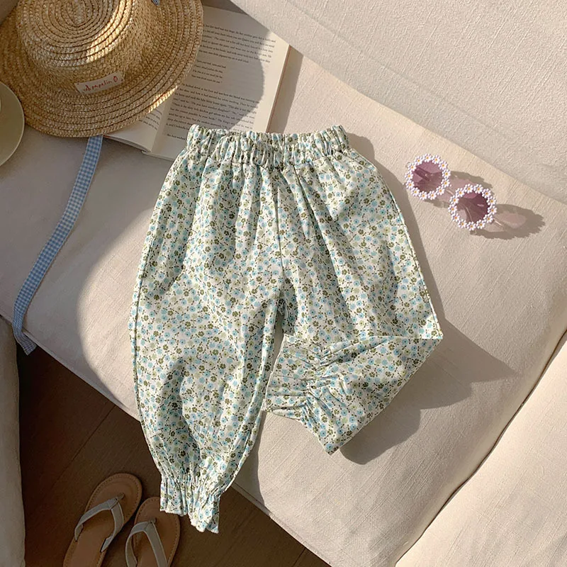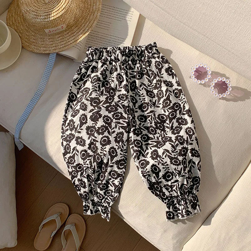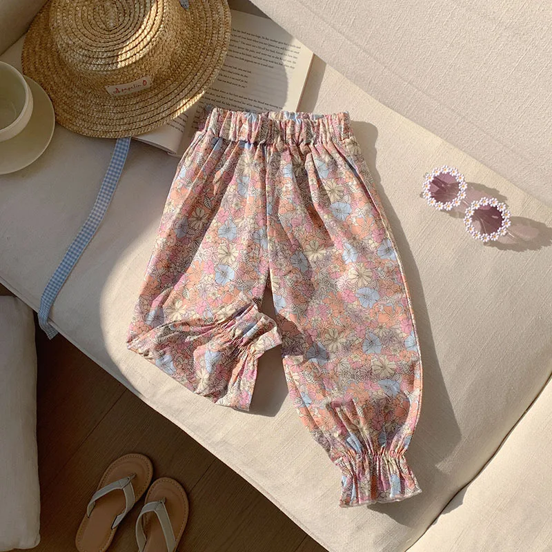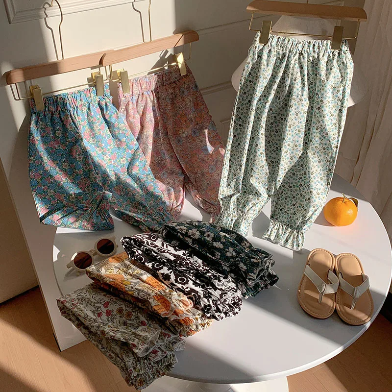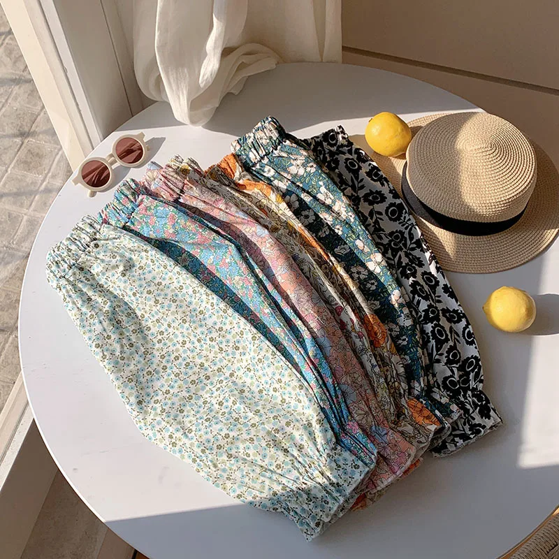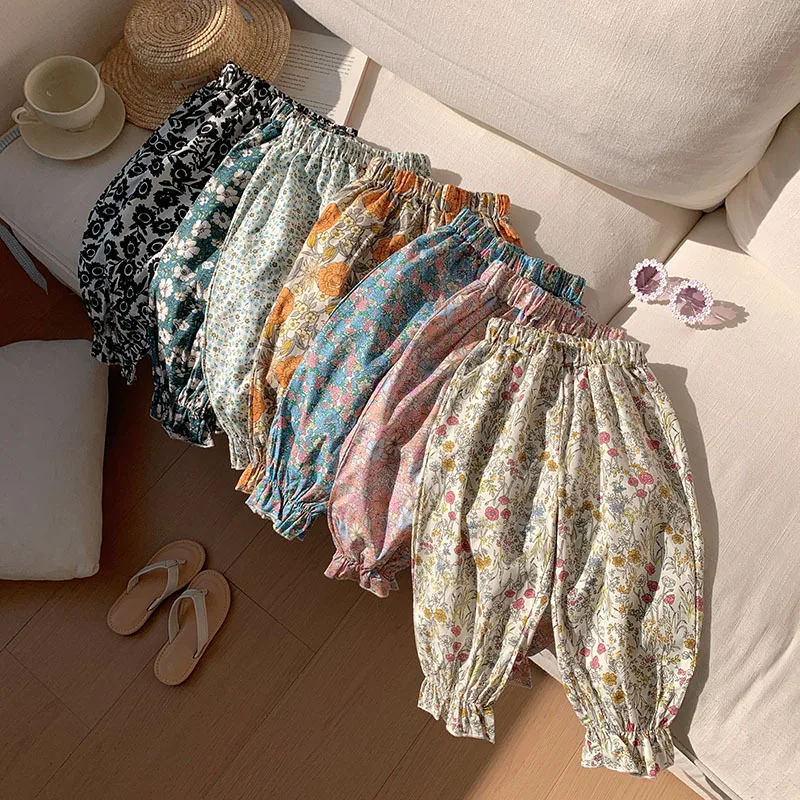Comprar Pantalones dulces de verano con flores para niñas, pantalones con pies retráctiles con estampado informal para niños, pantalones de playa transpirables frescos para niñas