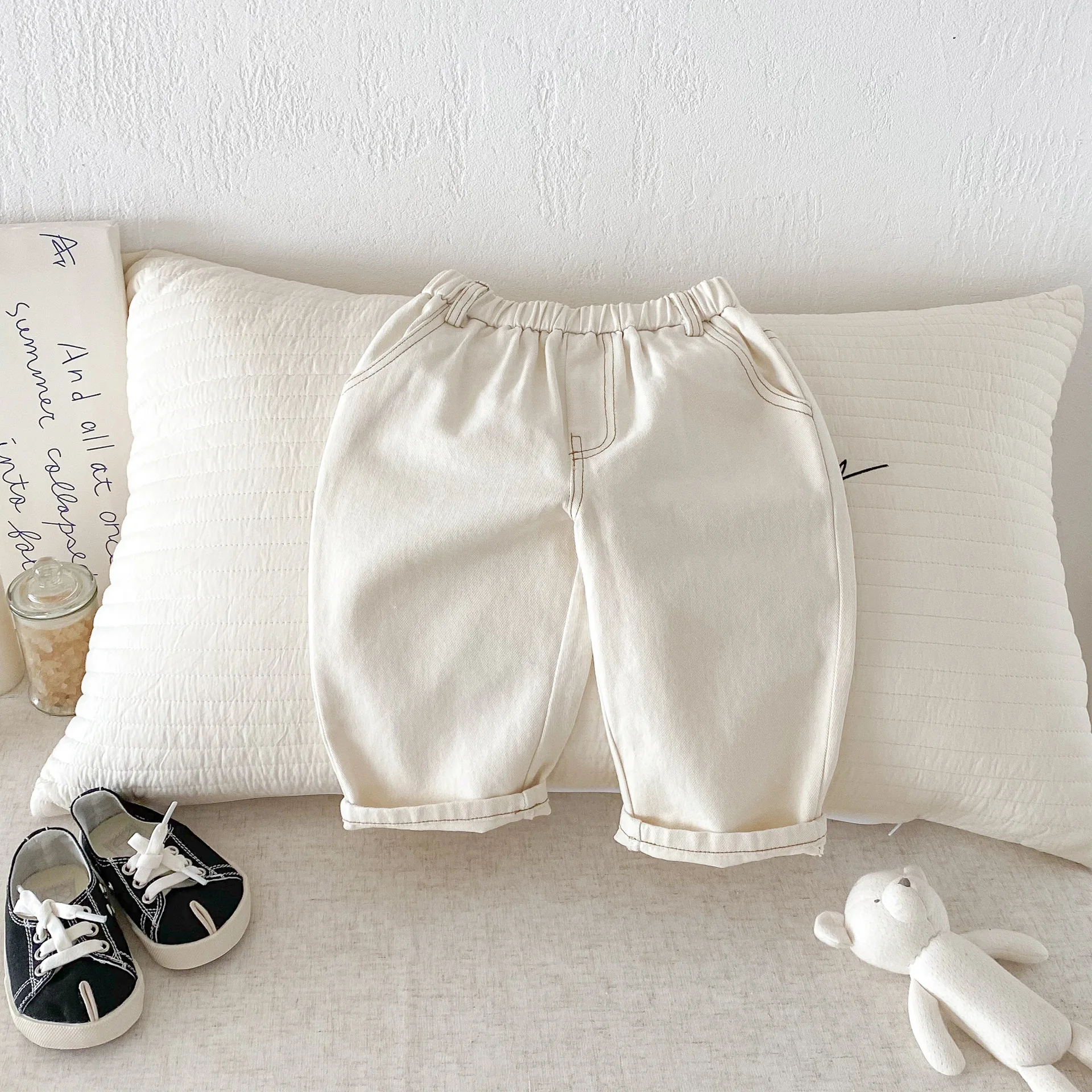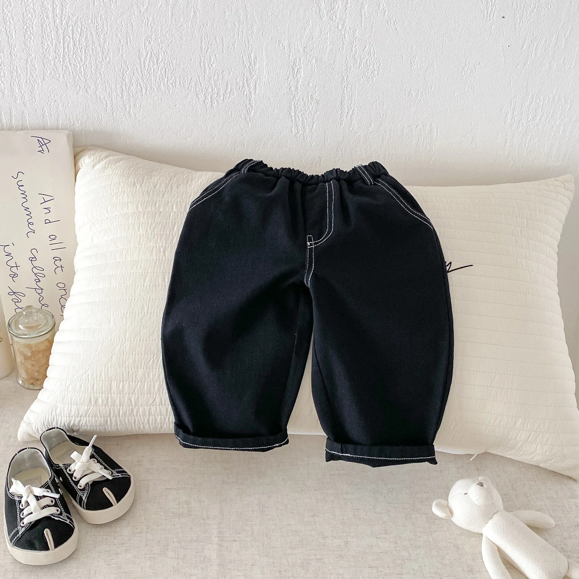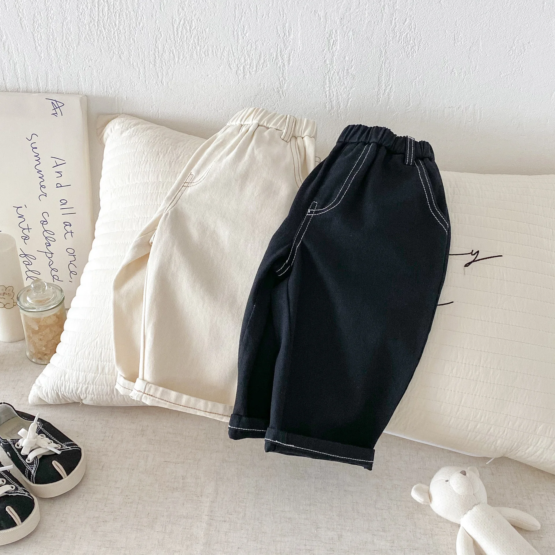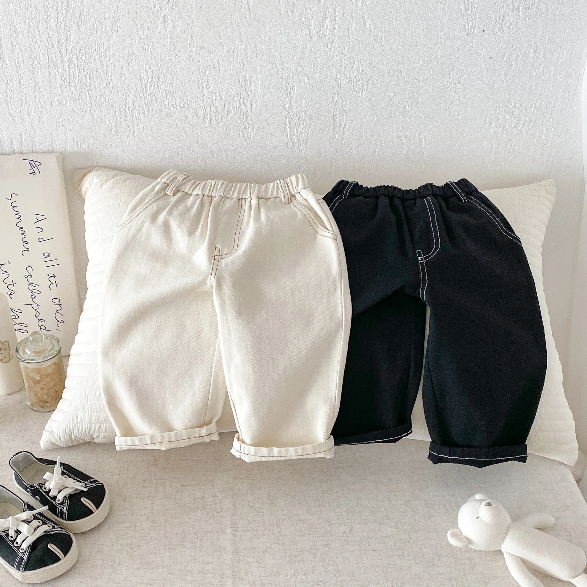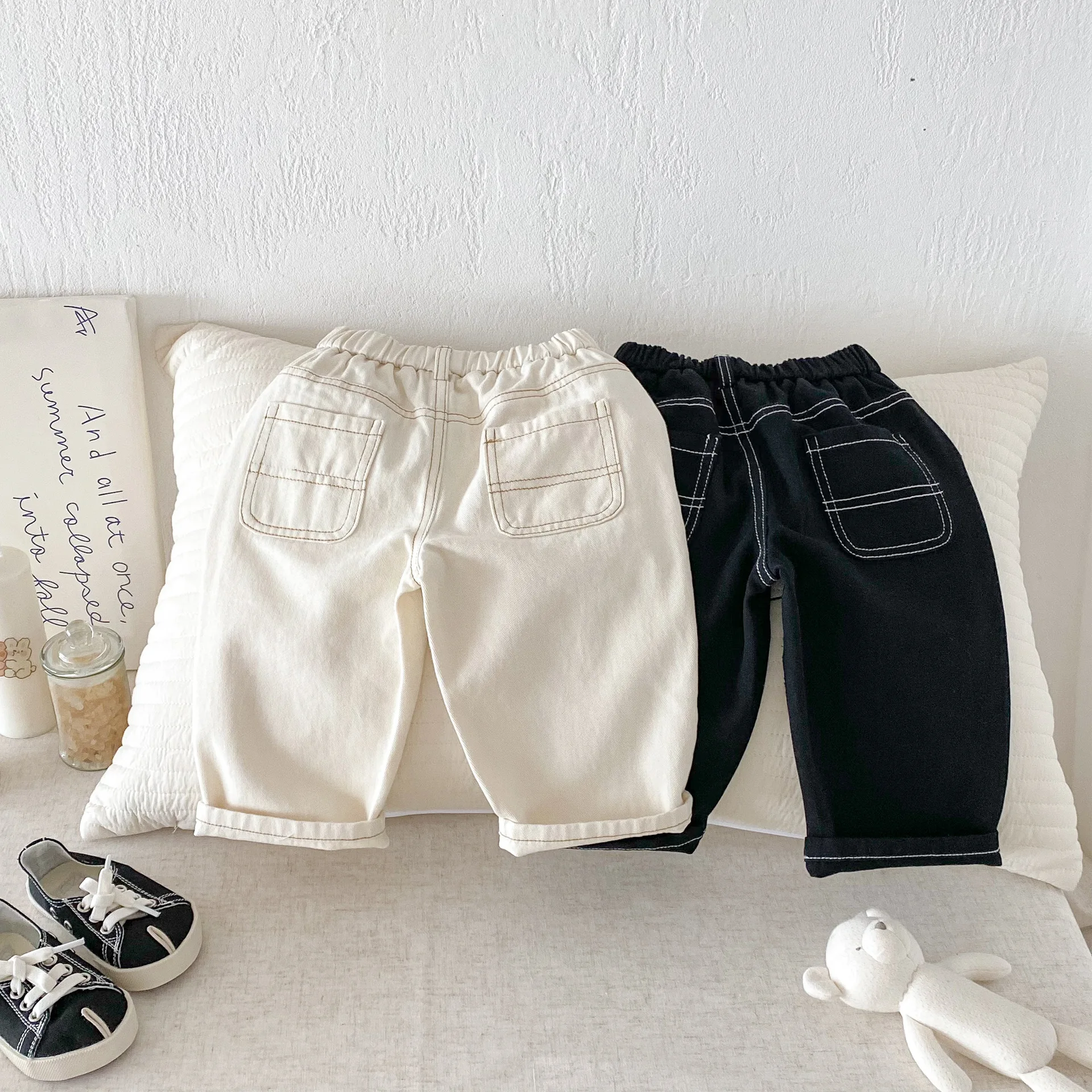 Son pantalones casuales de color sólido de estilo coreano, adecuados tanto para niños como para niñas.El diseño simple pero moderno de color sólido los hace fáciles de combinar con varias blusas, como camisetas, suéteres, etc.Los pantalones se pueden utilizar como jeans para primavera y otoño.Su diseño versátil permite que su hijo luzca a la moda en diferentes ocasiones, desde salidas diarias hasta reuniones familiares.