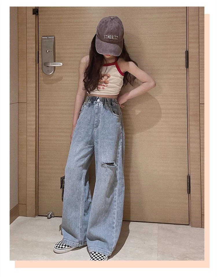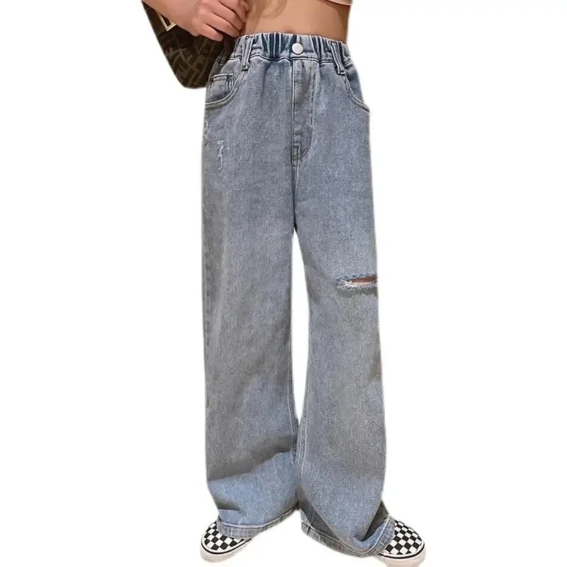 Comprar Pantalones vaqueros de color claro para niñas, Pantalones rectos de pierna ancha, medianos y grandes, a la moda, primavera y otoño, nuevos