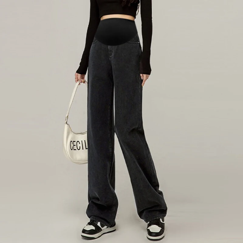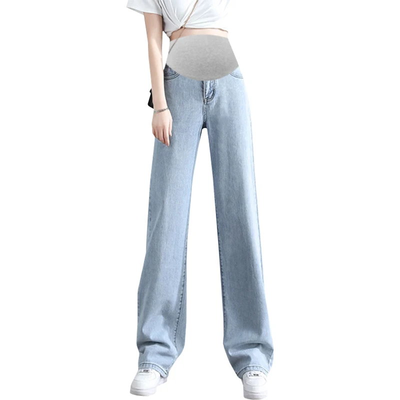 Comprar Pantalones vaqueros finos de piernas anchas para maternidad, cintura alta, hasta el suelo, sueltos, informales, para mujer embarazada, pantalones vaqueros largos para embarazo
